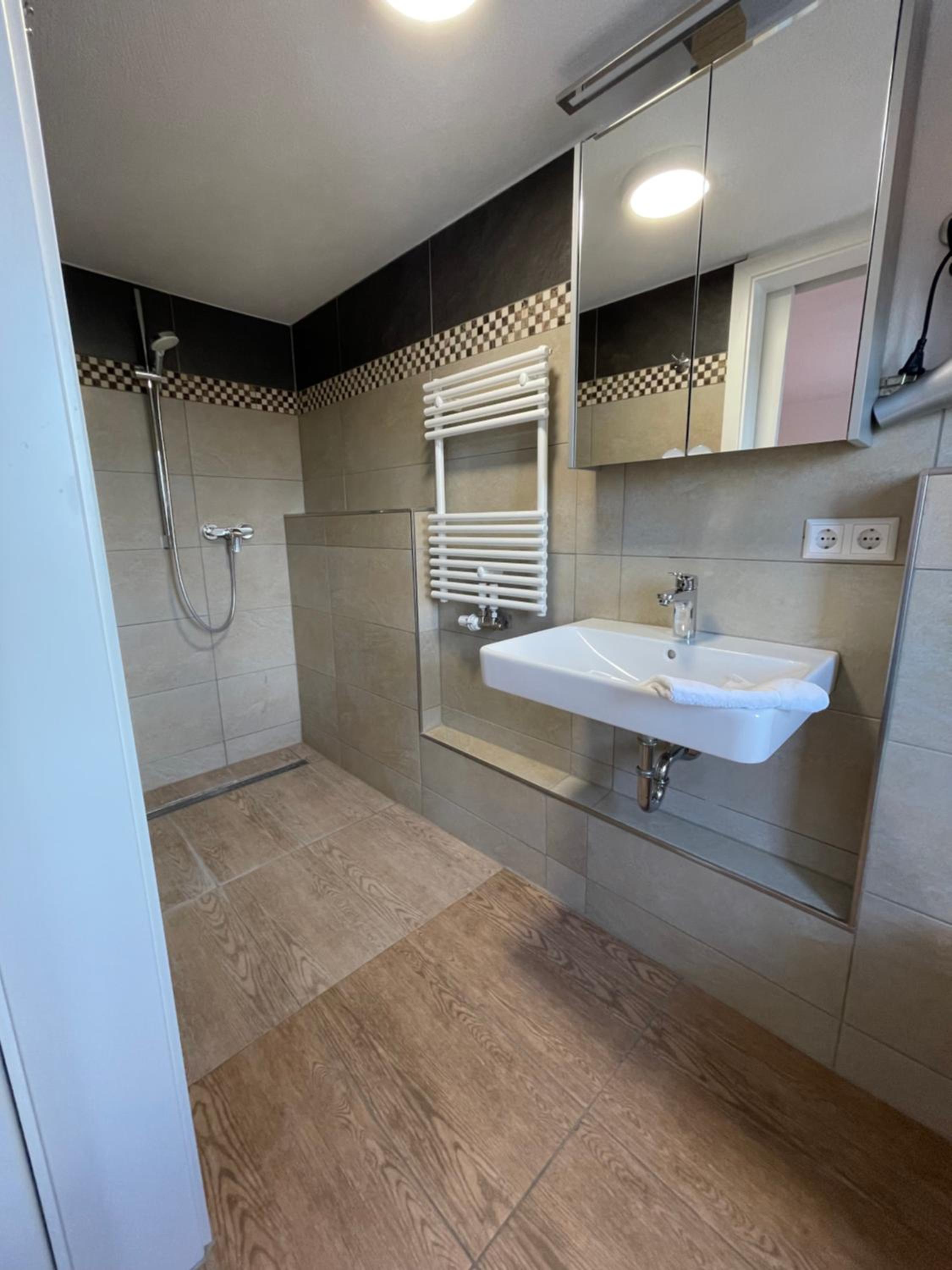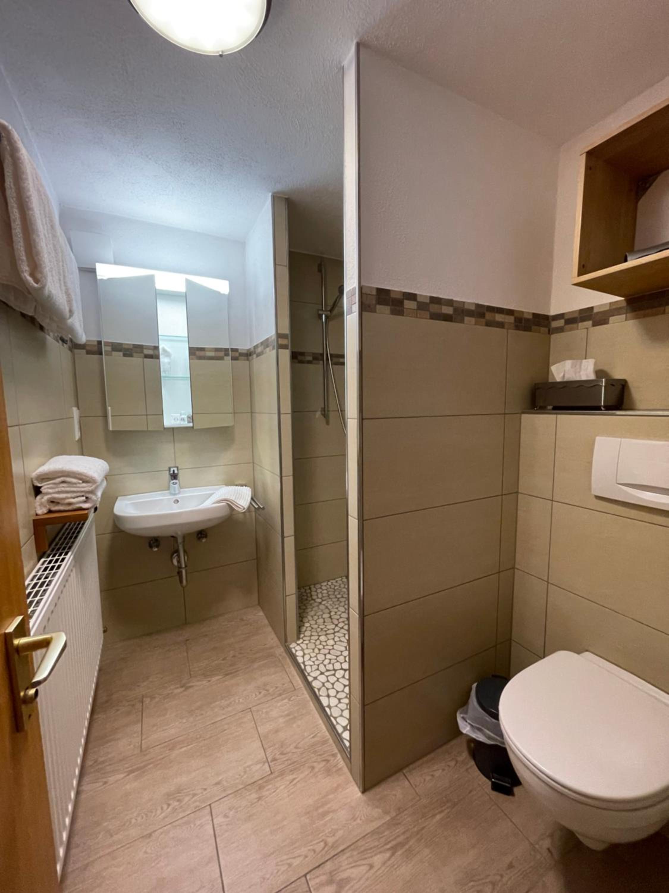 Gutes Frühstück, modernes Bad.