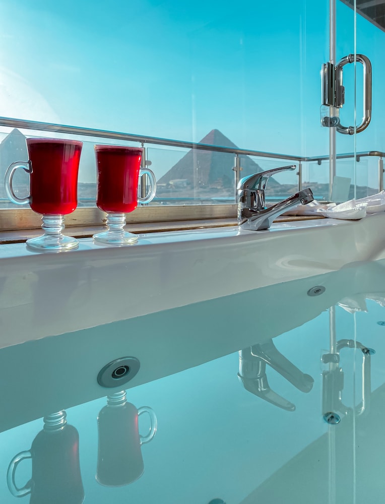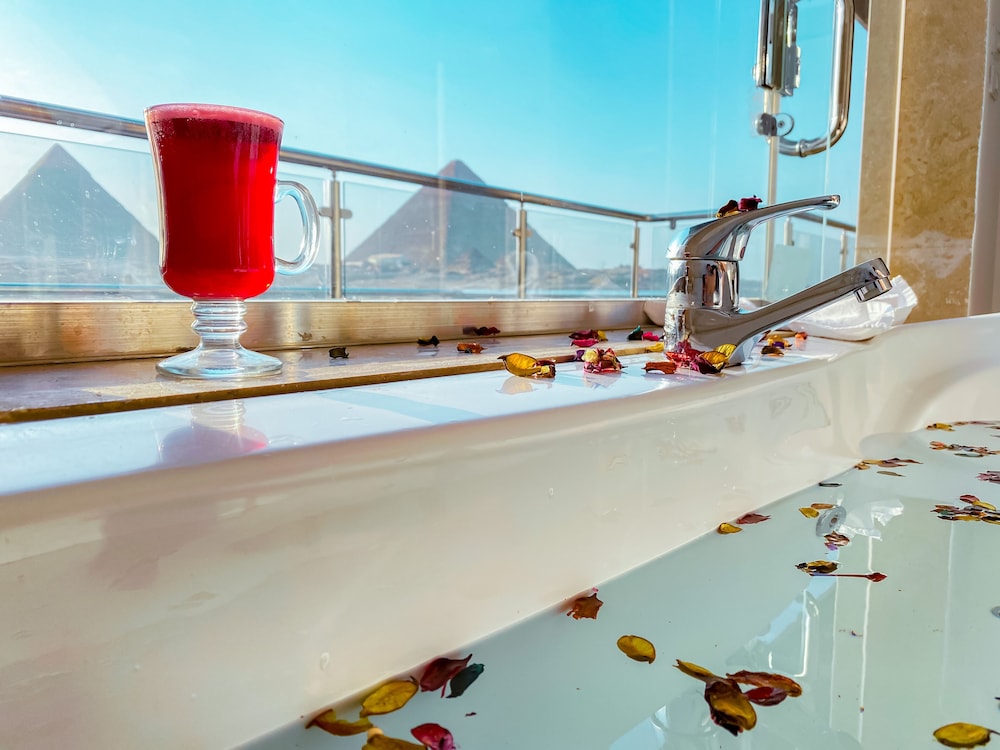 Lovely view of the pyramids from the premium room. Friendly and helpful staff. There was a hot tub in our room although the water pressure is so low that it would take forever to fill up the bath even to a third of the level. A decent place to stay for a night while in Cairo although the surrounding area and hotel entrance road is not ideal.