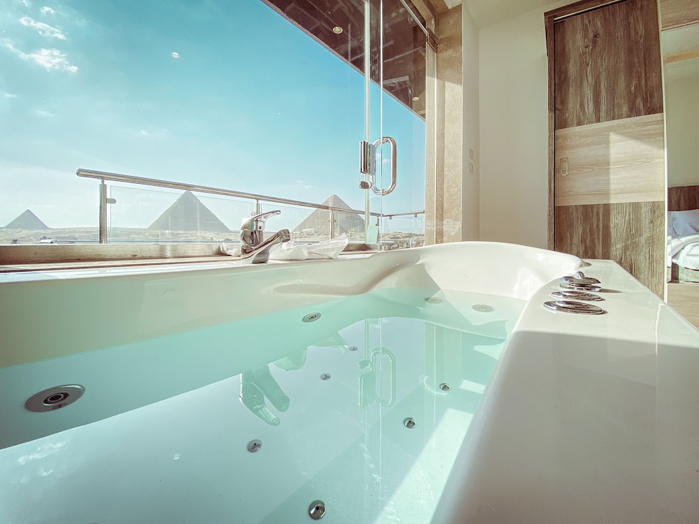 A very clean, reasonably priced, comfortable hotel, probably one of the best in Giza, with a fantastic rooftop view of the pyramids. Good variety of breakfast goods combining continental and Egyptian options such as foul medames, flatbreads and salad. Staff throughout were friendly and helpful. My room was spotless, spacious, had effective aircon and the bed was firm and comfortable. I never used the jacuzzi. Perfect for a few days stay. But the standout for me was the rooftop restaurant from where you can breakfast and dine with a stunning view of the pyramids, including the evening sound-and-light show. The hotel also gives a free lift from the airport.