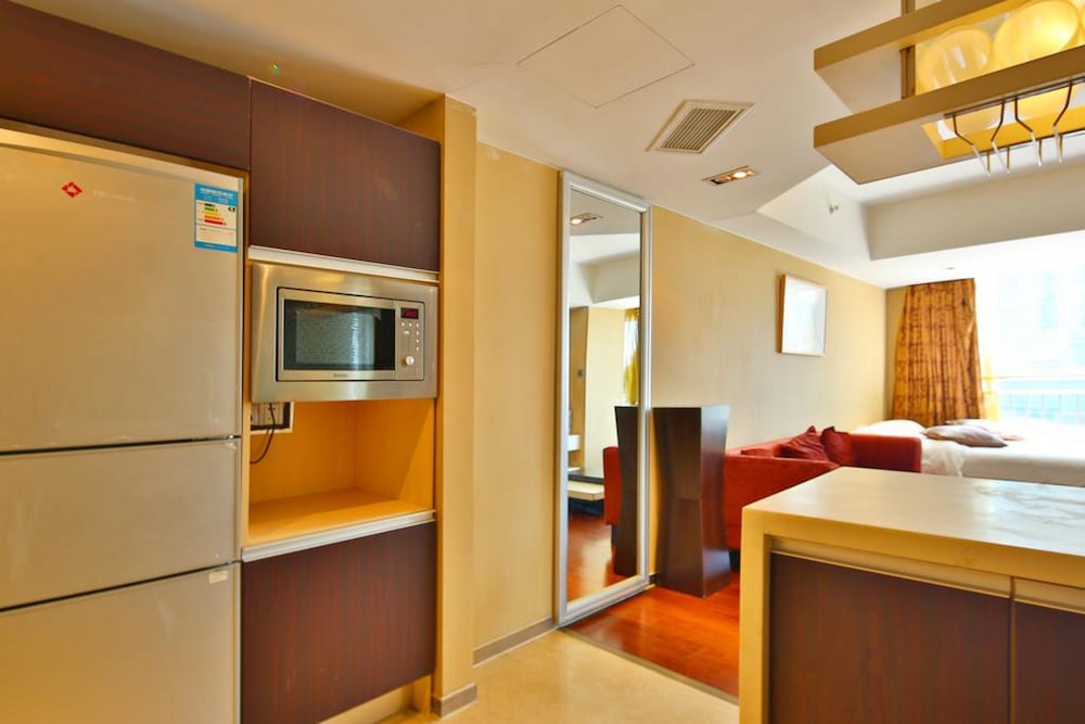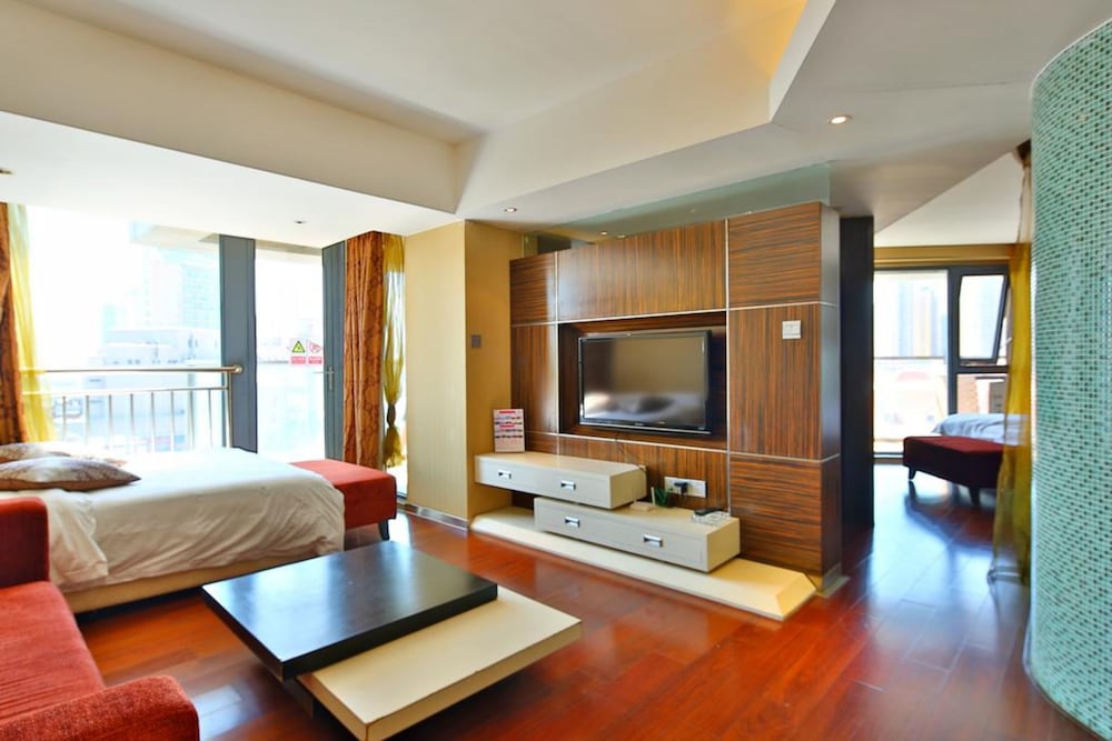 It was a very well fitted room, including balcony (with seaview), good kitchen with kettle and small fridge. The reception was 24 hours, the staff was friendly and helpful but unfortunately not all of them could speak English so it was difficult to get information depending who was working that time. It's close to nice restaurants, the famous Zhanqiao Pier and a little beach which is not great, but a few km down the road you will find a much better one easy to reach by bus or even a bit of walking. It is just across the road from Victoria Railway Station and the metro, and several bus stops. The building is open in the middle and if your room is high up you can get a very interesting view of the central opening of the building (watch out for vertigo, haha).