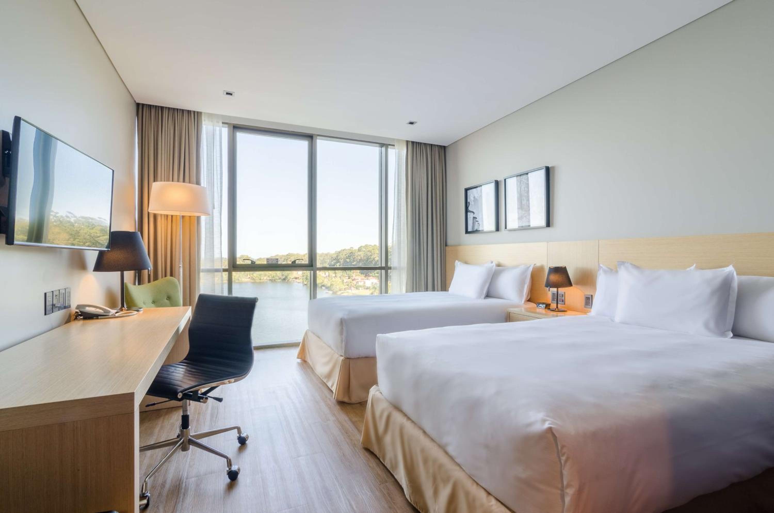 O atendimento é excelente. Muito embora nos colocaram em um quarto com o vidro da janela quebrada, assim que passei a informação, trocaram o quarto imediatamente para outro melhor com vista para a lagoa. O atendente Ernani foi extremamente atencioso e rápido no chamado. A limpeza do hotel é perfeita, café da manhã bom e excelente estrutura e localização. Foi apenas uma noite em razão do retorno para o Brasil. O hotel é bem próximo do aeroporto, 5min, porém não escutamos barulho de aeronave. Acústica excelente.