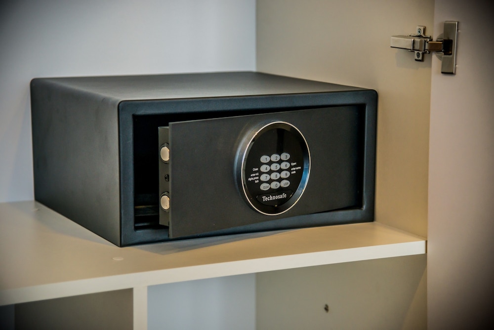 Bom número de tomadas no quarto, além de armário para pendurar roupas e cofre.