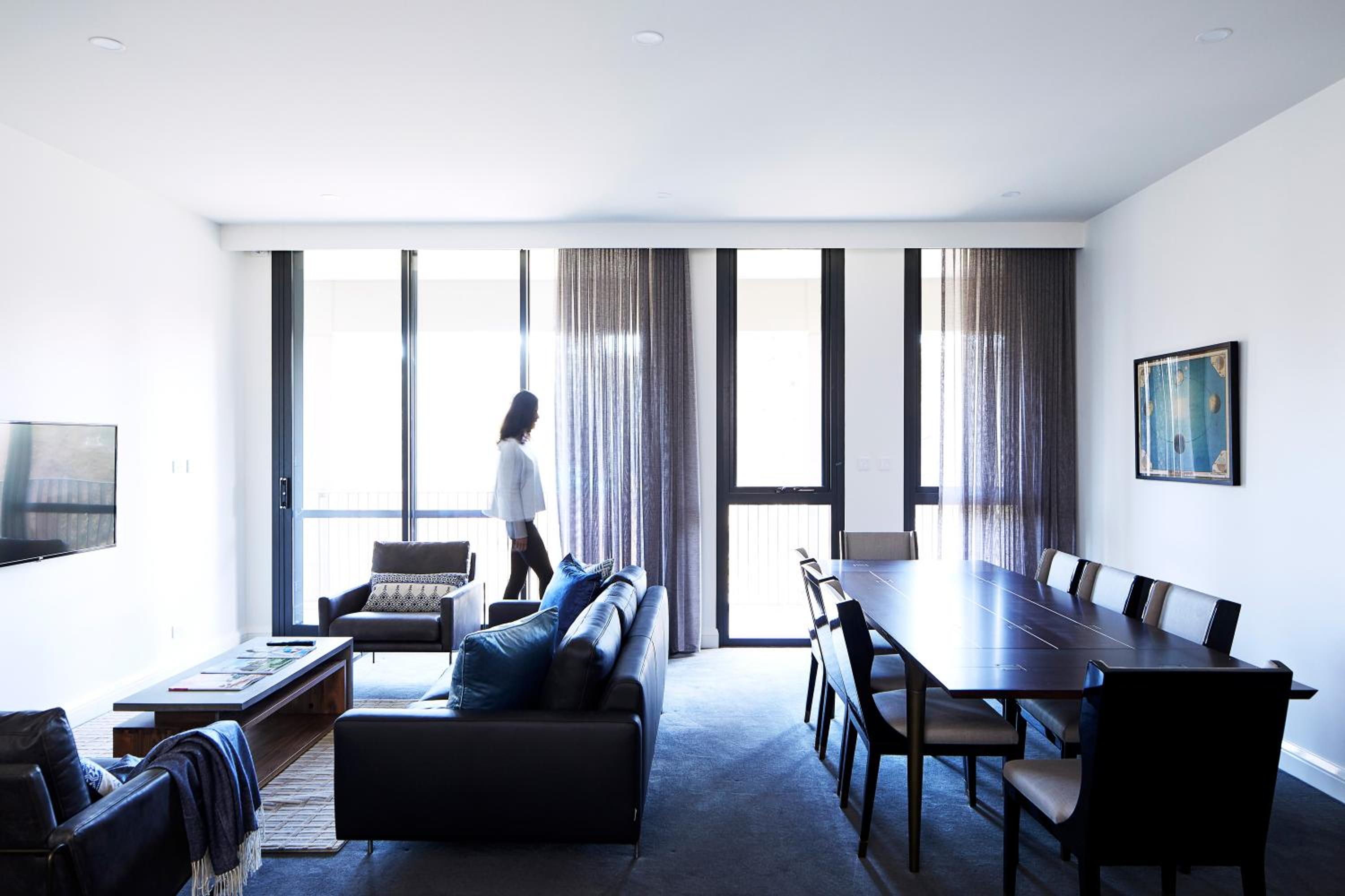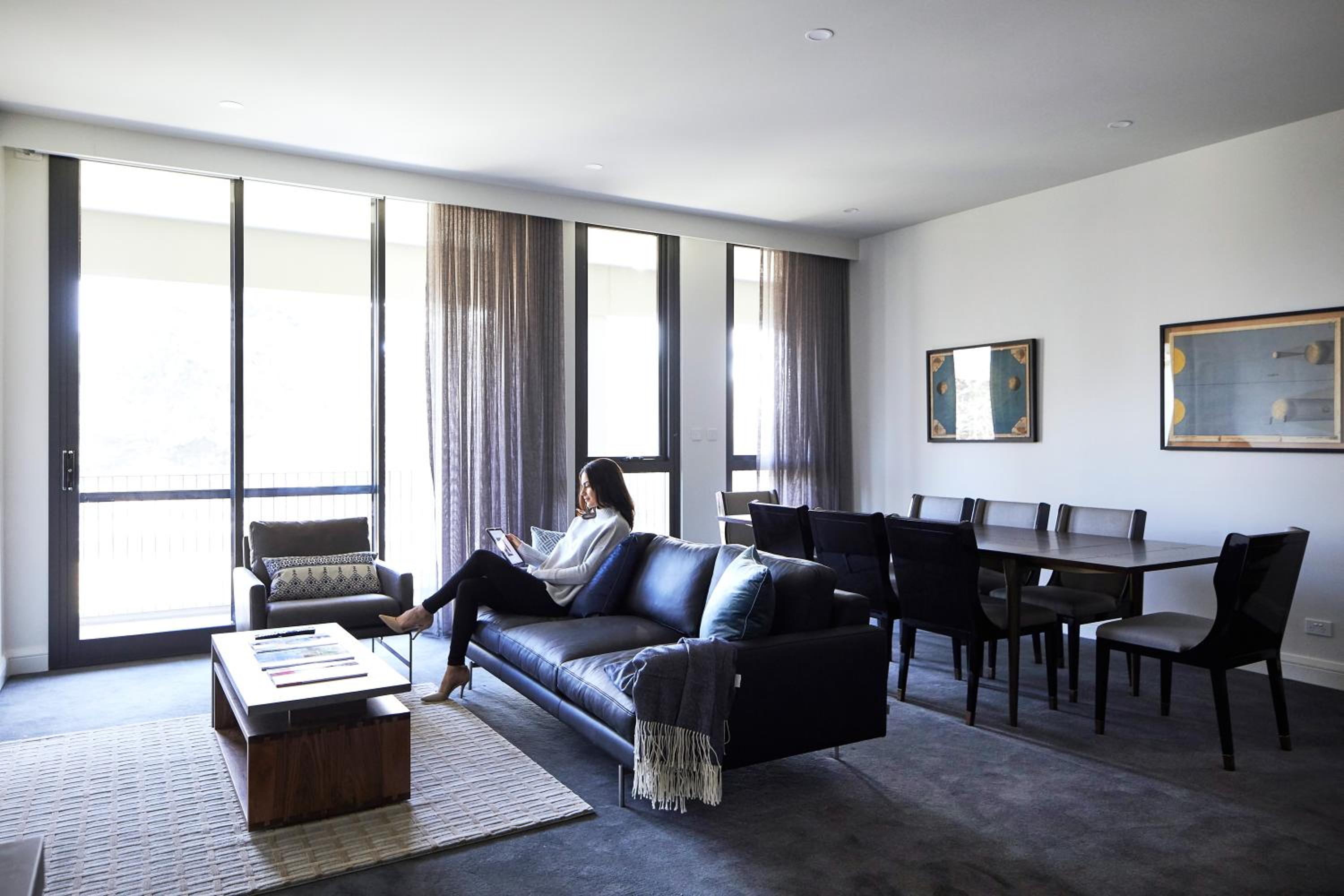 Knightsbridge Canberra offers elegant rooms and apartments with modern amenities like free WiFi, movies-on-demand, and a stocked minibar. The air-conditioned spaces feature smart LED TVs for entertainment and comfortable stays. Apartments boast additional living space, balconies, and fully equipped kitchens, making them perfect for longer stays.