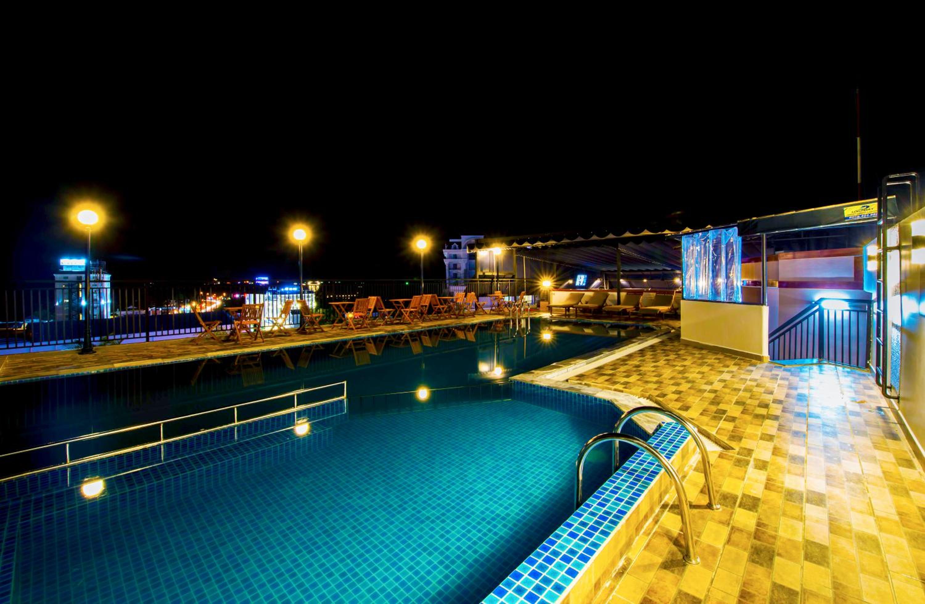 - The swimming pool is on the rooftop and has a beautiful view of the city and the ocean in the distance.