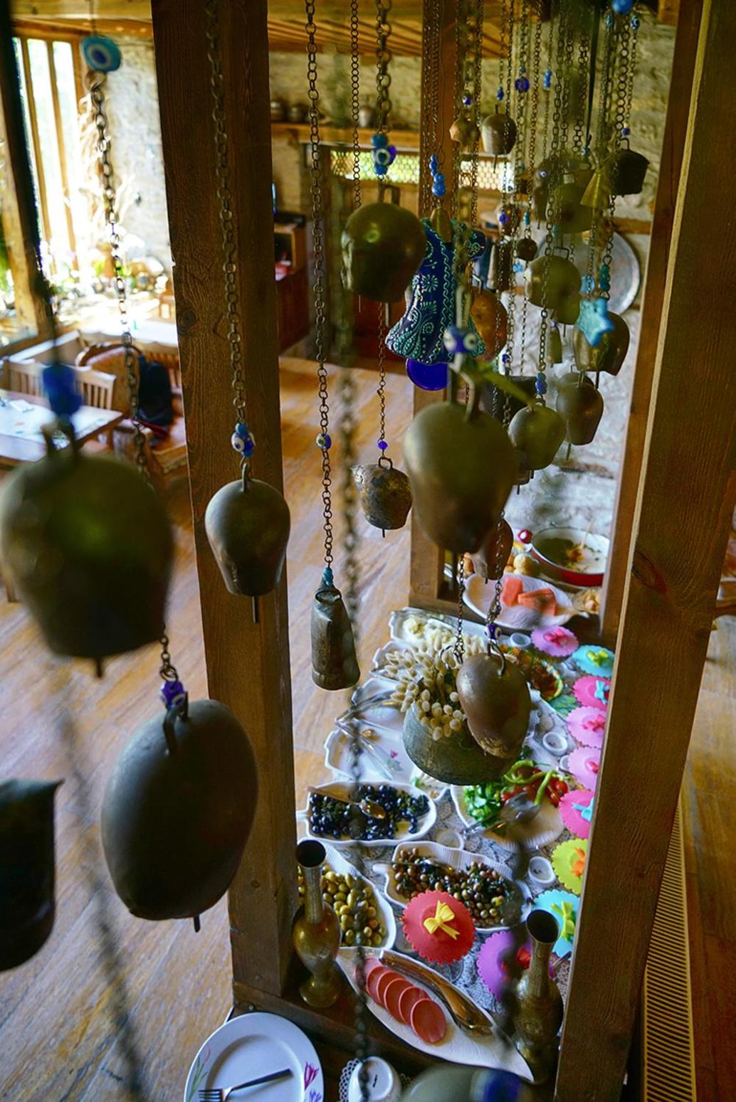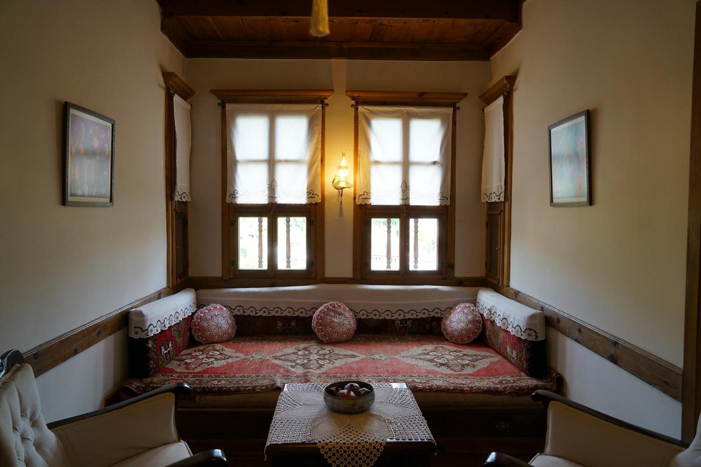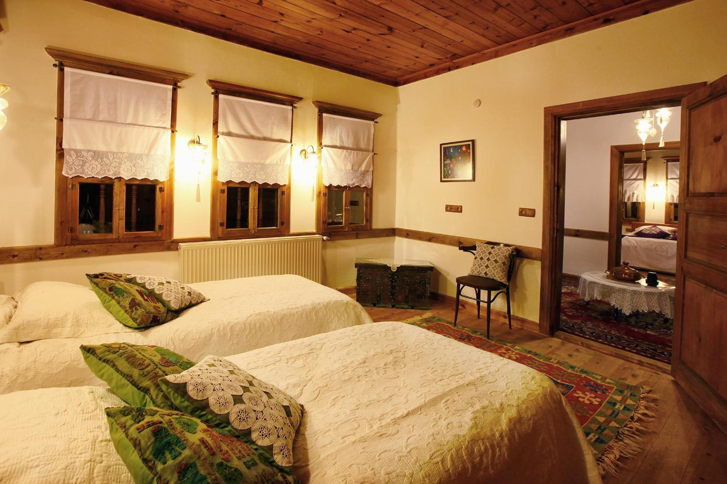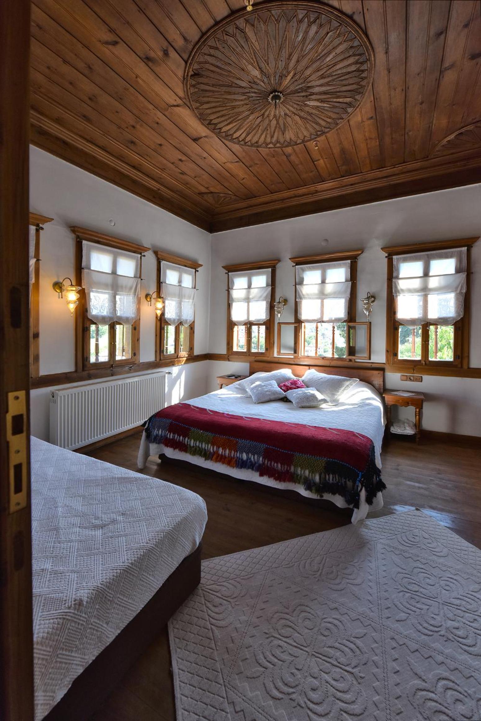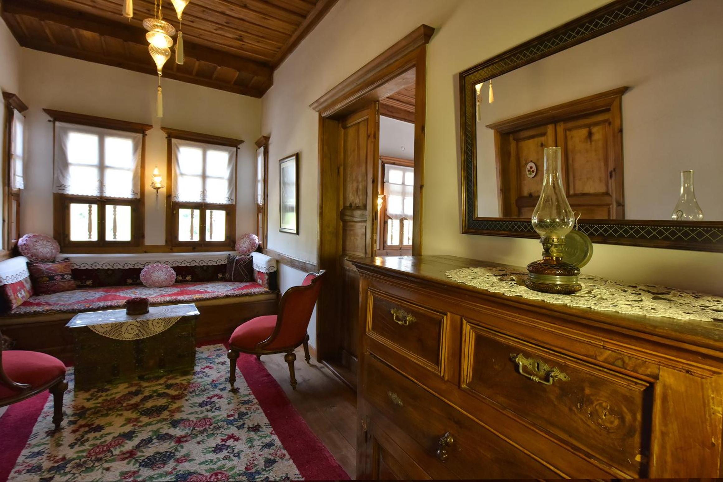 Odalar eski bir konak nasıl olursa o şekilde, her yer ahşap, pencereler perdeler her detay ince ince düşünülmüş, çok emek verilmiş restorasyonuna.