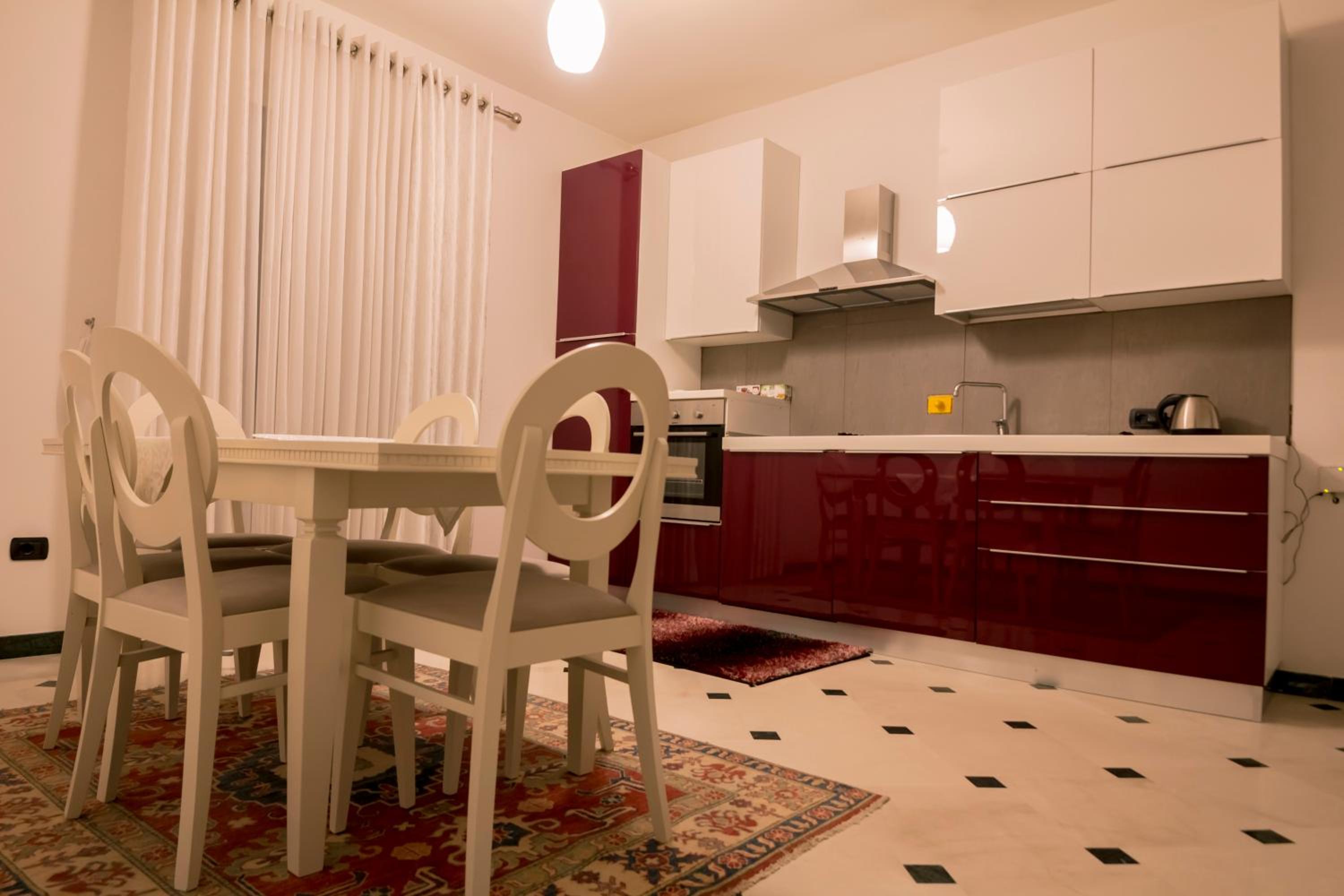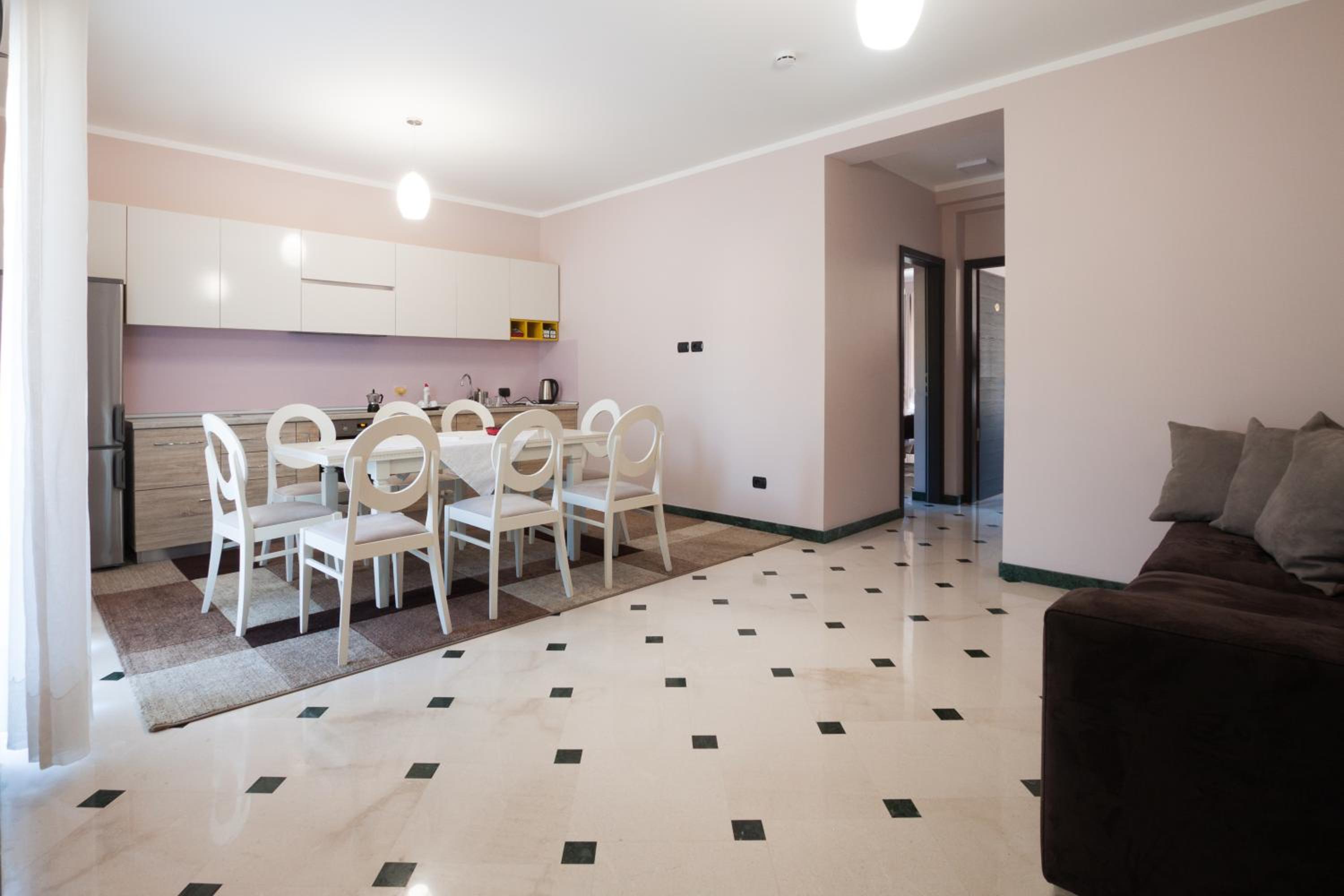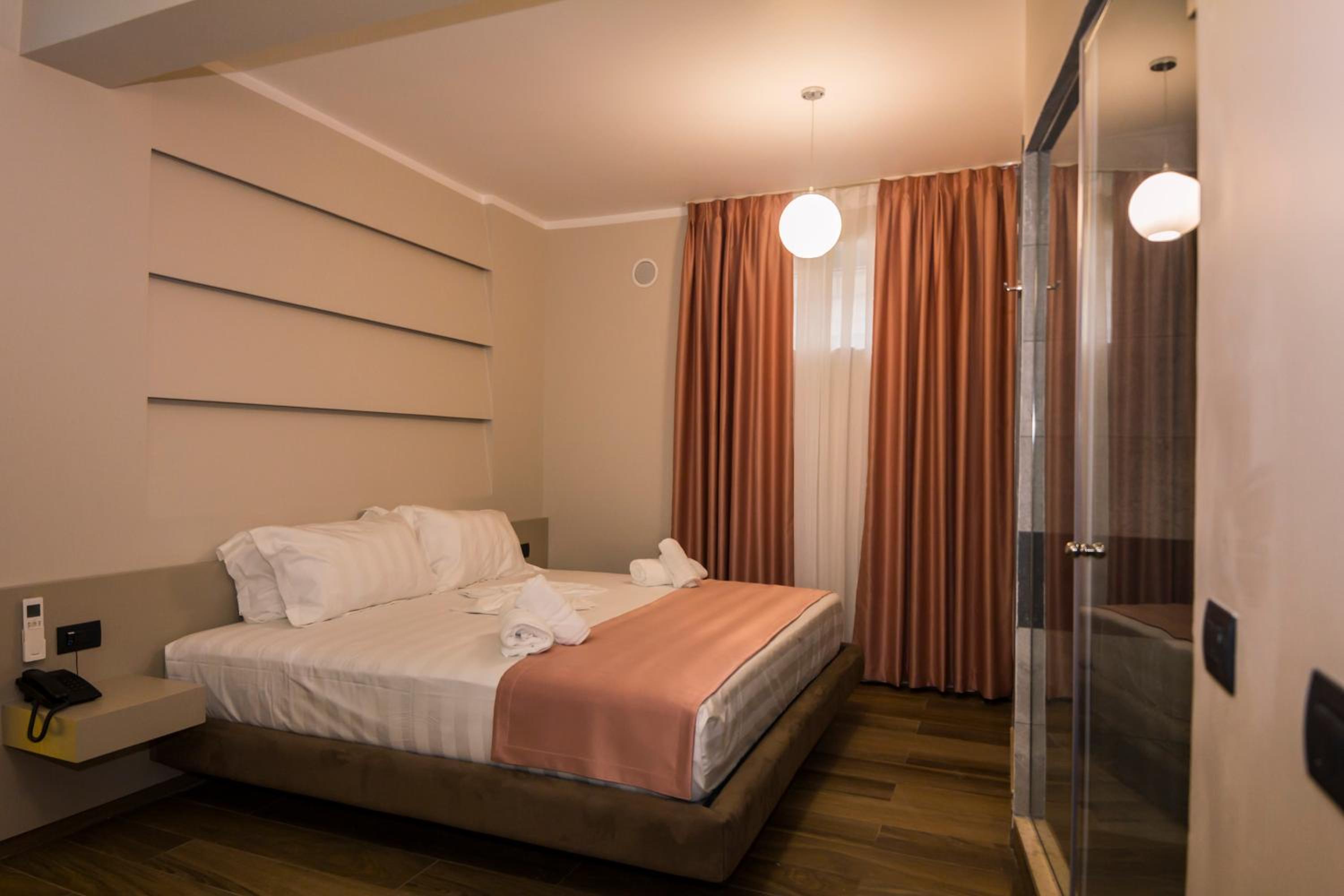 La Suite al quarto piano era enorme, comprendeva tre stanze grandi, ognuna con un proprio bagno, un balcone/terrazza grande e uno spazio comune ampio. Tutto super puliti e curato. Personale gentile e disponibile. Sì trova a poco meno di 2 chilometri da Piazza Skanderbeg, raggiungibile in taxi (al costo di 5-6 euri) in pochi minuti o in mezz'ora a piedi. In tre abbiamo pagato 100 euro a notte in totale. Super consigliato.