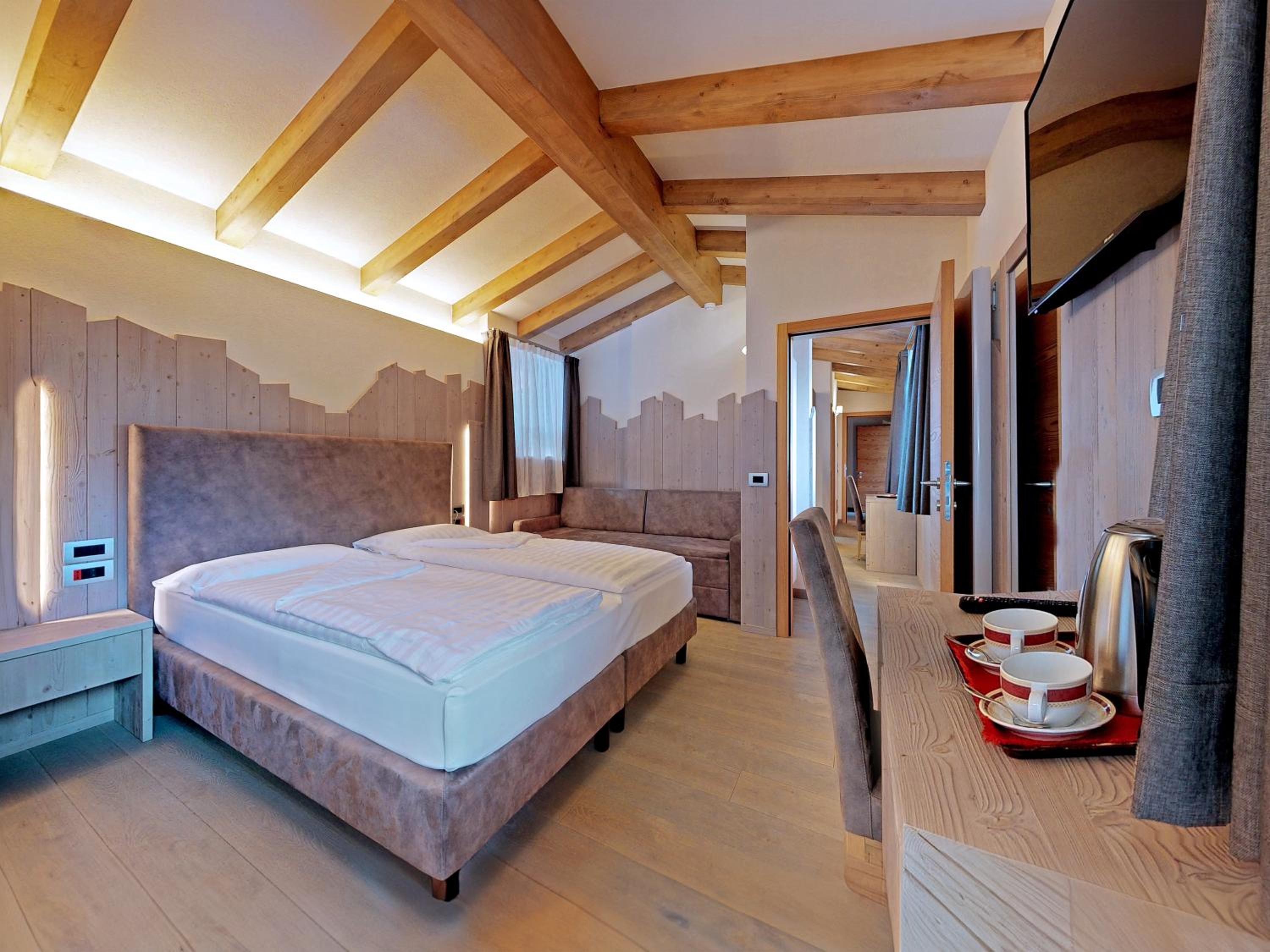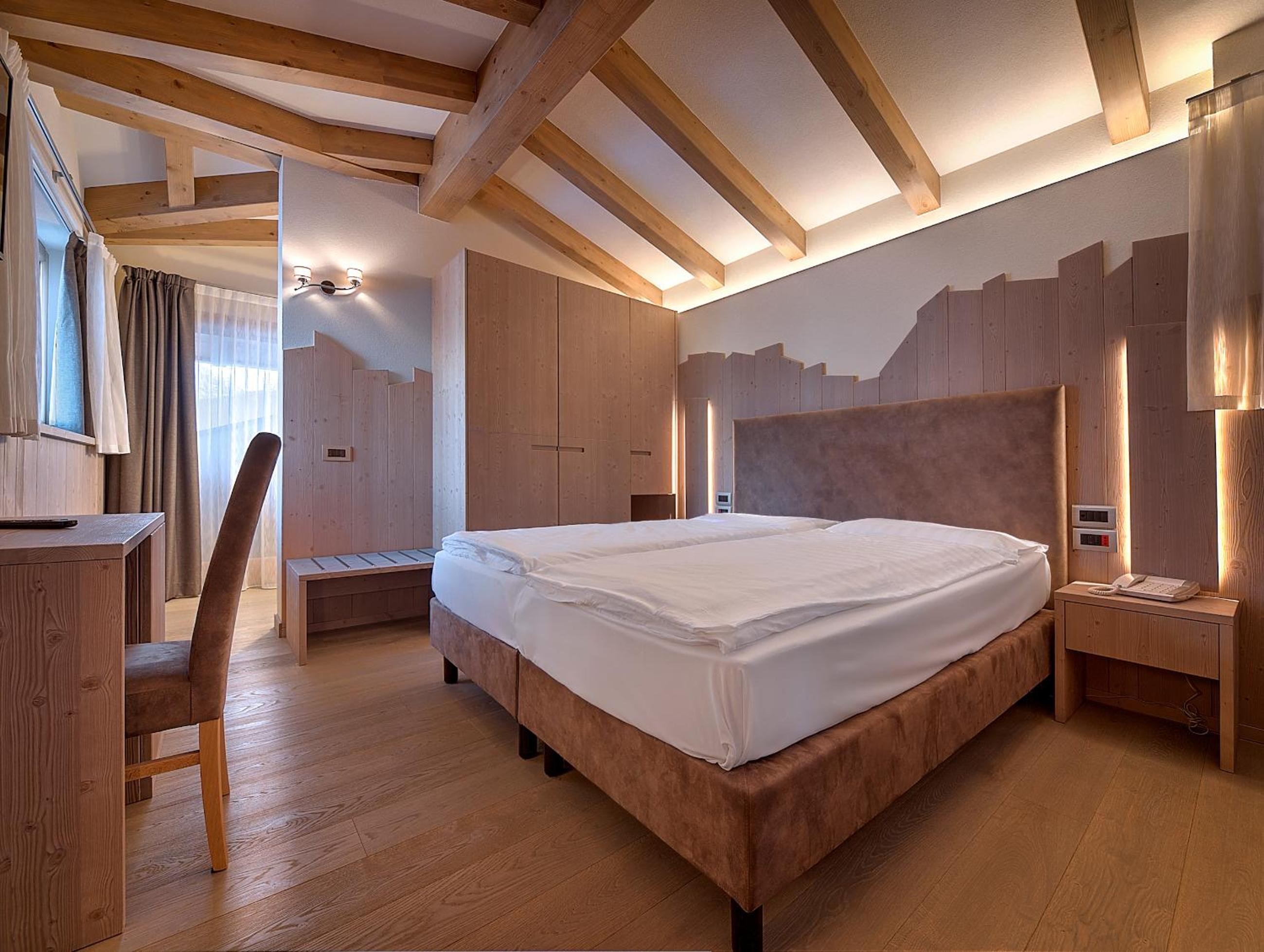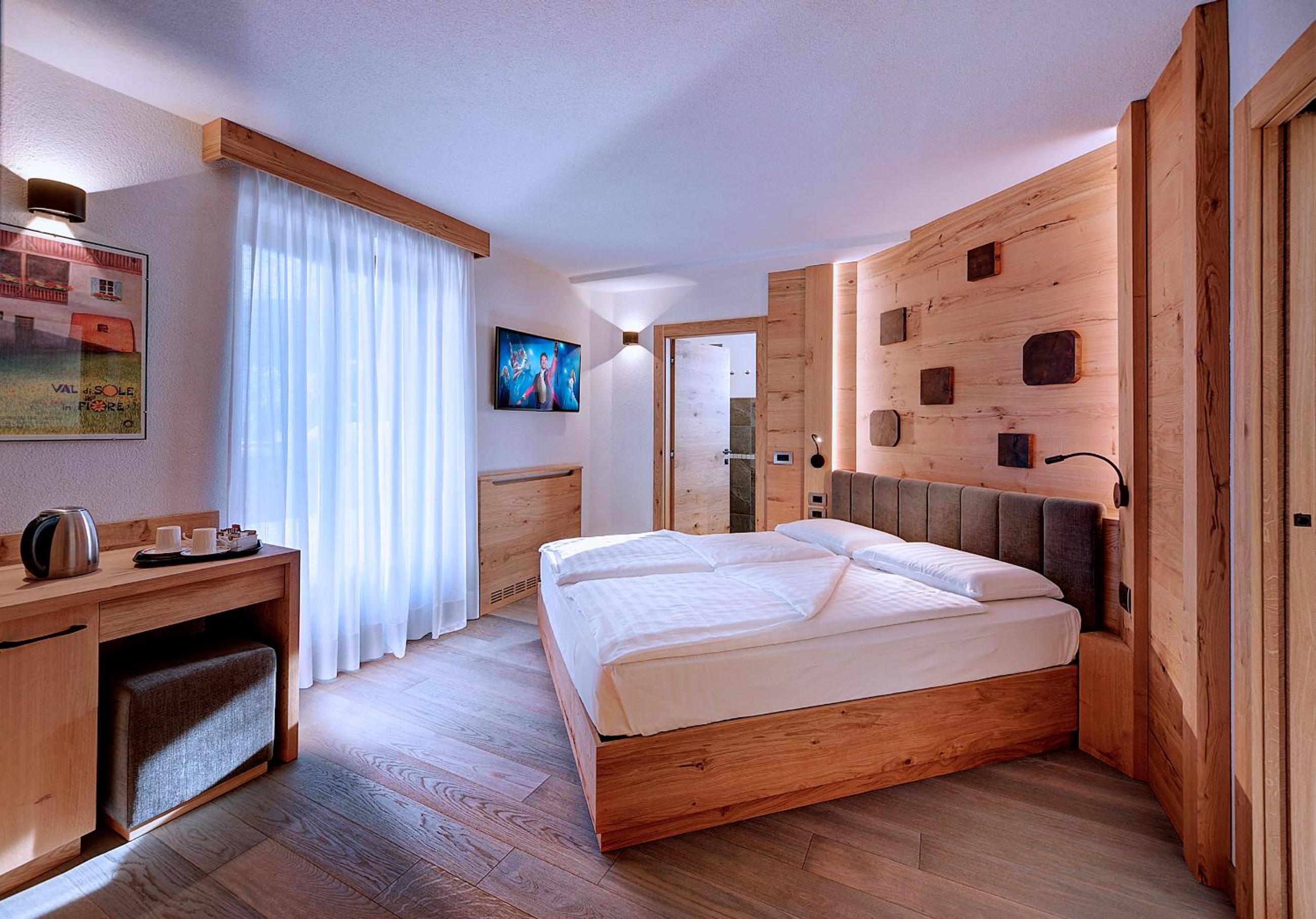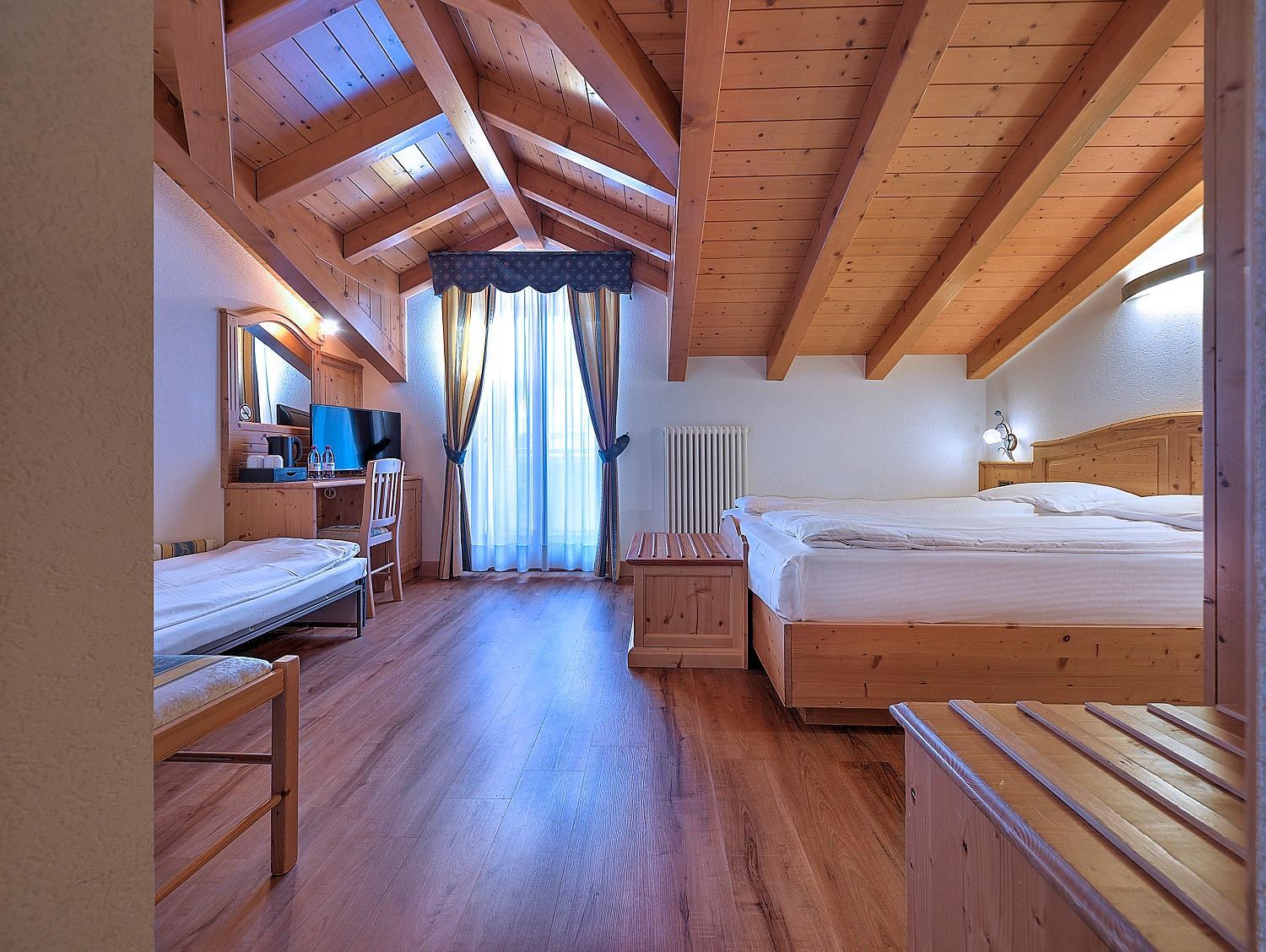 Indulge in the cozy comfort of our Alpine-style rooms at Hotel Madonna delle Nevi. Enjoy modern amenities such as flat-screen TVs and wood-beamed ceilings, offering the perfect blend of tradition and convenience.