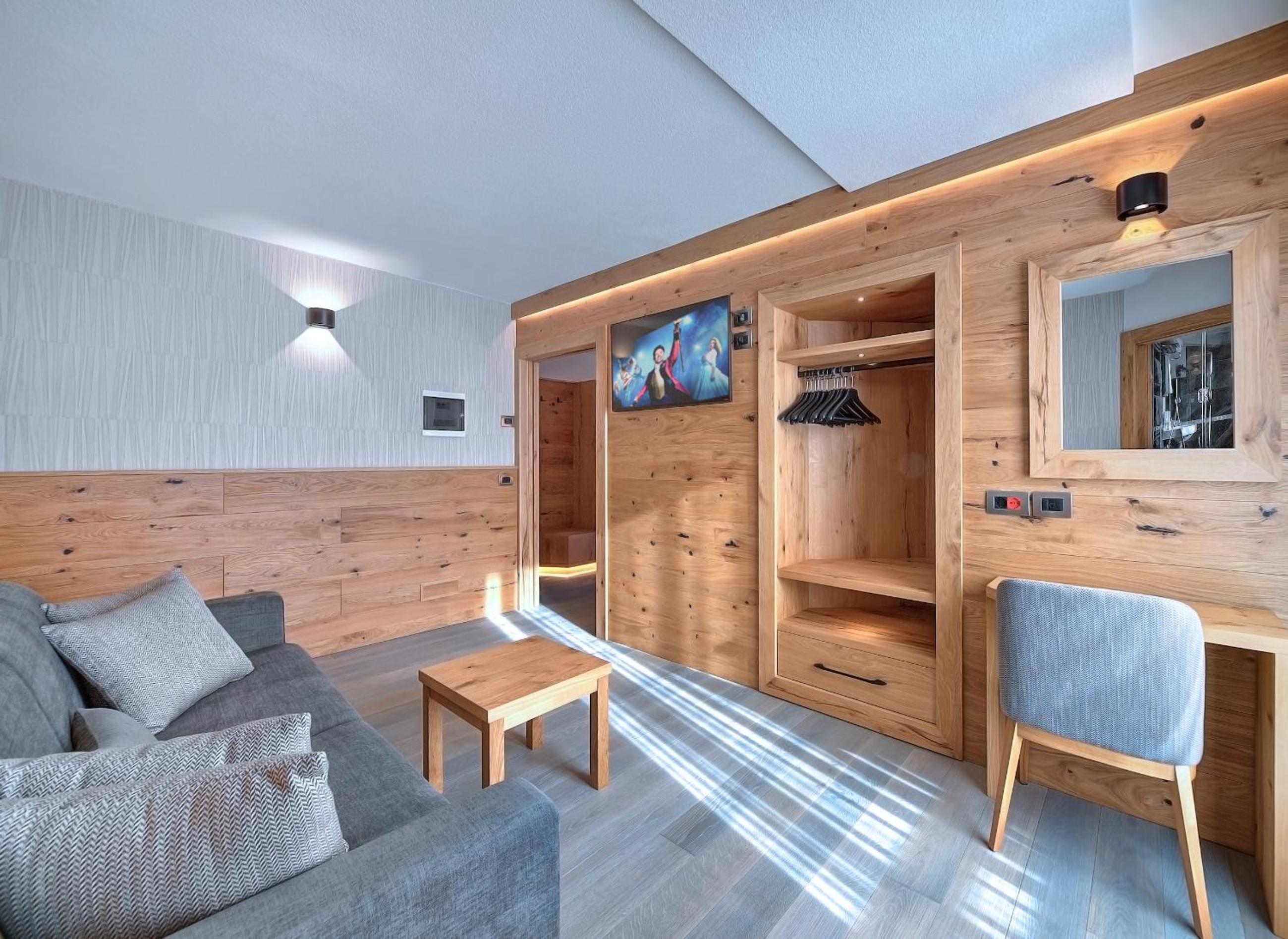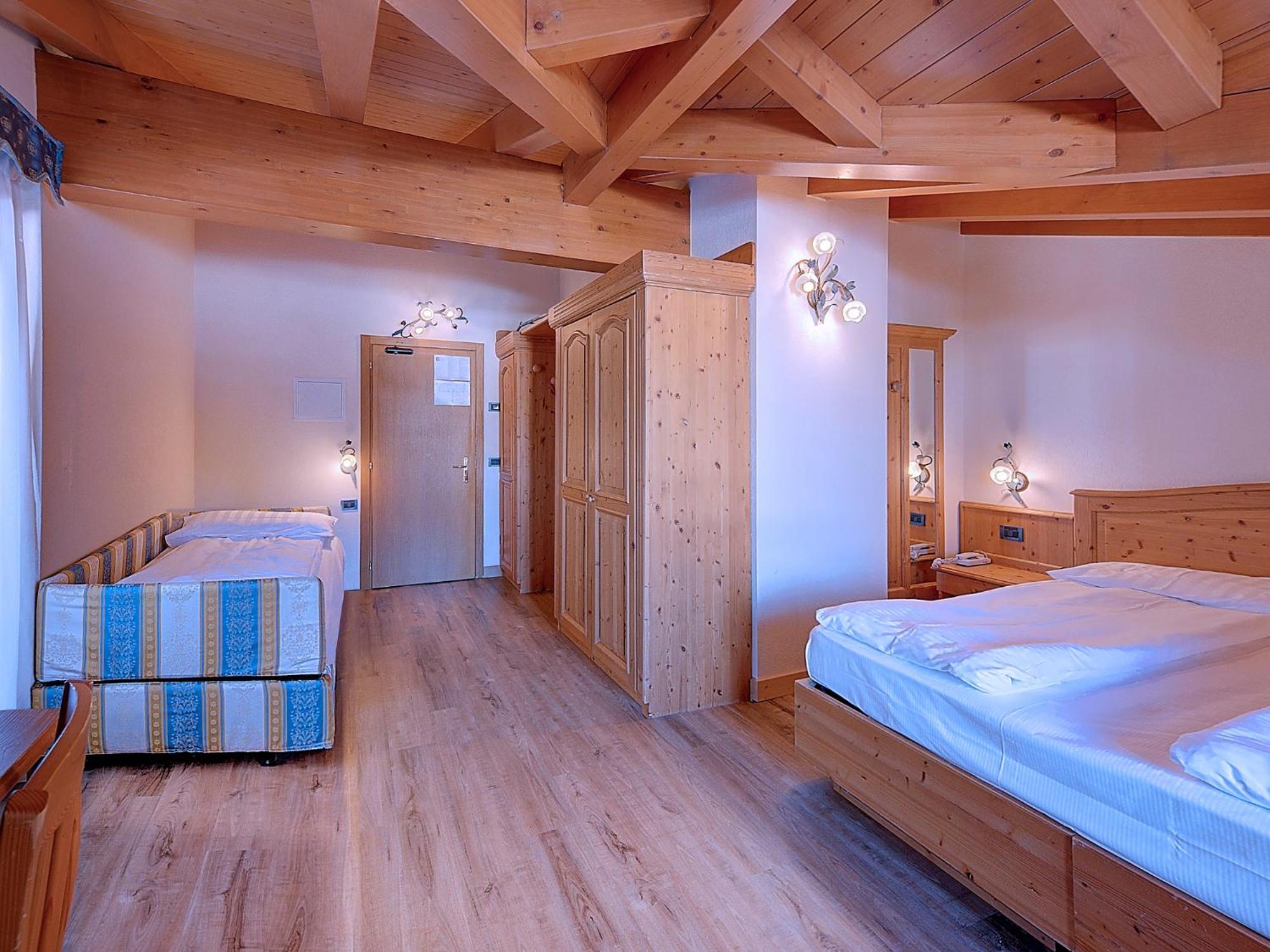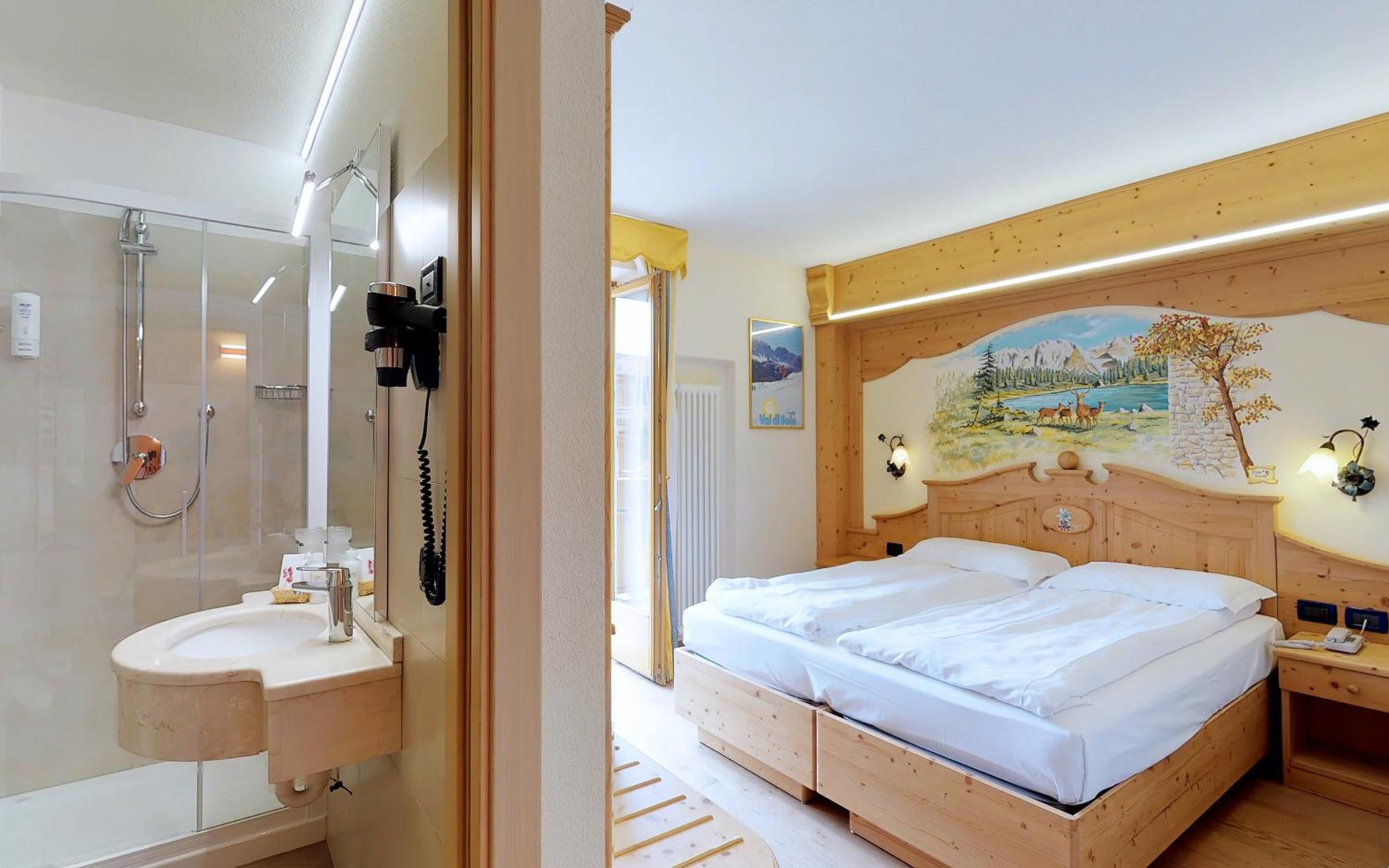 Indulge in the cozy comfort of our Alpine-style rooms at Hotel Madonna delle Nevi. Enjoy modern amenities such as flat-screen TVs and wood-beamed ceilings, offering the perfect blend of tradition and convenience.