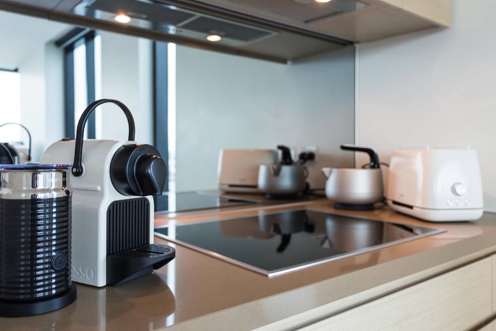Complimentary tea/coffee/small milk in fridge etc. would be a nice touch. As would some decoration around the walls. And some more cleaning products such as dish washing liquid, dishwasher powder, cloths for wiping benches, tea towels etc.