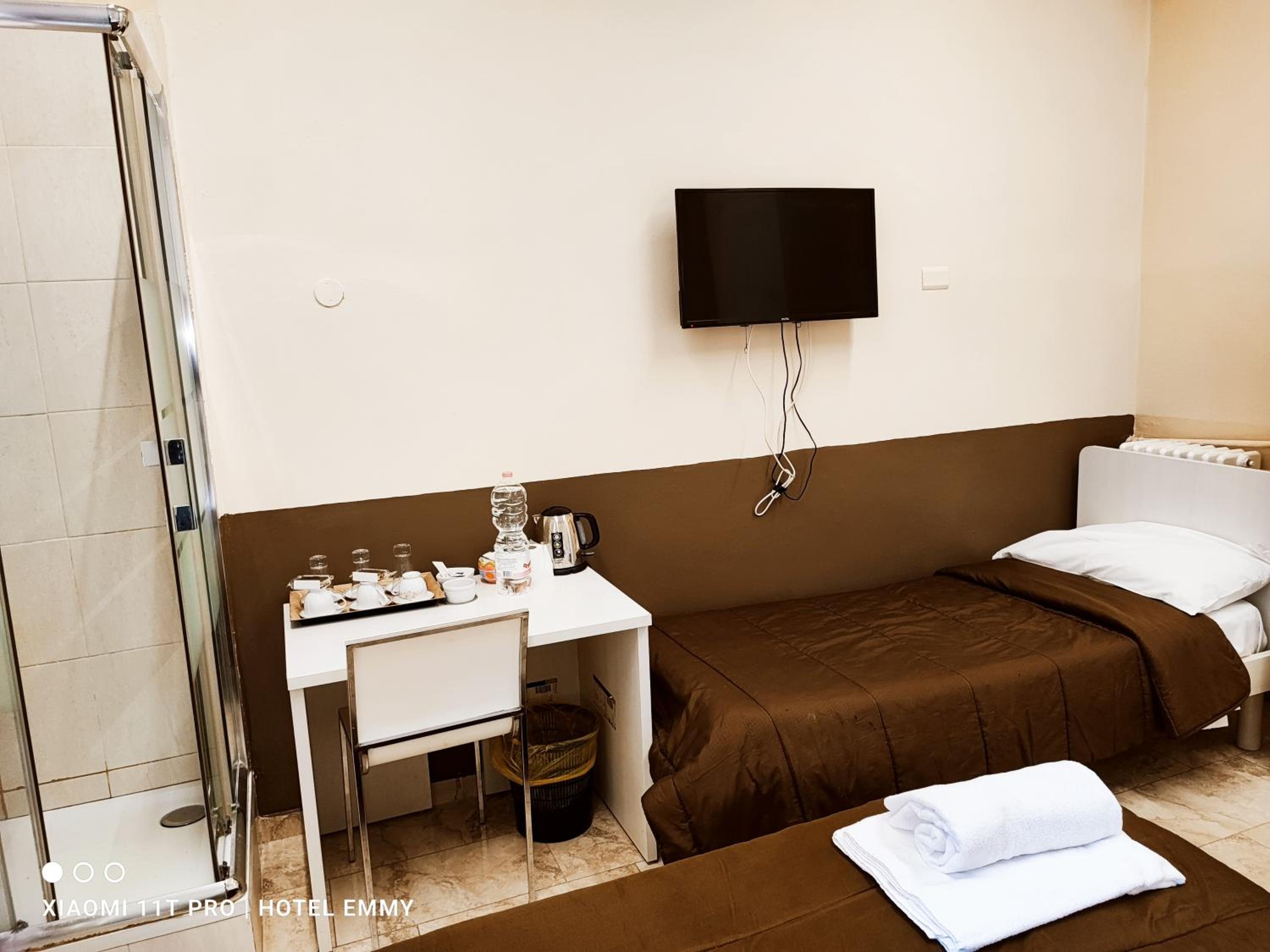 Comfortable Rooms with Essential Amenities Each room at Hotel Emmy is equipped with a cooling fan, TV, and a safe for your convenience. Although the bathroom is shared, rest assured that a shower is included in every room for your comfort.
