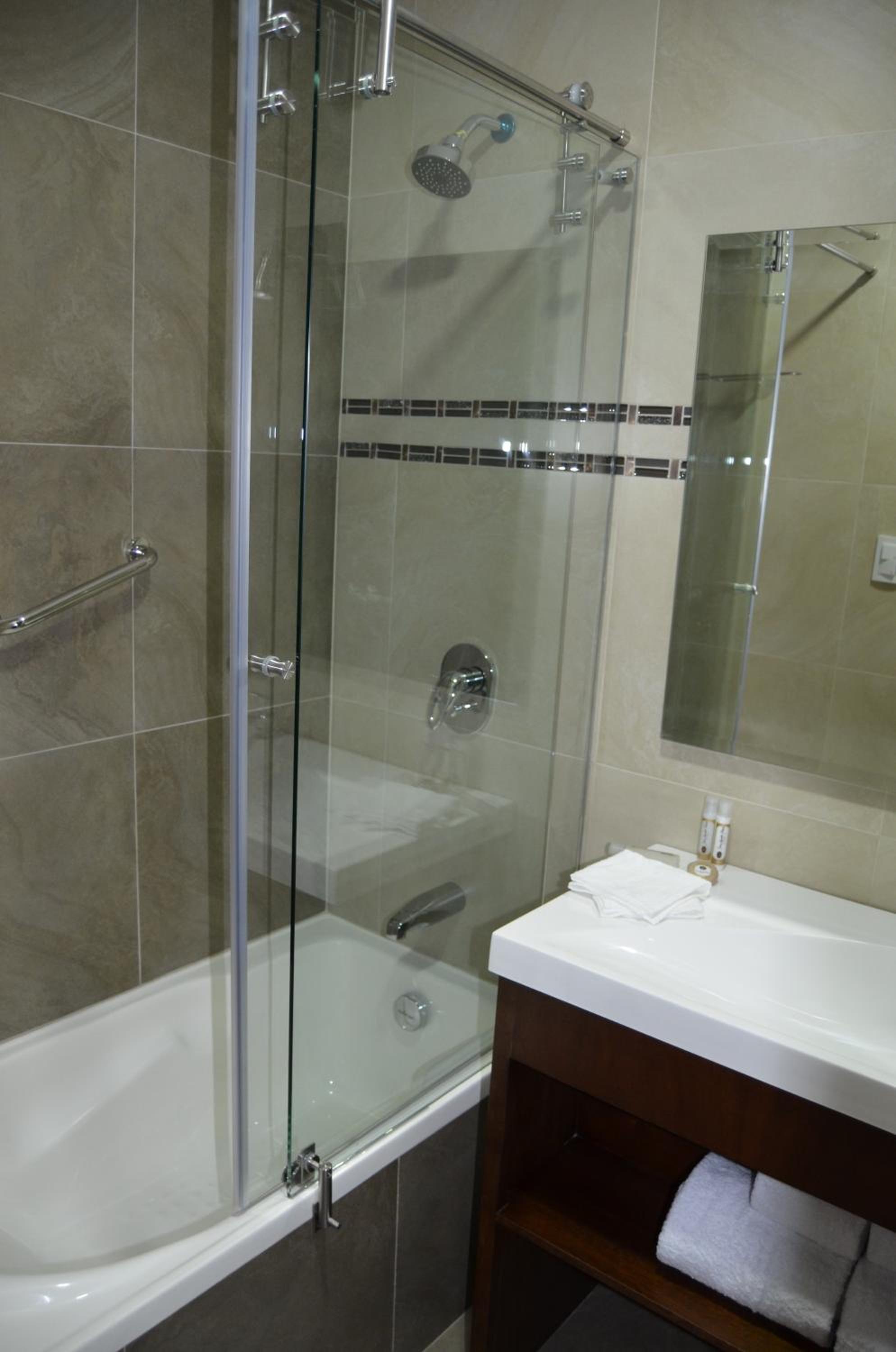 En el baño de nuestra habitación, la ducha era incómoda y difícil de ingresar pues al ser una tina y tener puerta corrediza no había mucho espacio de ingreso y podría ser peligroso si no se tiene cuidado.