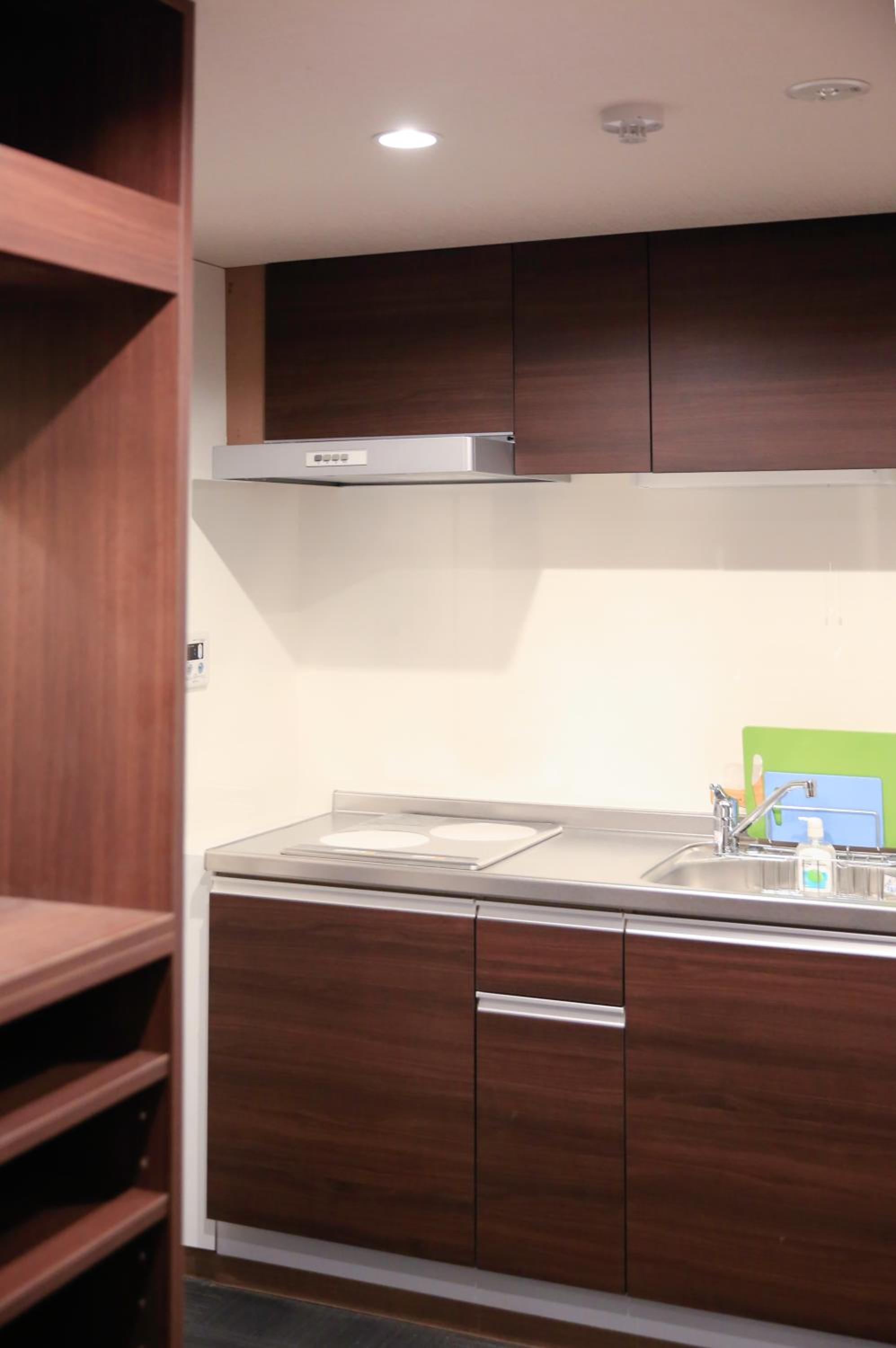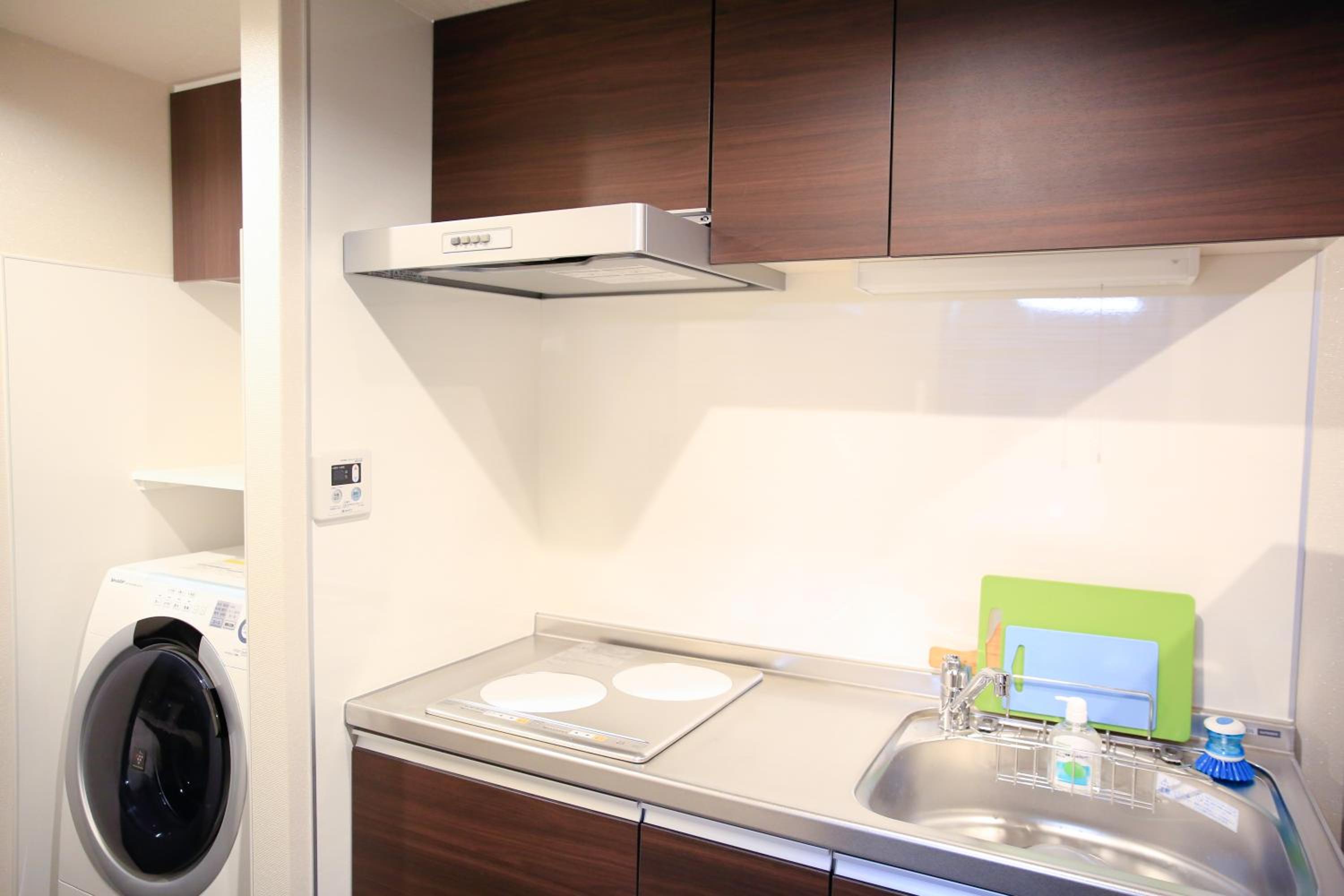 Cone with kitchenette. In room microwave, washing and dry machine, pot, pan, cups, rice cooker...etc