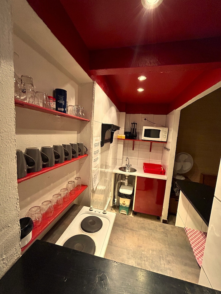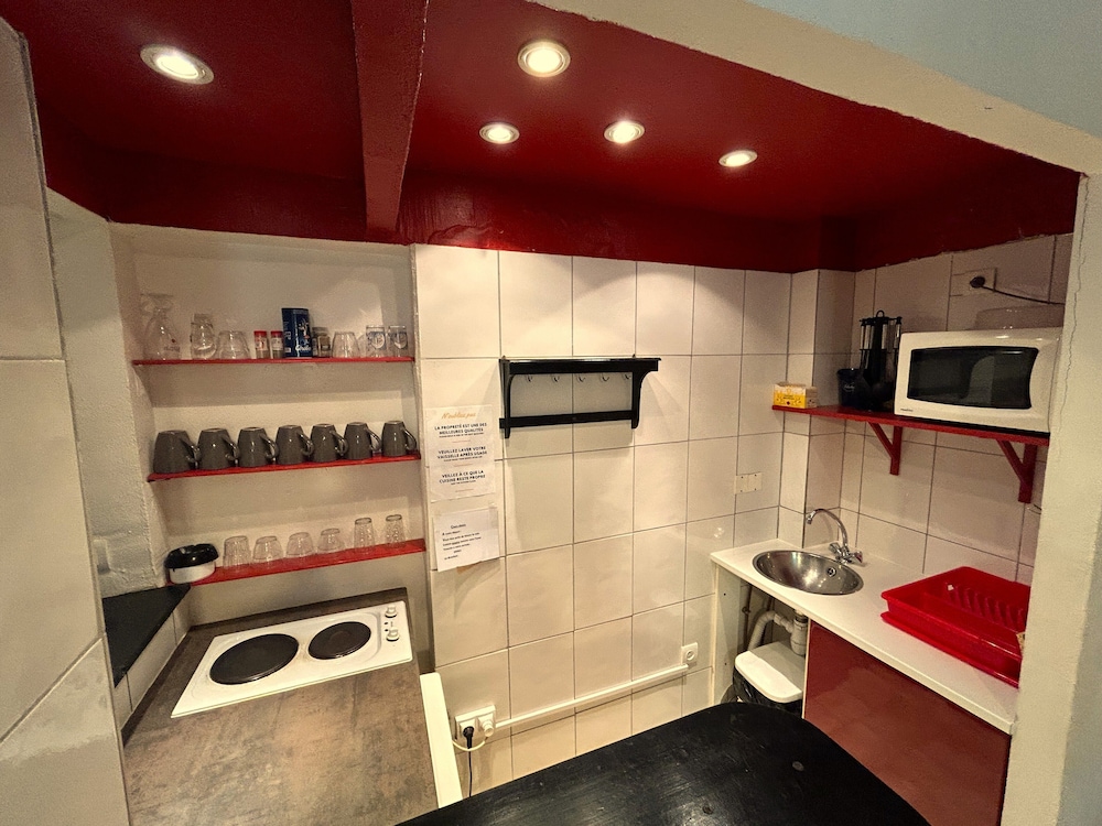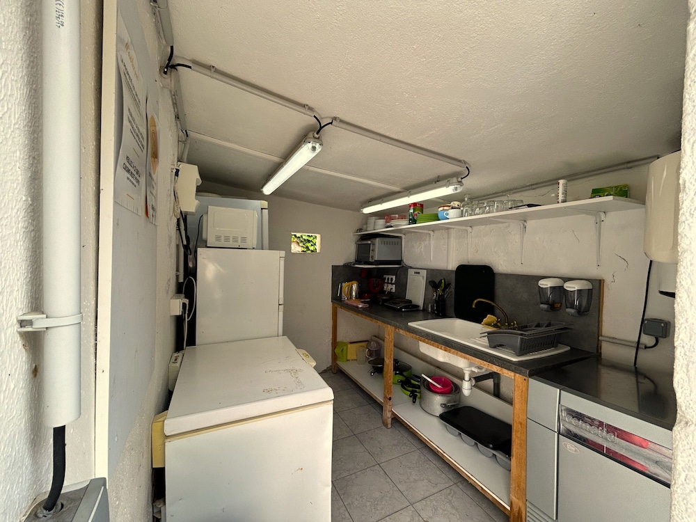 Petite cuisine tout confort aménagée avec salon de jardin intérieur semi ombragé un vrai délice pour un dîner home made au calme..petit déjeuner plus que satisfaisant pour un prix largement correct ..avons pu papoter avec une des employés très agréable..séjour fort fort sympathique.fait aussi presse très pratique.