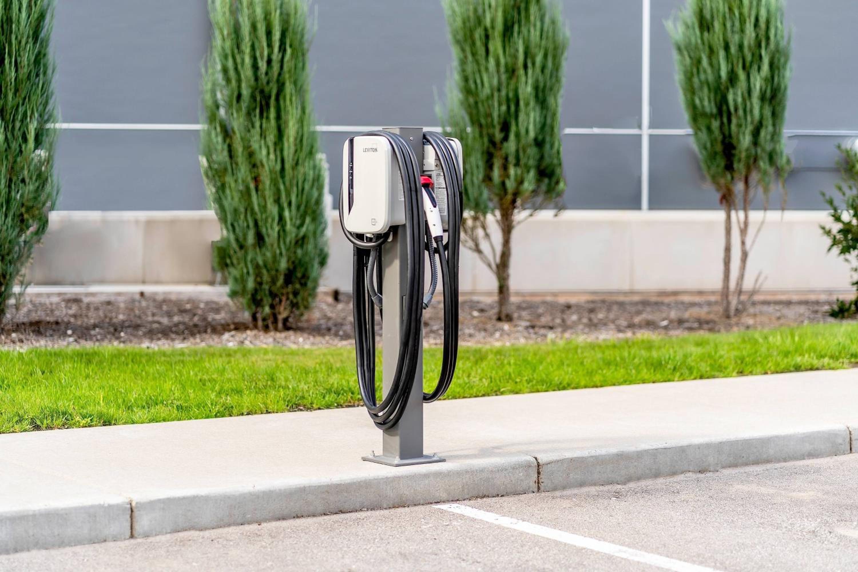 Electric car charger in parking lot. Near several parks and on the river walking path.
