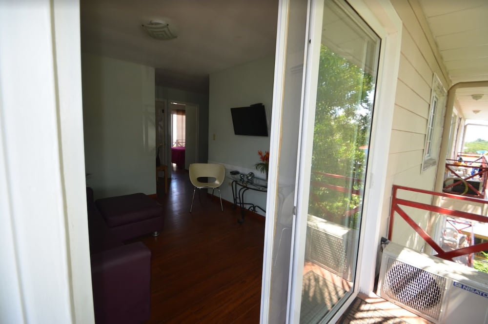 It was false advertising and the place was not anywhere near the ocean. When I went to check in, it had no desk or employees. As I walked around the building I could see why they only showed the upper part. The lower part was indescribable.. The back had open trash on the ground, the side was an alley and the building next to it looked very bad with animals, chickens and dogs, some of which were copulating on the streets around it. The neighborhood was rough, the street had very bad holes in it, and the ocean was not in sight, but two blocks away and smelled like sewer. THere was a 6 foot high fence around the building and was not kept up with loose and broken boards on the fence. When I went to register after my flight arrived from Panama City, no one was there and the building was locked up so no entry. There was a sign on the side door behind the fence saying "be right back" but we waited for an hour and finally went to the next island to stay which was a real hotel with a small lobby. Have I given you a picture? The owner debited 100 dollars from my account which was not supposed to happen and I am now refuting the charges. Expedia dropped the ball on this one.