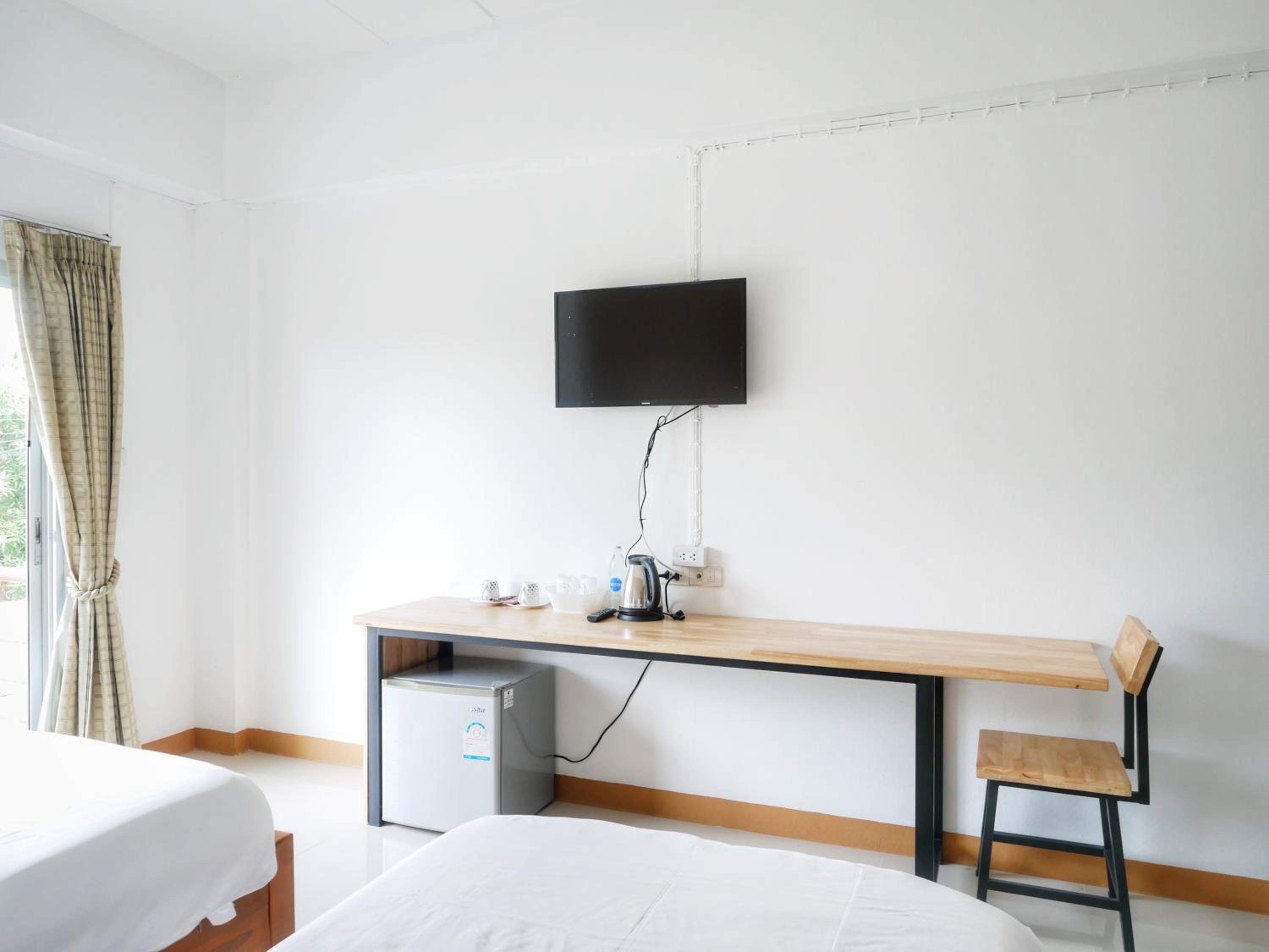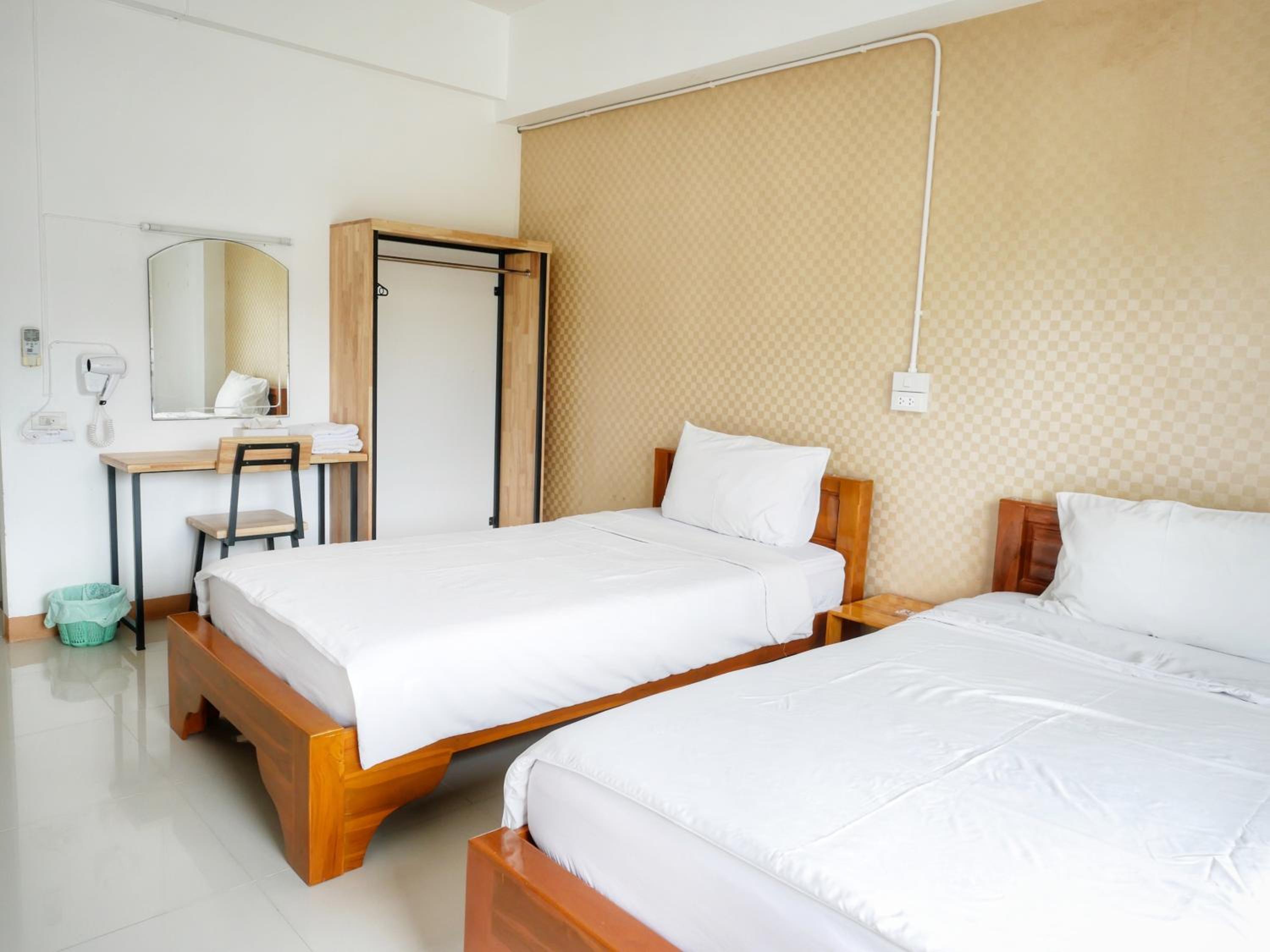 The room was clean and bidg, beds were really wide (I had a twin room) and comfortable (the mattress was the best compared to the other 4 places I stayed in Thailand!). There were coffee and water in the room, also self-service bevarages in the hall. There were some snacks and ice-cream to buy. It felt like a good 3-start hotel. The hostess was really nice and spoke English, I didn’t expect that in this not so turistic town. A/C worked fine, I really liked that curtains were black-outs and covered the windows perfectly, there even was an insects net on the windows. When I opened the window early in the morning, the birds were singing, what a good start of the day :)