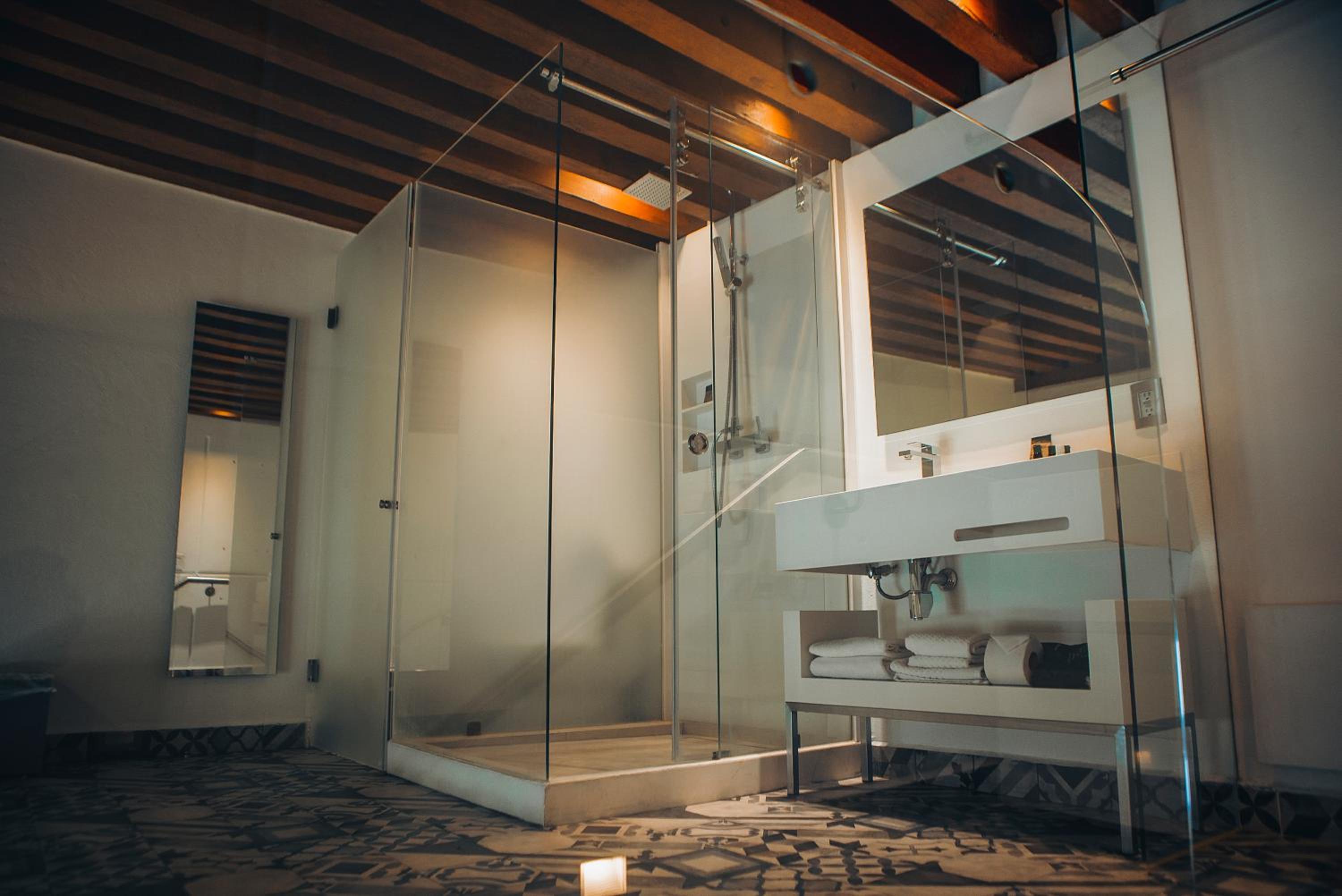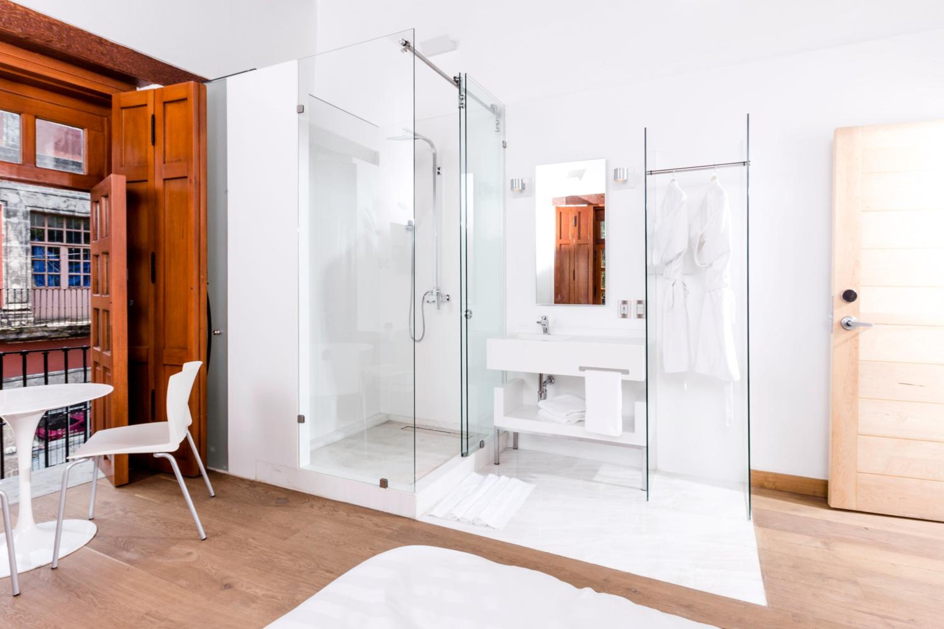 Lovely hotel with big rooms. Our windows opened to the plaza below. Our bathroom was tiny awkward in that the shower was a glass box in the corner of the room, next to the toilet in an opaque glass box. Otherwise, the room was spacious with a sofa, giant screen TV, small table for two, comfortable large bed, with reading lamps and nightstands. Wifi was good. The generous complementary breakfast was delicious with endless coffee. The employees at Domingo Santo are wonderful! The folks working the restaurant breakfast were engaging and fun. I do not have everyone's name but everyone was very friendly and professional. A very special thanks to Reception employee Aydee and Restaurant server Daniel--two employees who went beyond their roles to help us and make us feel welcome! We recommend Domingo Santo!