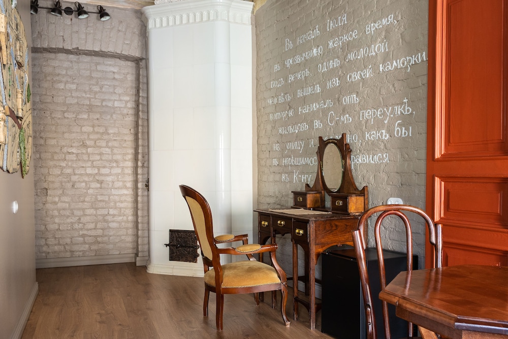 Мне очень понравился отель. Он расположен в старом доме в начале Невского проспекта. Каждый номер в этом отеле неповторим и посвящен писателю или композитору. Нам достались "Гоголь" и "Толстой". Мы чувствуем атмосферу того времени. Фотографии, подбор мебели, светильники, потолок и обои - все работает на создание выбранного образа. Можно взять в ящике старый том произведений Гоголя, полистать страницы, зачитаться. Или смотреть в окно на движение троллейбусов, почему-то совсем нешумное. Или на крыши. При этом номер, конечно, оборудован современными удобствами. Хотелось бы отметить, что номер просторный.