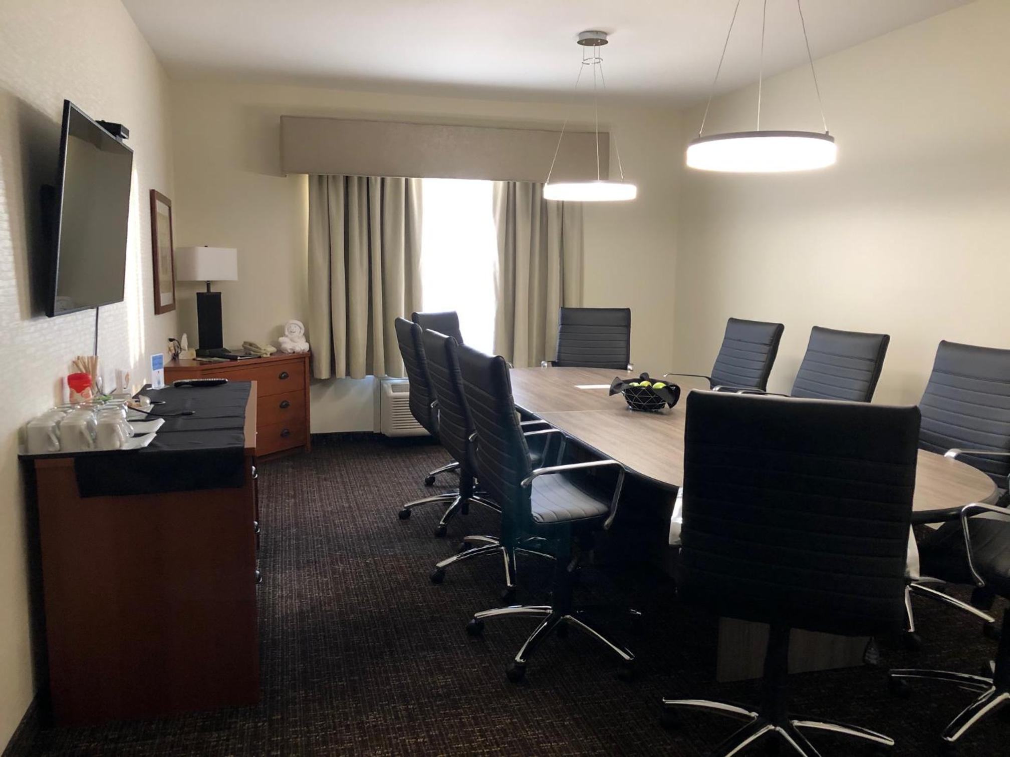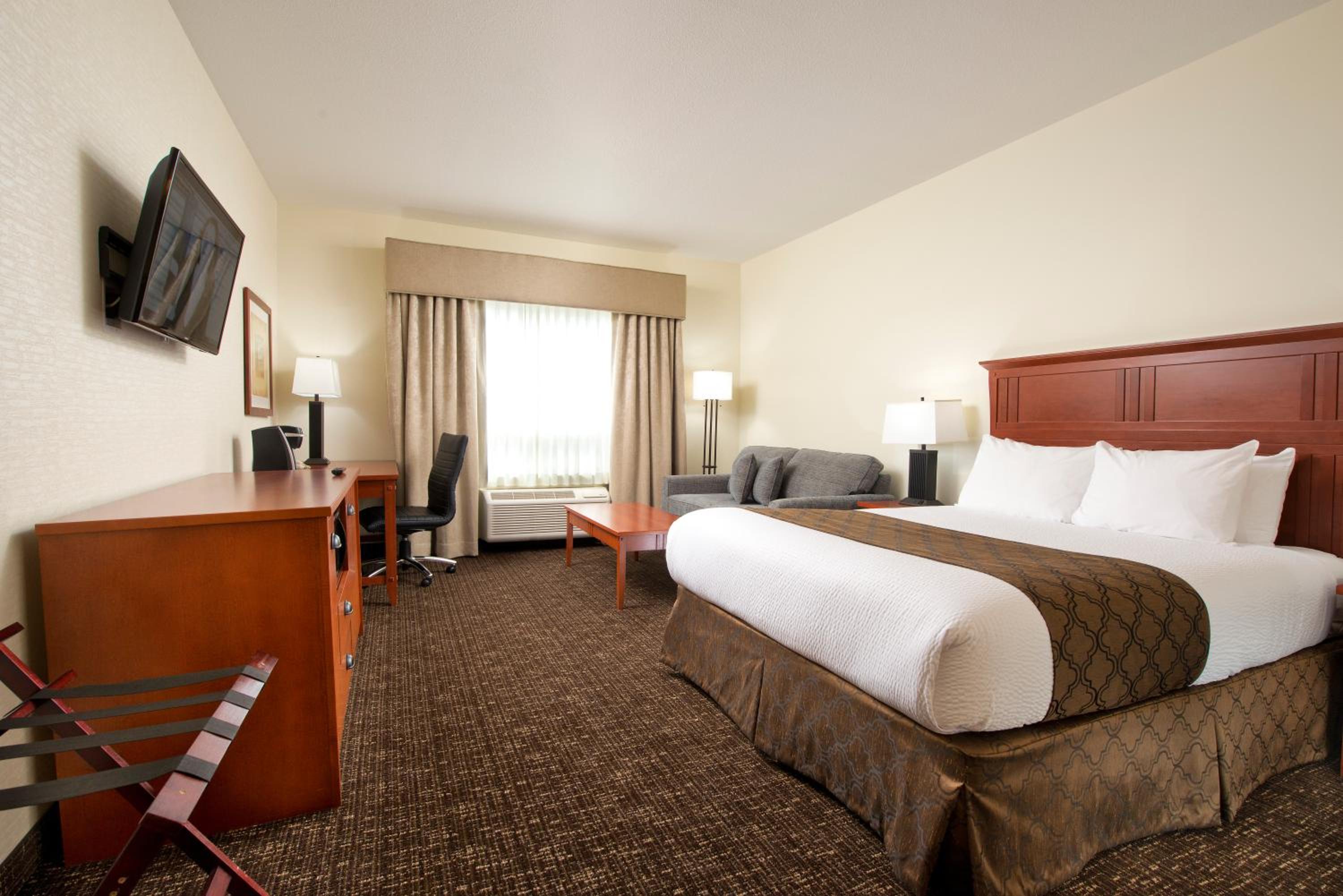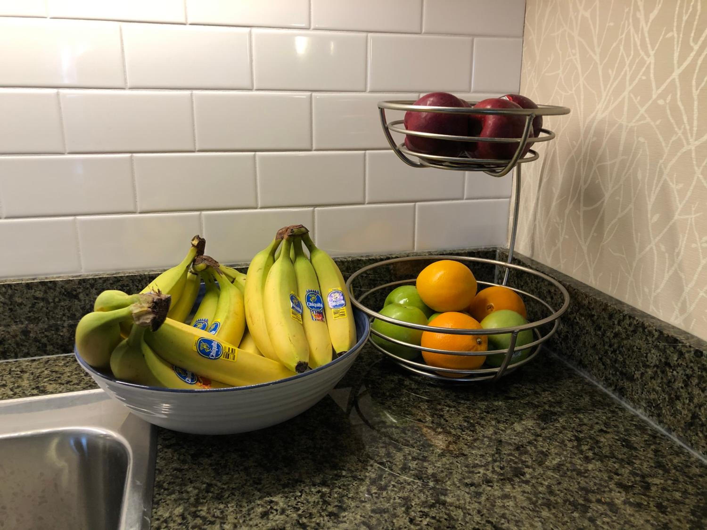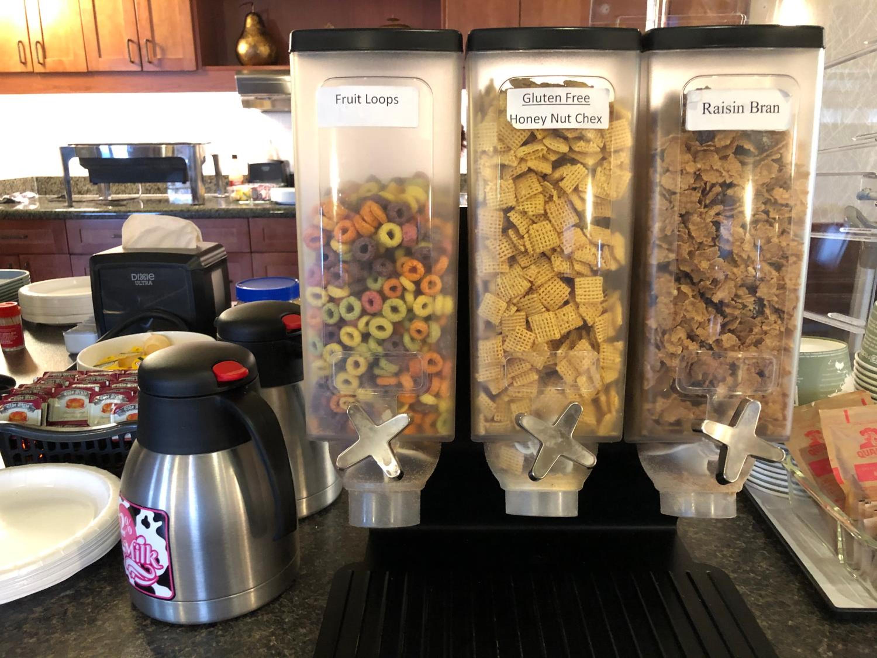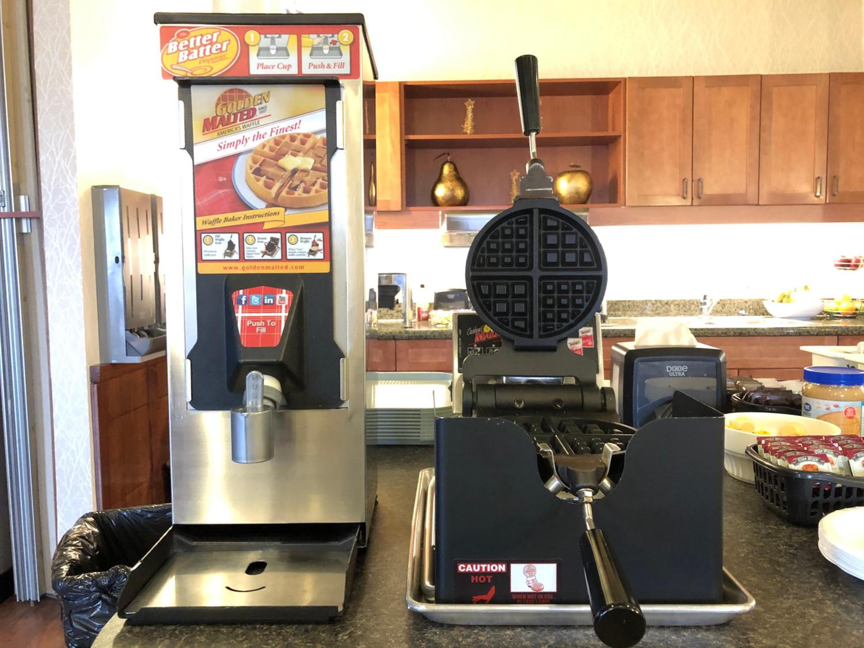 Start your day right with a complimentary breakfast offering a variety of options from fresh fruit to waffles. Enjoy the convenience of a mini fridge, coffee machine, and flat-screen cable TV in your cozy guest room.