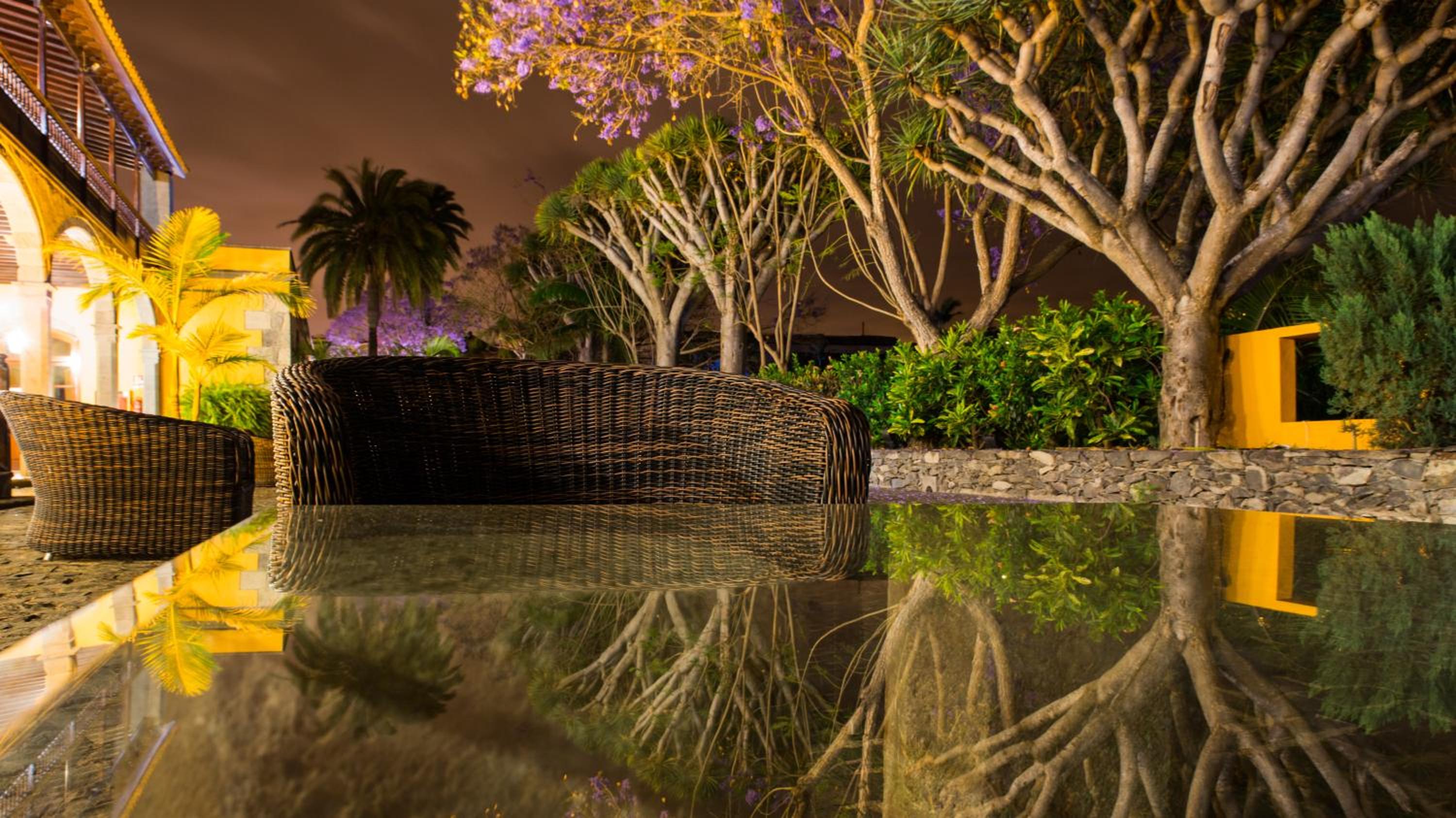 Rustic Elegance: Step into a converted Canarian farmhouse surrounded by banana trees, boasting original features like sloping wooden roofs and stone walls.