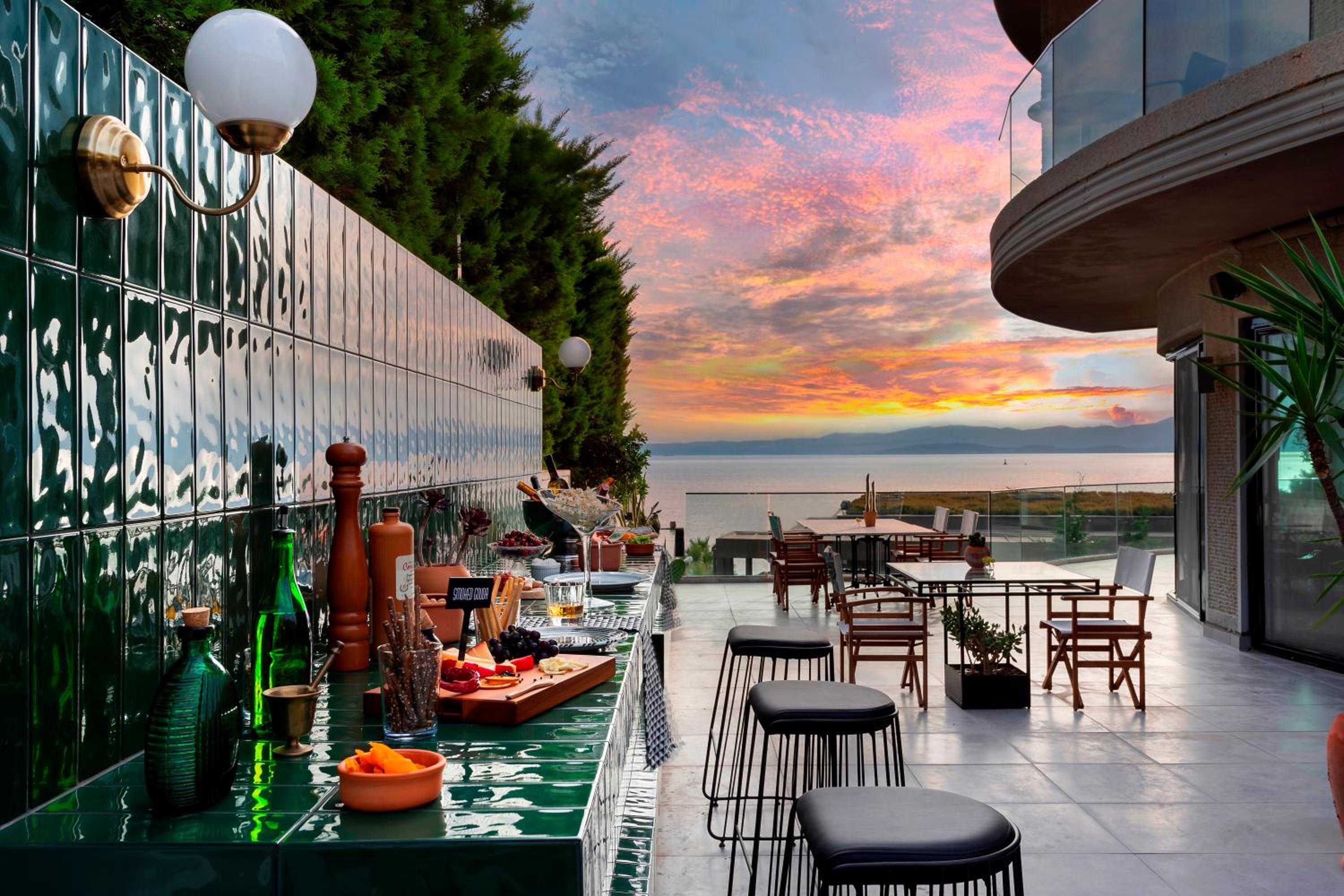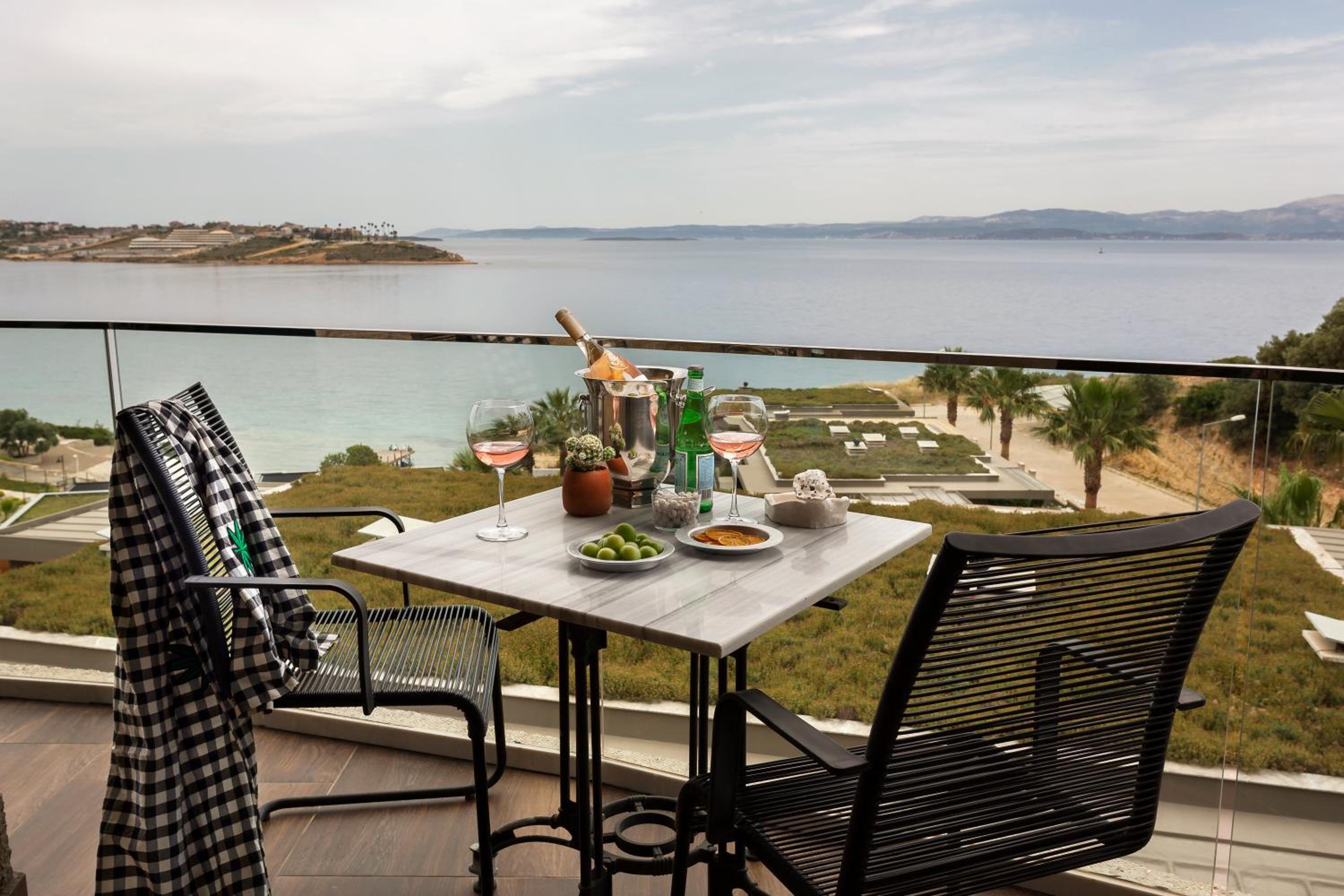The Sato Design Hotel, nestled on Cesme’s Ayasaranda Bay, offers individually decorated units with balconies showcasing breathtaking sea and mountain views.