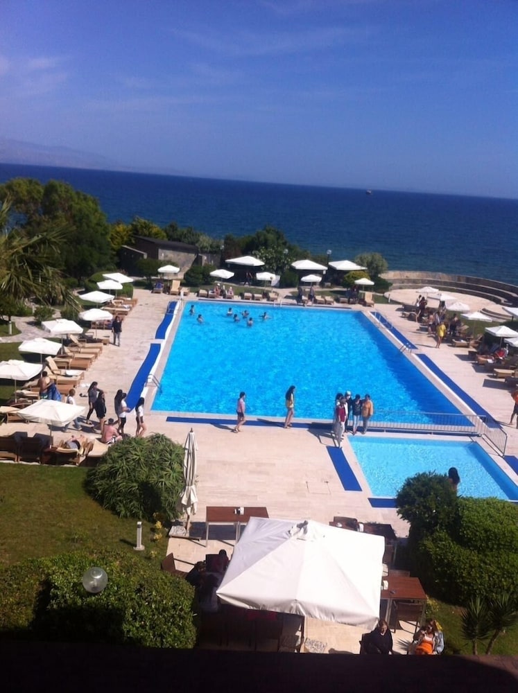 Çeşme otogardan taksi ile ~150 lira verip otele vardık. Personelden %100 memnunum. Çok yardımsever ve güler yüzlüler. Otel manzarası, bahçesi havuzu çok hoş ancak deniz çok dalgalı, çok rüzgarlı keyifle yuzemiyorsun ve denizdeki otlar her yerde. Çöp değil denizin yosun gibi şeyleri. Durgun denizi tercih ederim. Deniz hariç bir gece kalıp dinlenip keyif yaptım. Güzeldi.Yemeklet de iyi.