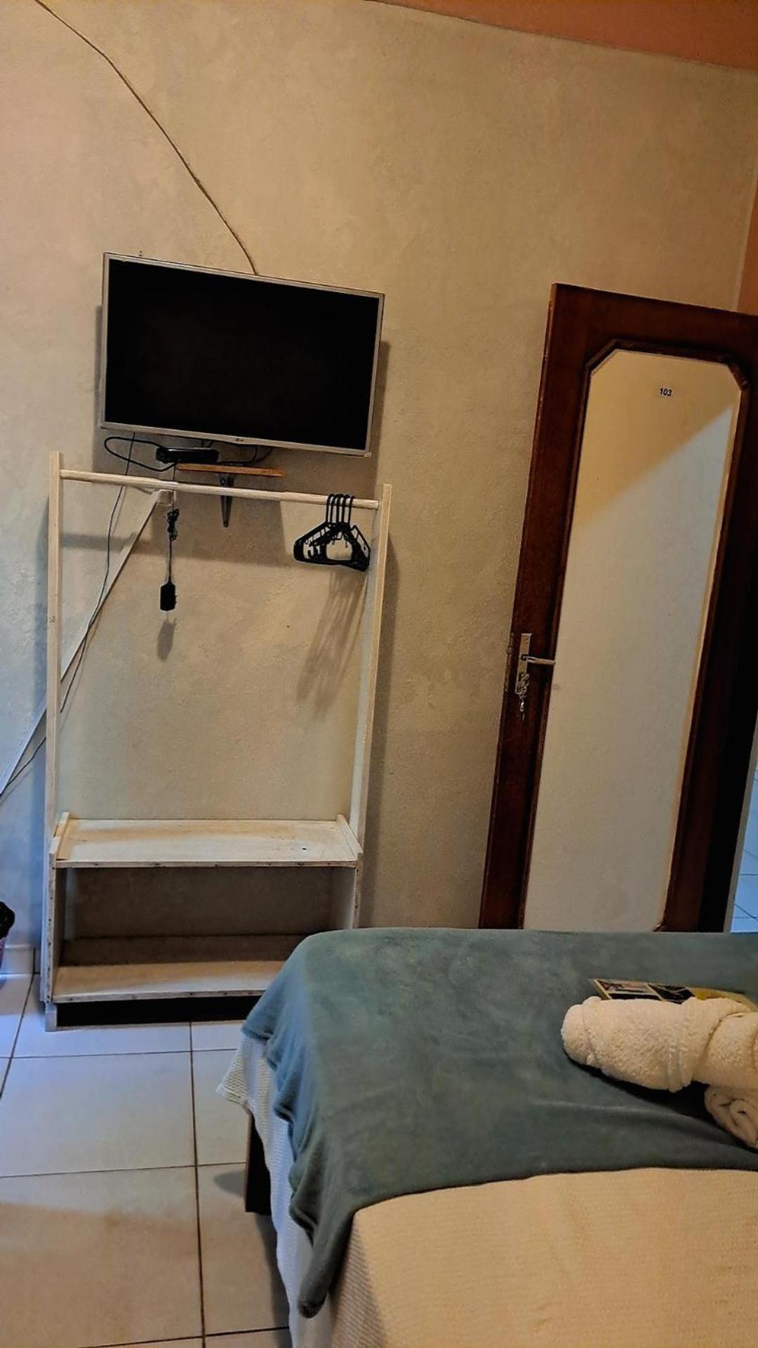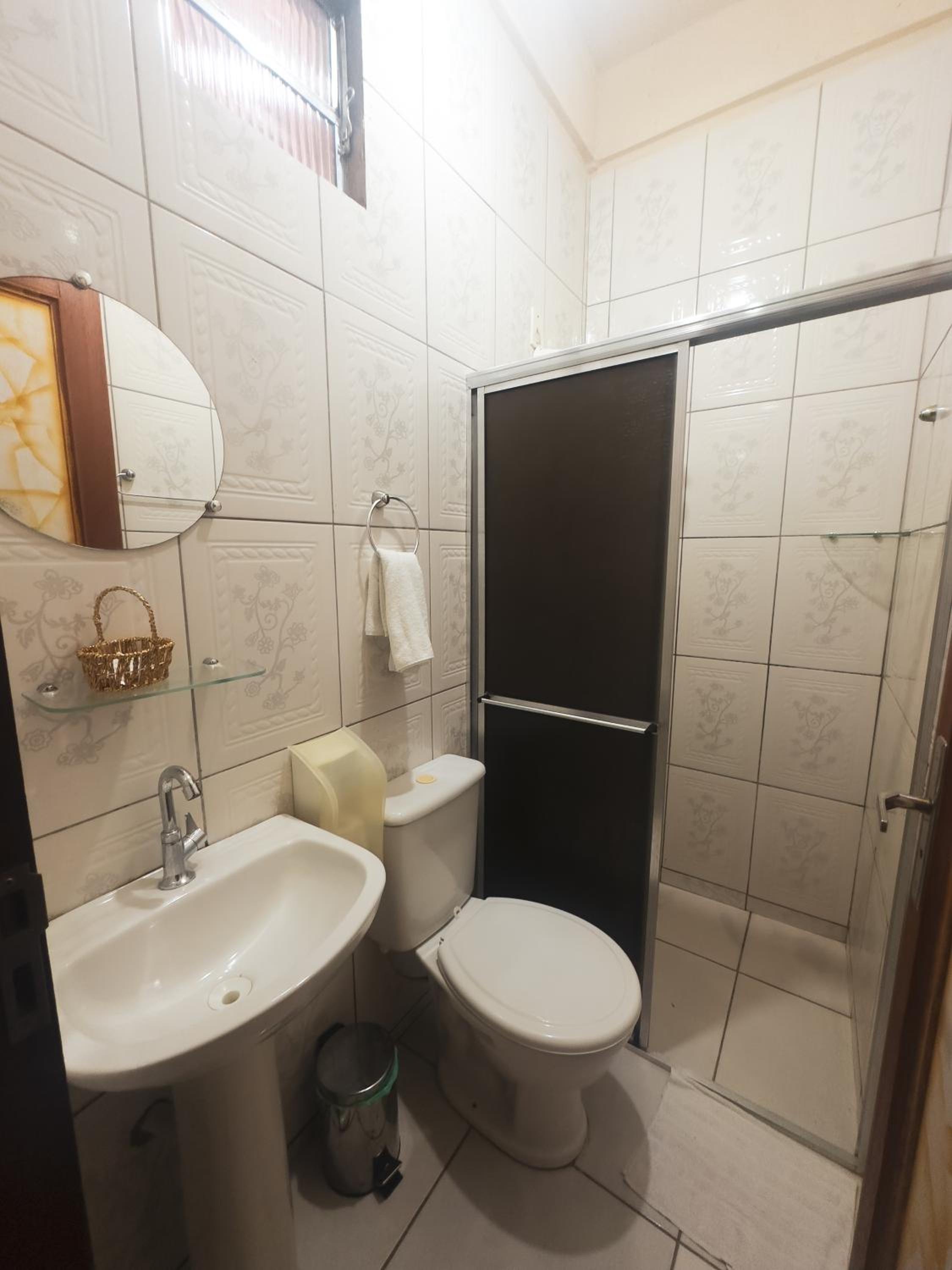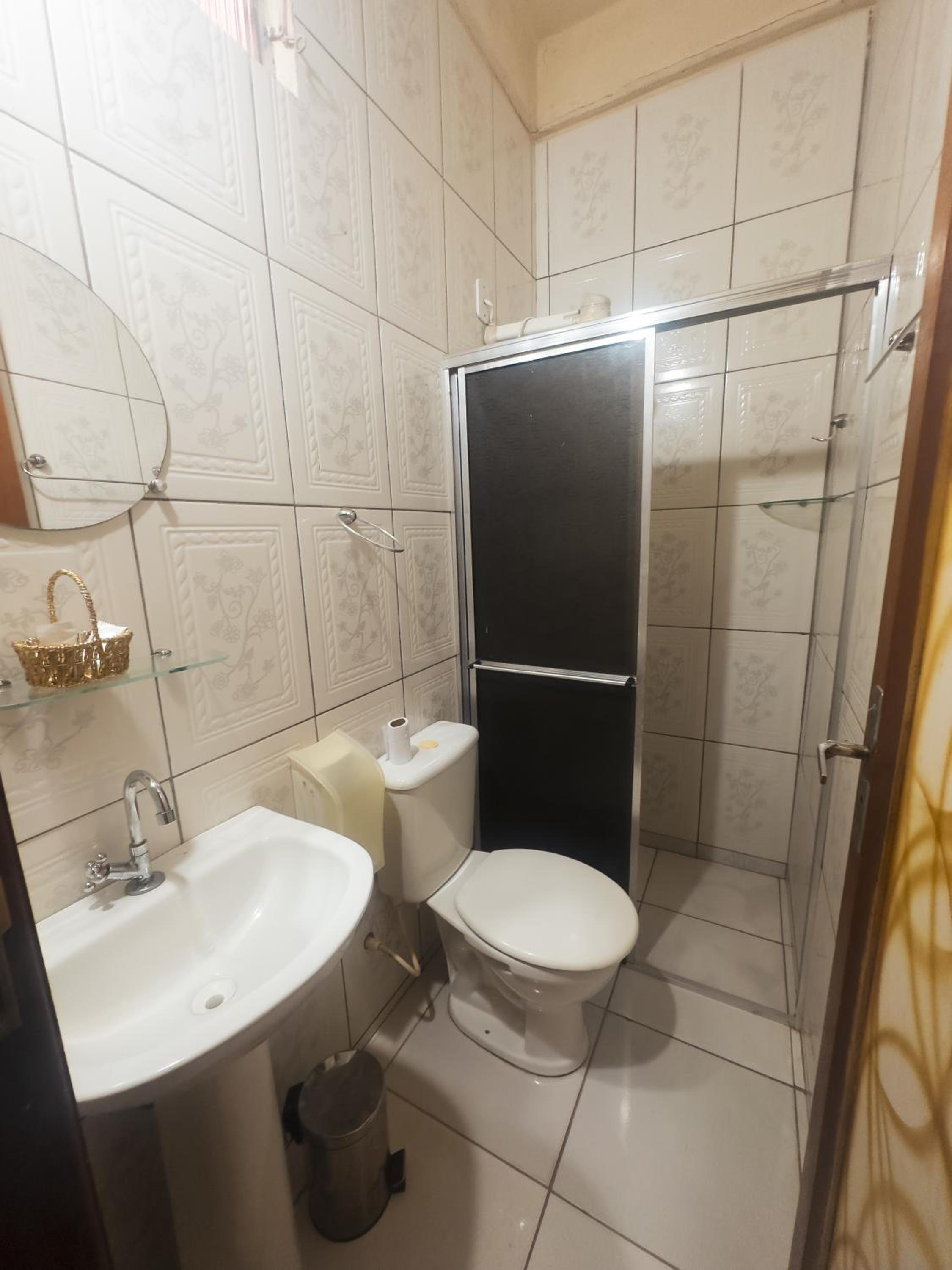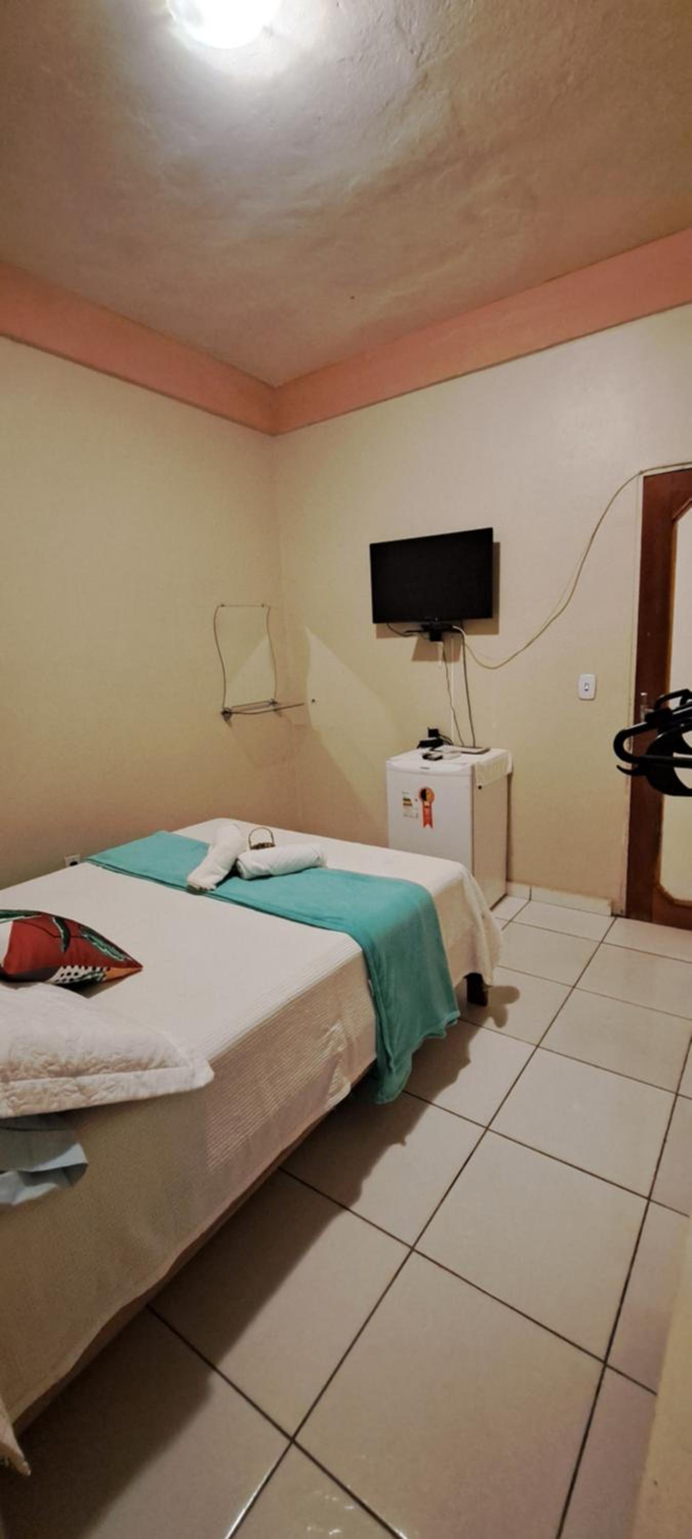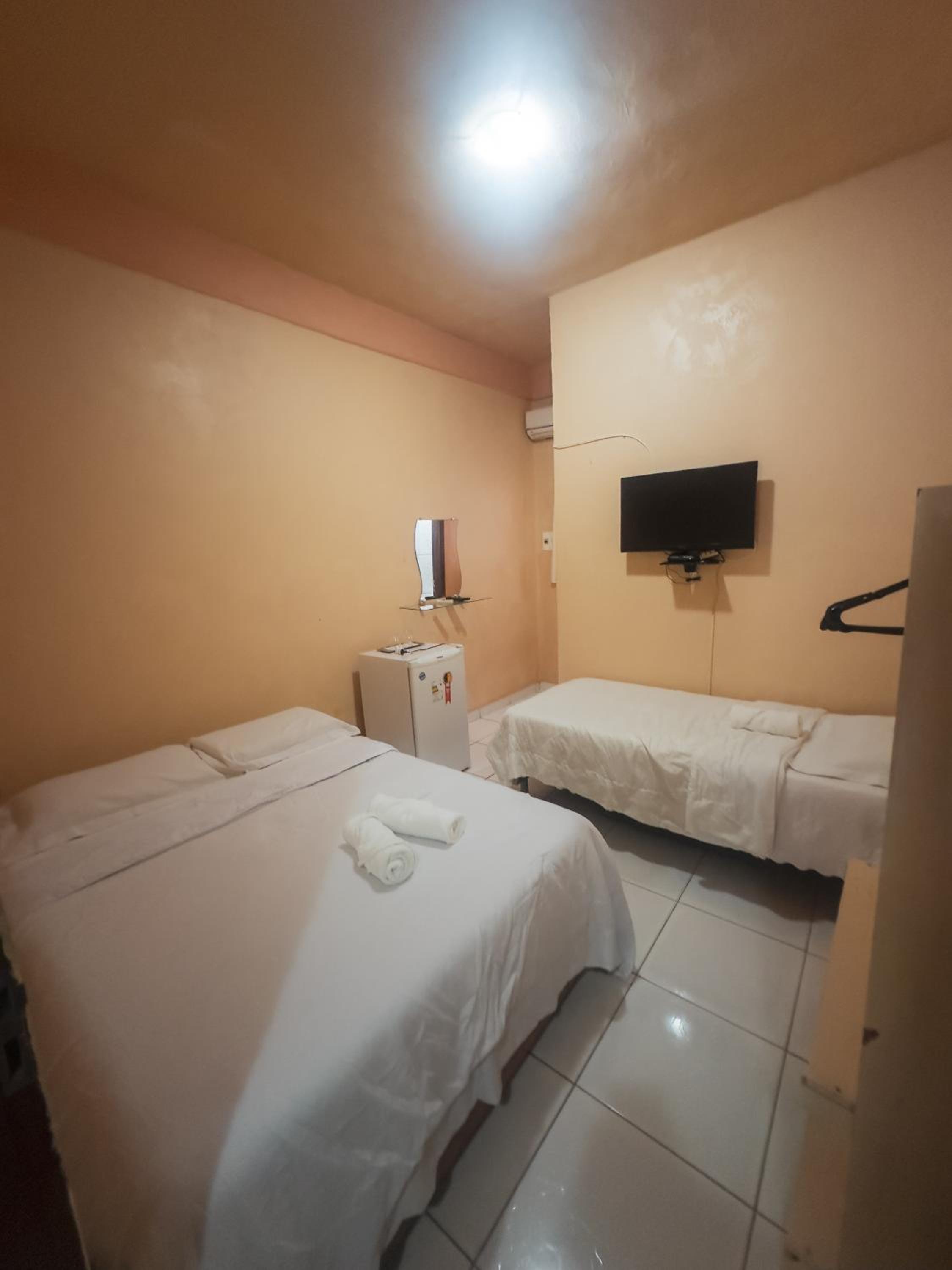 O quarto com tamanho bom mas tudo muito antigo, inclusive o banheiro, achei escuro. Precisa de uma revitalização.