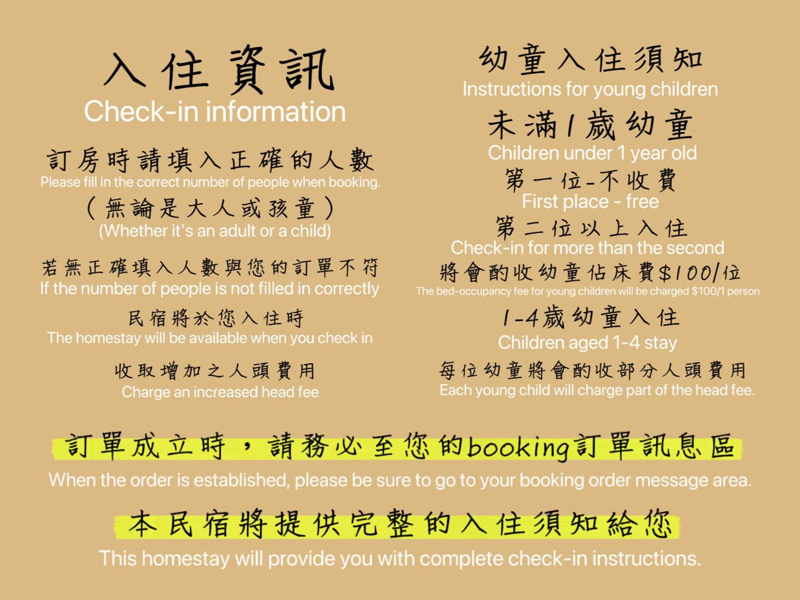 Children from 1 year old to 2 years old stay for TWD 200 per person per night when using an existing bed.