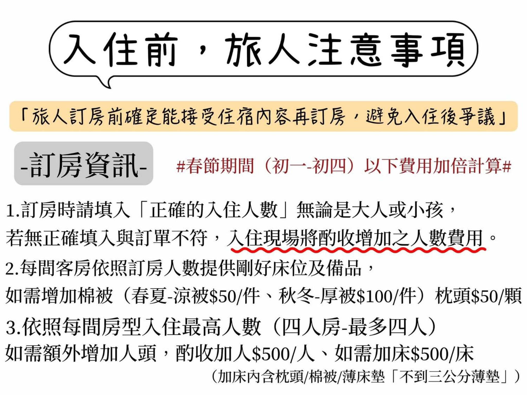 Children from 3 years old to 4 years old stay for TWD 300 per person per night when using an existing bed.