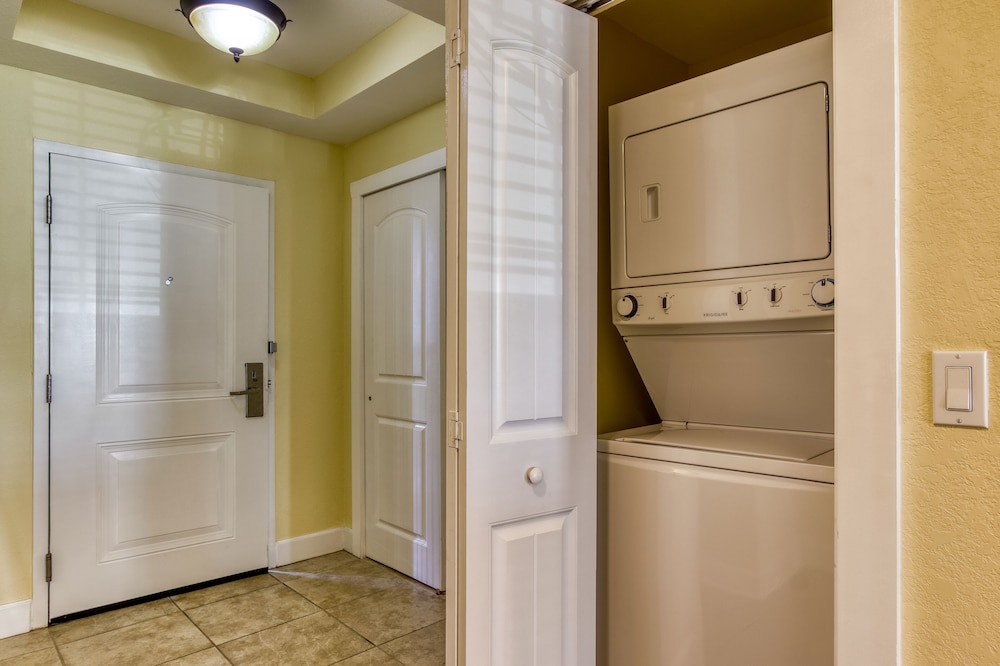 The 1 bdrm condo was serviceable. Nice space inside. The beds were very loud. Need replacing. Liked view on balcony to waterpark. TV screen was pink, but maintenance brought in a new one quickly. That was nice. The floors in condo were terribly dirty. Our feet were black by the end of the day. Seems that they sweep unit but don't mop them. For the price expected something a little more upscale. All in all, still had a good time though.