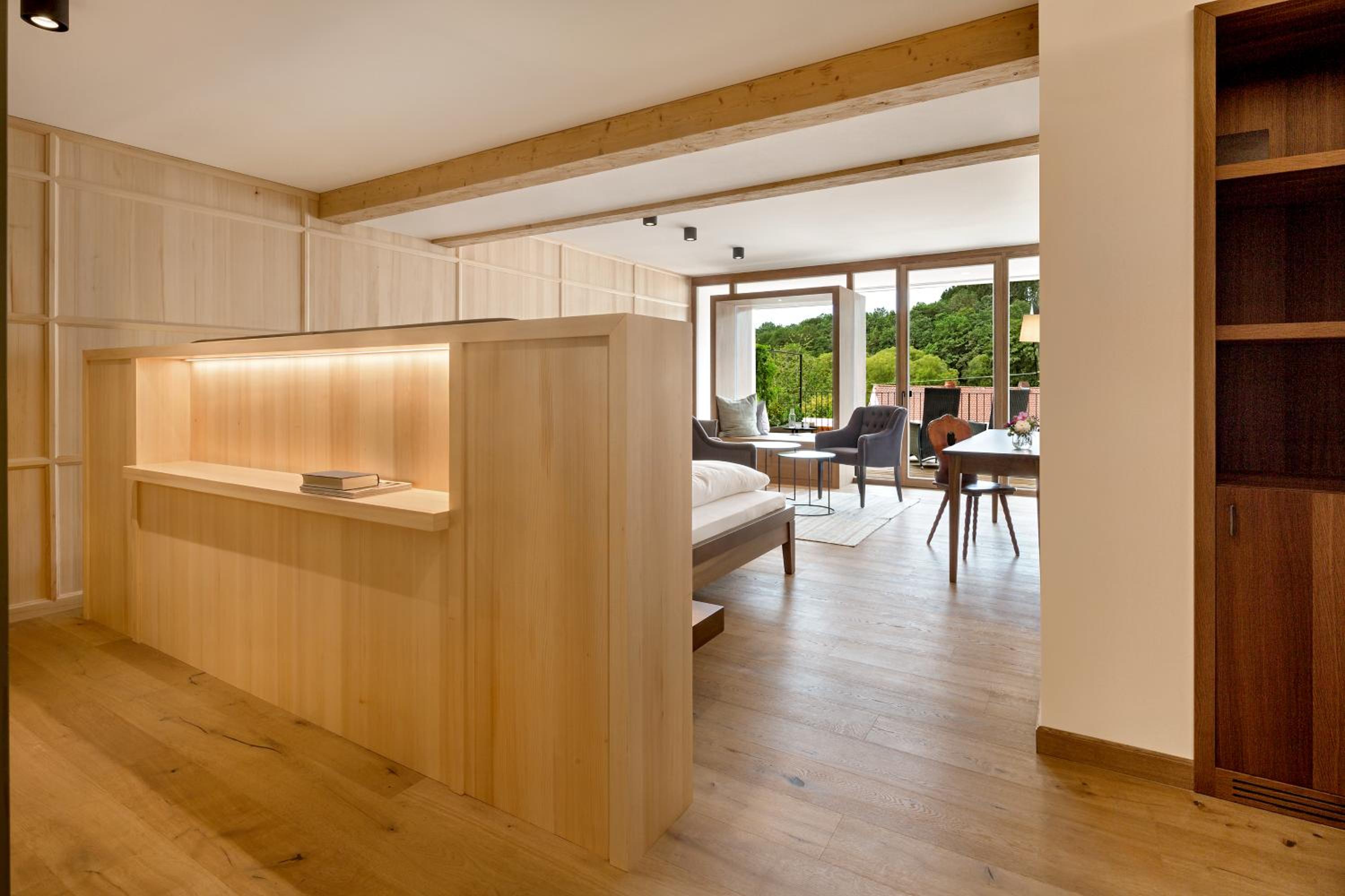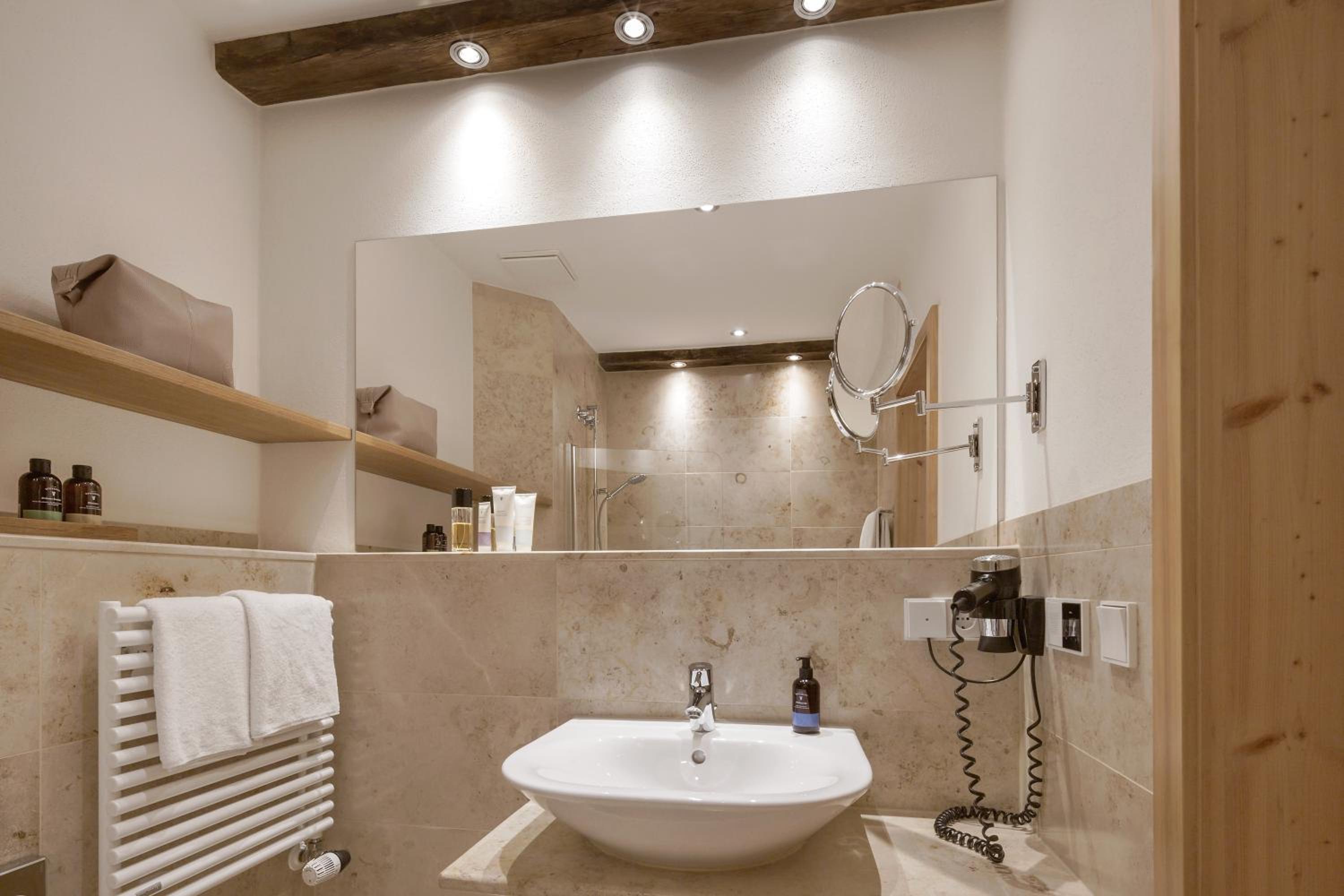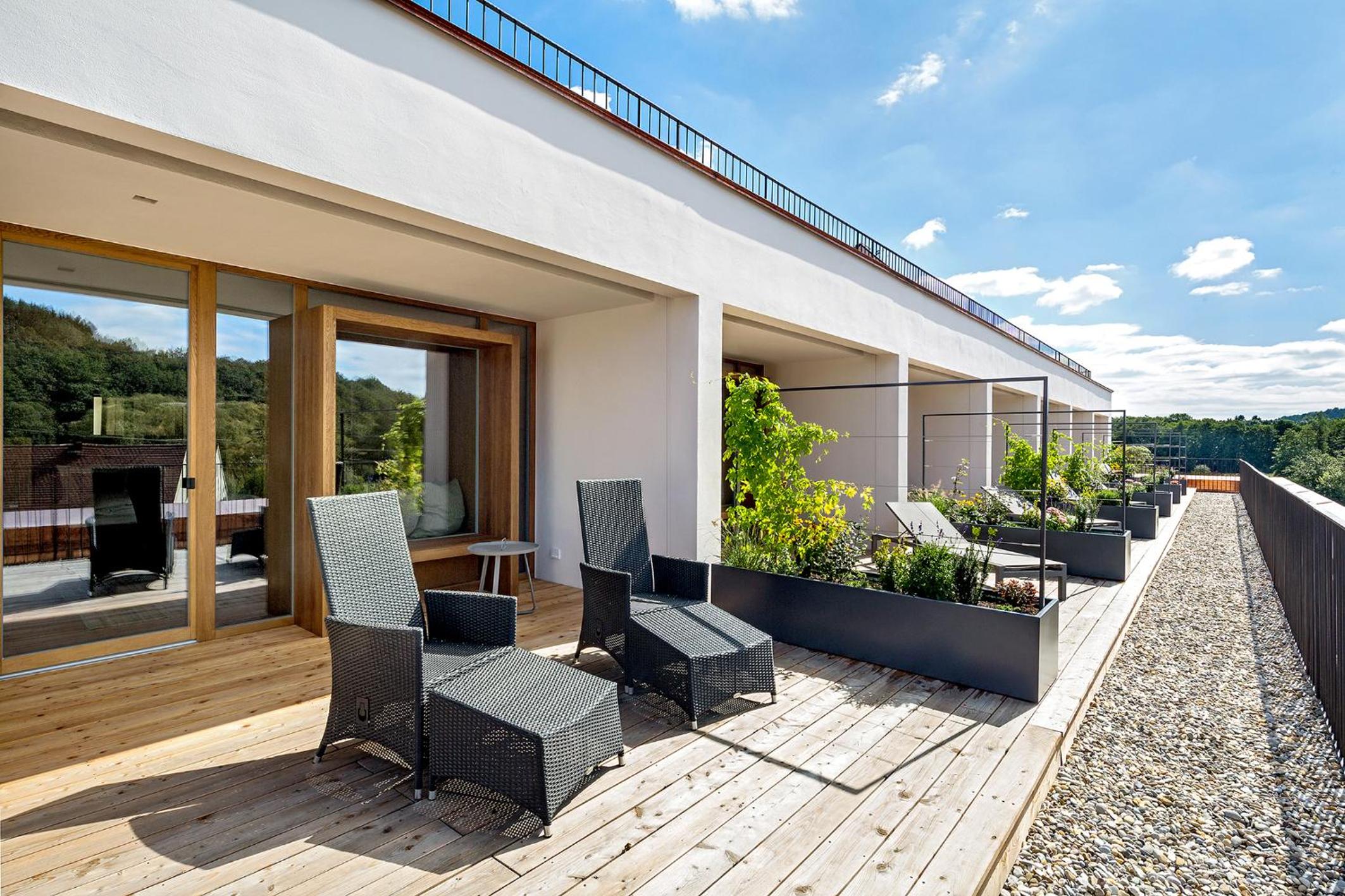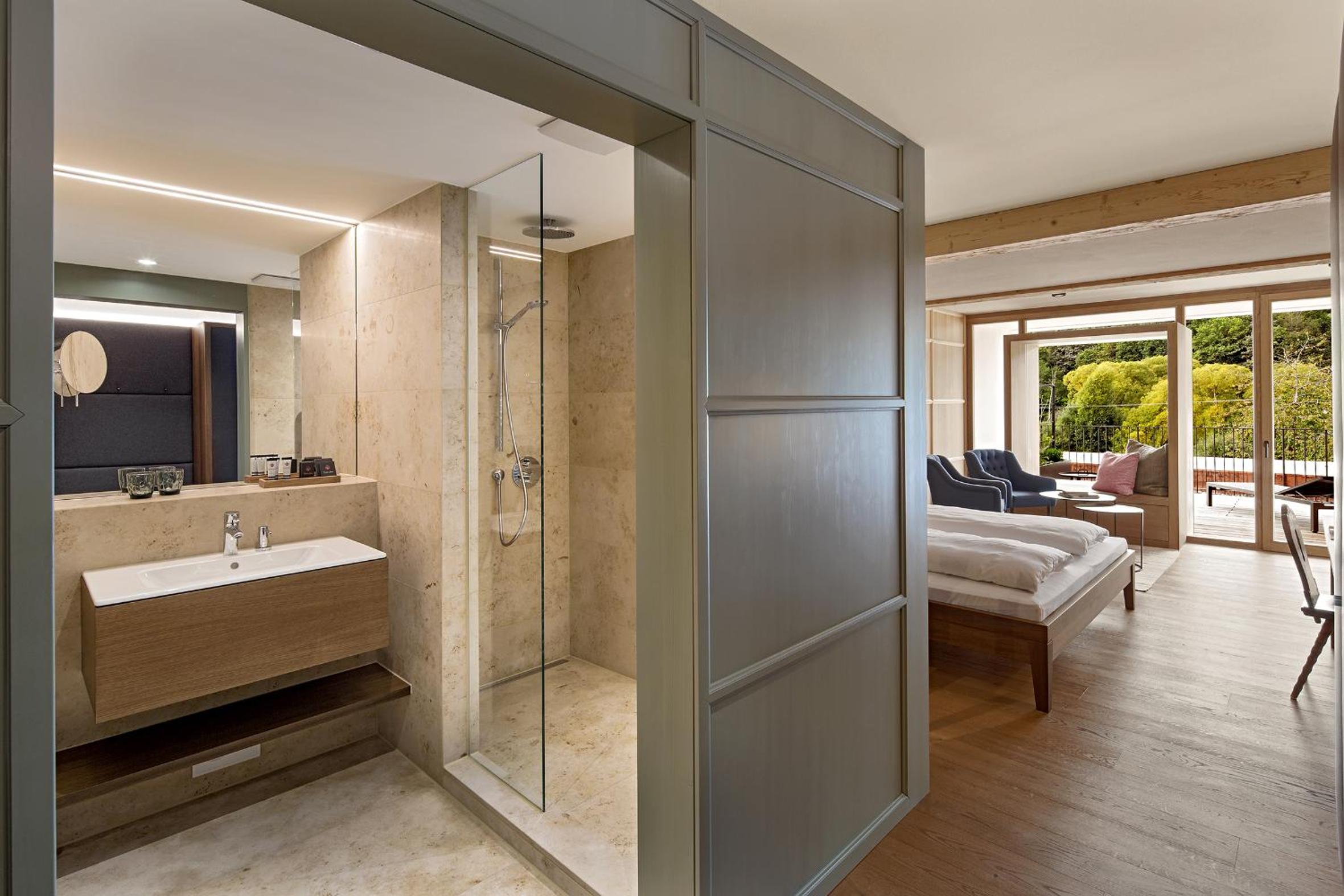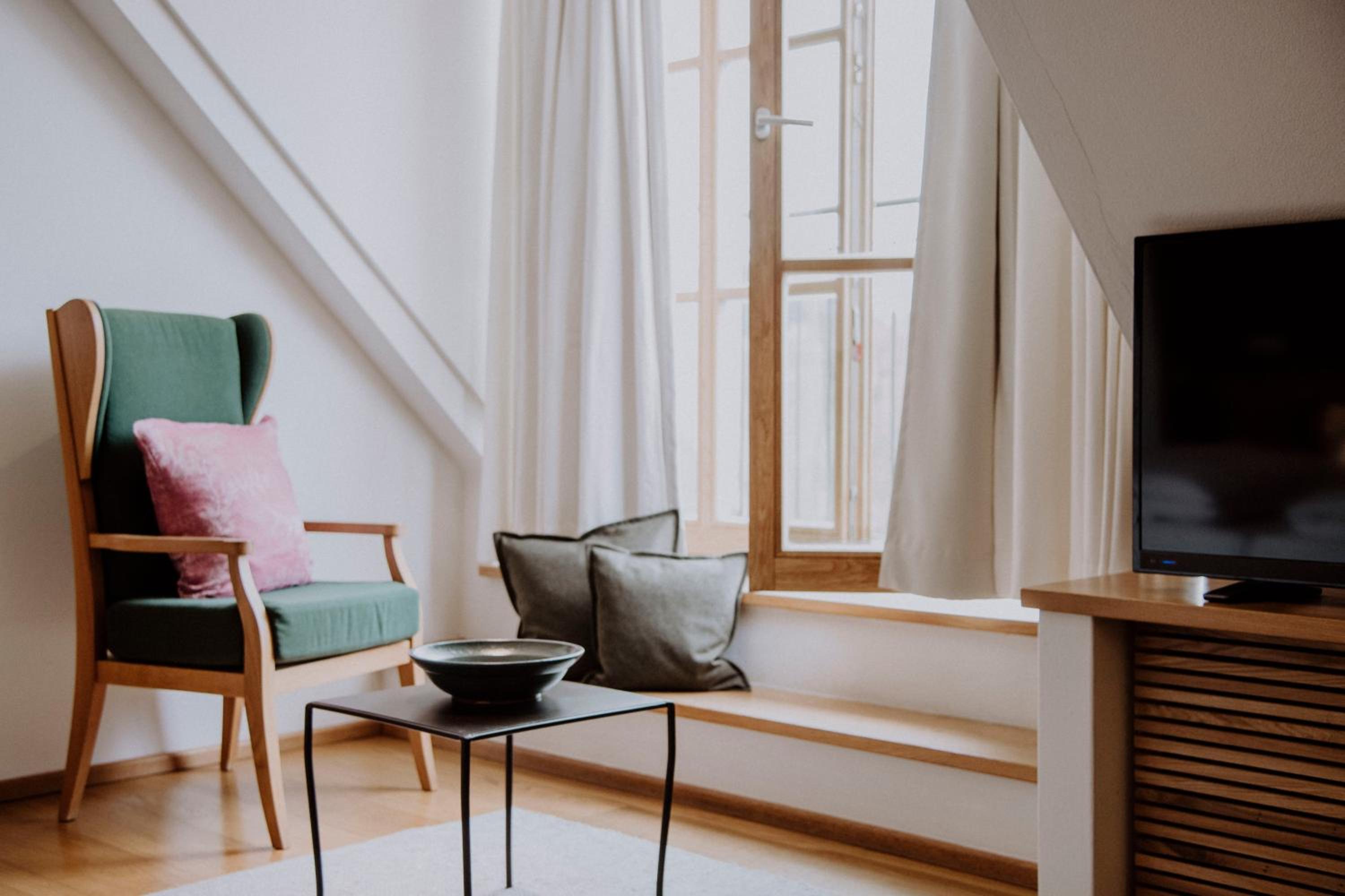 Geschmackvolle Einrichtung in historischem Gebäude und modernem Wellnessbereich mit beheiztem Ausenpool . Top Massage.