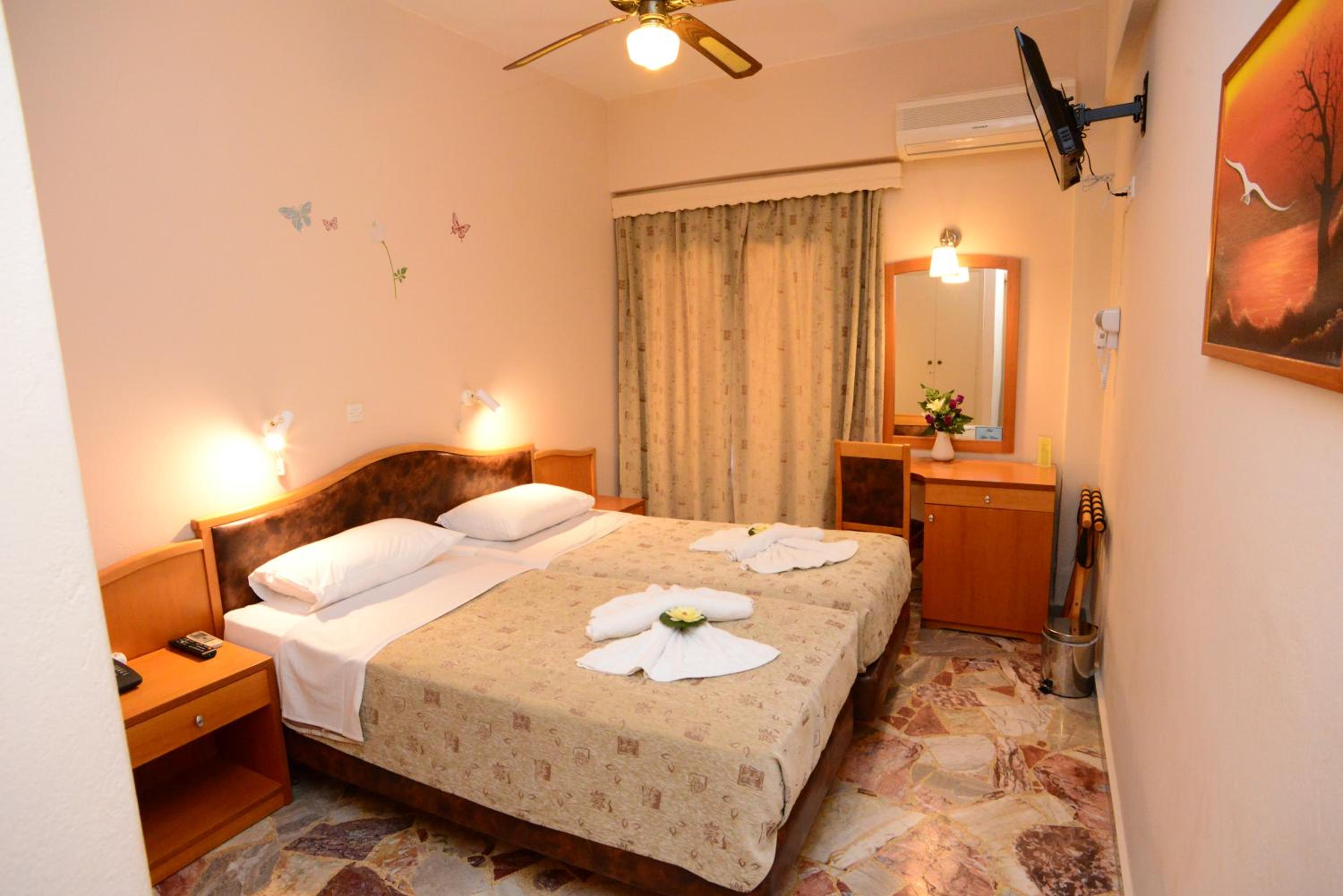 The air-conditioned rooms at Sappho Hotel are tastefully furnished with wooden décor and feature en-suite bathrooms. Each room is equipped with a TV, satellite channels, and a mini fridge for your convenience.
