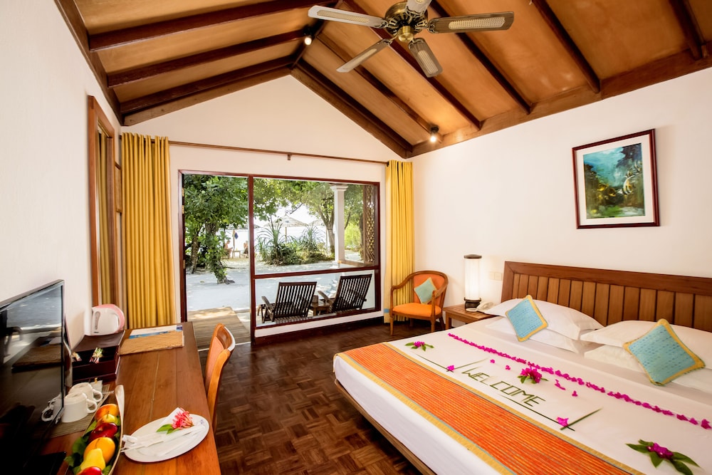 This resort is undergoing renovations. Covid hit the Maldives hard and now people are coming back and so are the resorts. This resort has some dated aspects but it is still beautiful. The island itself is beautiful!!!! it is lush it is intimate and it has the best snorkeling reef I have ever seen and it was easily accessible from the beach. I stayed in one of the over the water villas and it was very nice. The bed was not the most comfortable but the room was nice and the bathroom had obviously been remodeled. Some of the other finishes and furniture in the room seemed dated. The deck over the water gave a great view and you can go straight to the reef from your villa. It is a great spot to snorkel and swim from. there is a nice sand bar that is with in the middle of the villas The island is not very large you can go from one end to the other in less than 15min. If you get Full Board or Half Board it is buffet food only no drinks, not even water. I would suggest upgrading to an all inclusive plan. The water in your room is included and it can bring it with you around the island.