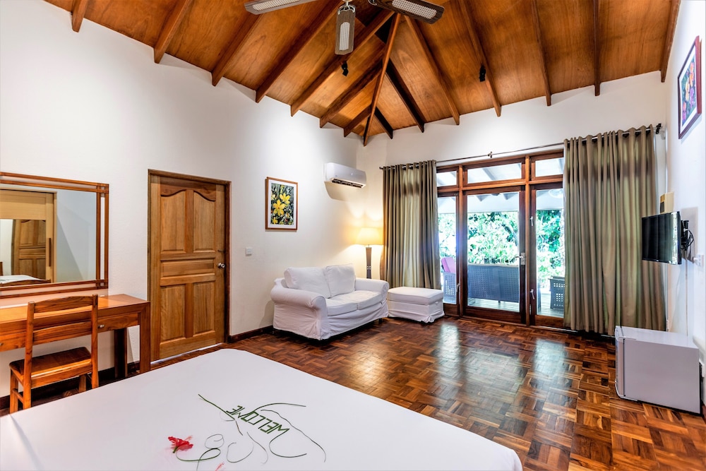 The resort staff was super friendly. The house reef was amazing to snorkel and dive. The food was excellent with so many choices for each meal. The all inclusive package made meals and alcoholic beverages super easy to select from. The sunset deluxe villa was very comfortable for three adults and was perfect to have privacy and easy access to the sand and water. The seaplane ride gave spectacular views of the atolls and brilliant shades of blue. The pool is pretty small and better suited for children wanting a break from the ocean. Overall it was a wonderful experience on a natural island with amazing sea life.