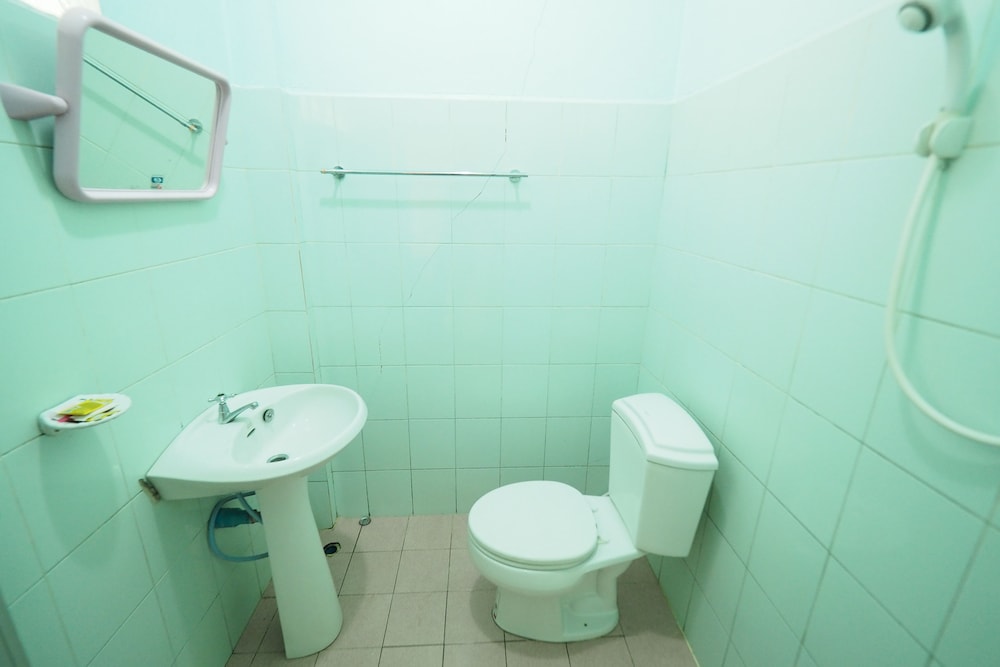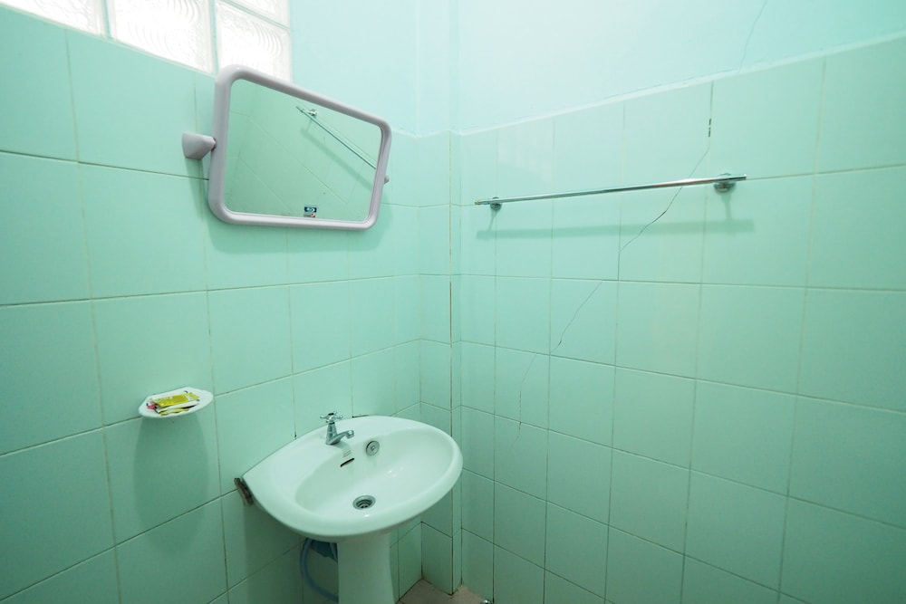 ห้องน้ำอ่างล้างหน้าไม่ได้ยึดกับอะไร วางไว้บนแท่นเฉย ๆ เอามือวางไว้เกือบหล่นแตกด้วย