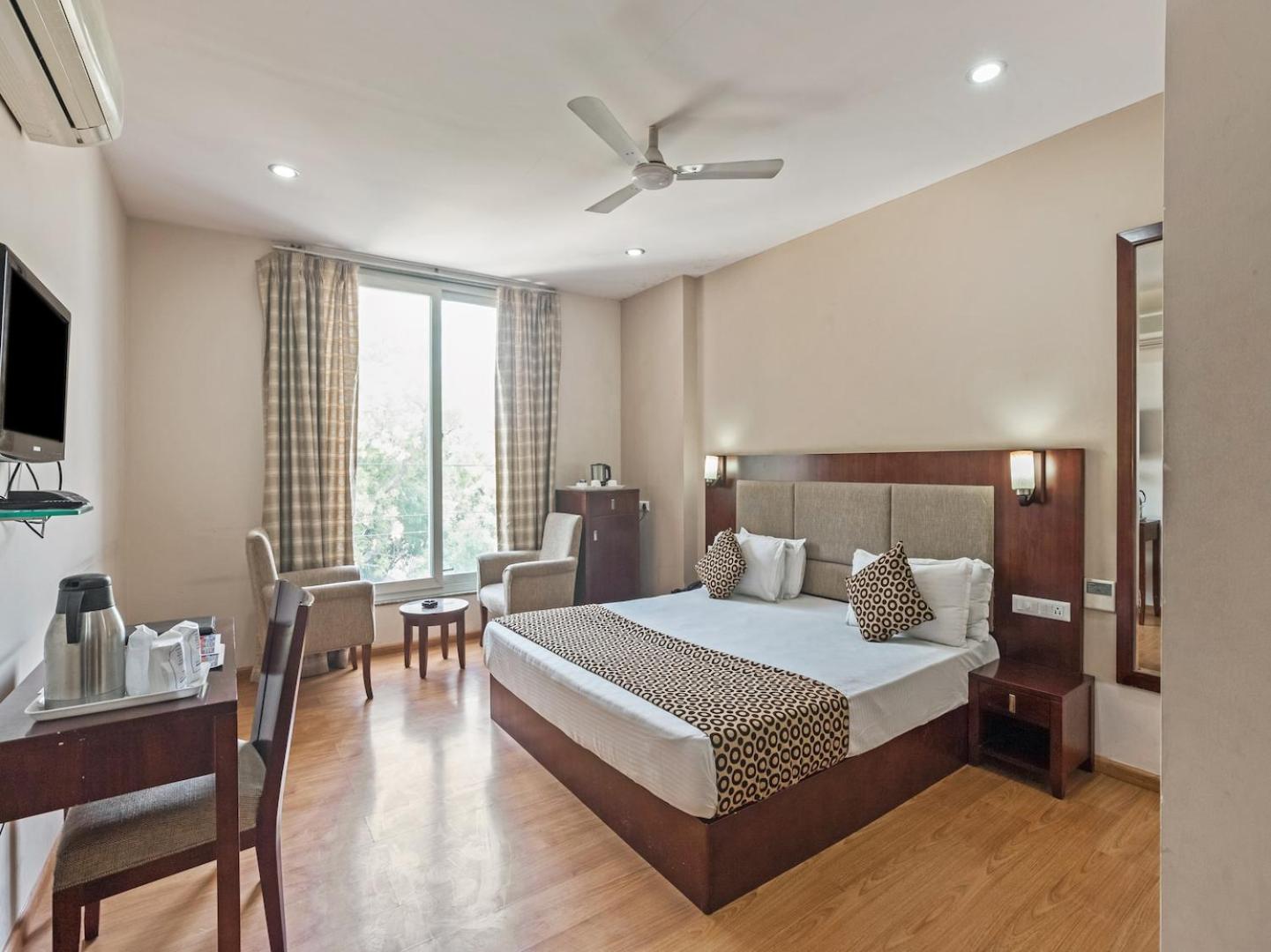 Experience comfort in the fully air-conditioned and beautifully decorated rooms equipped with modern amenities like cable TV, en suite bathroom, and some with tea/coffee making facilities, ensuring a pleasant stay.