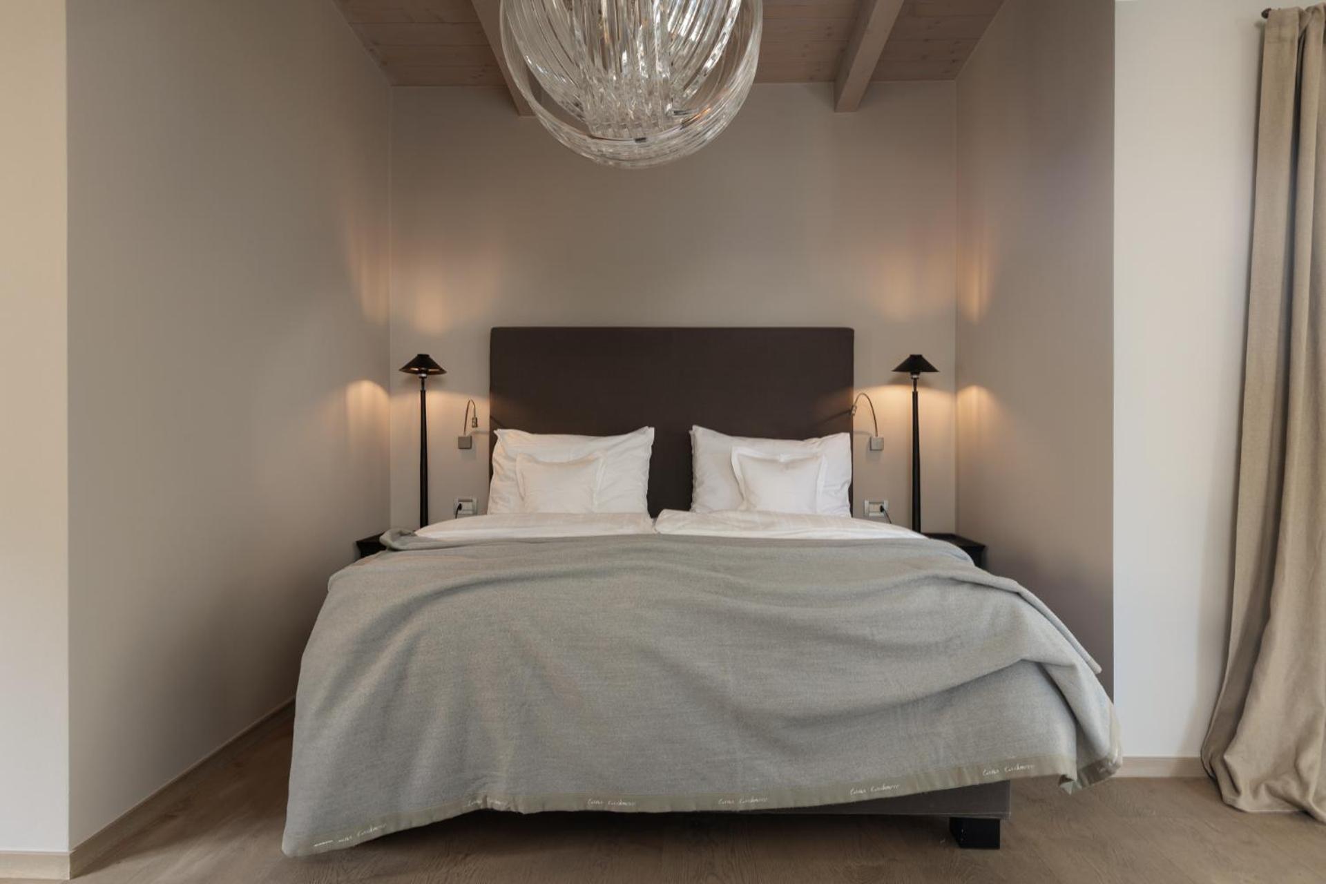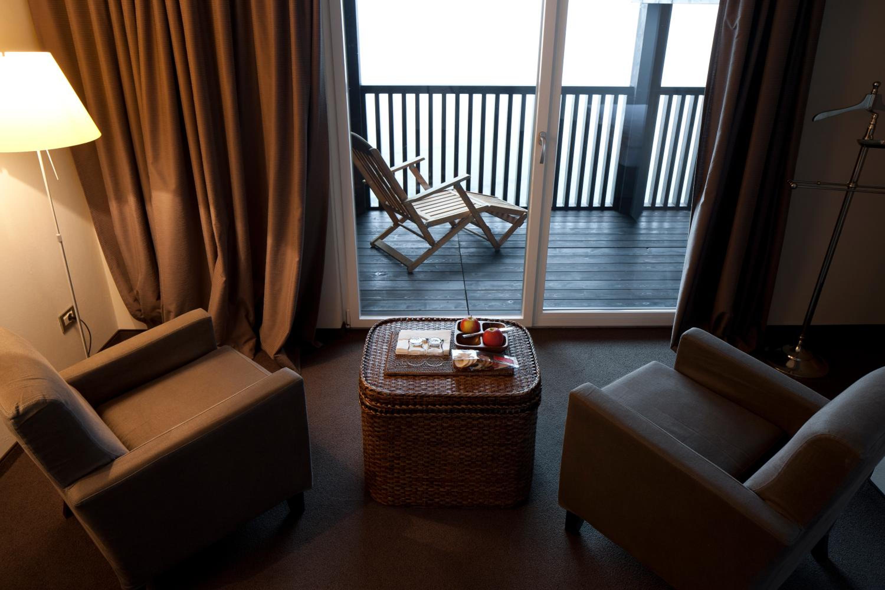 The hotel features elegant rooms with modern amenities including a TV, minibar, and free Wi-Fi. Some rooms offer balconies with stunning mountain views, and each private bathroom is stocked with luxurious bathrobes and slippers.