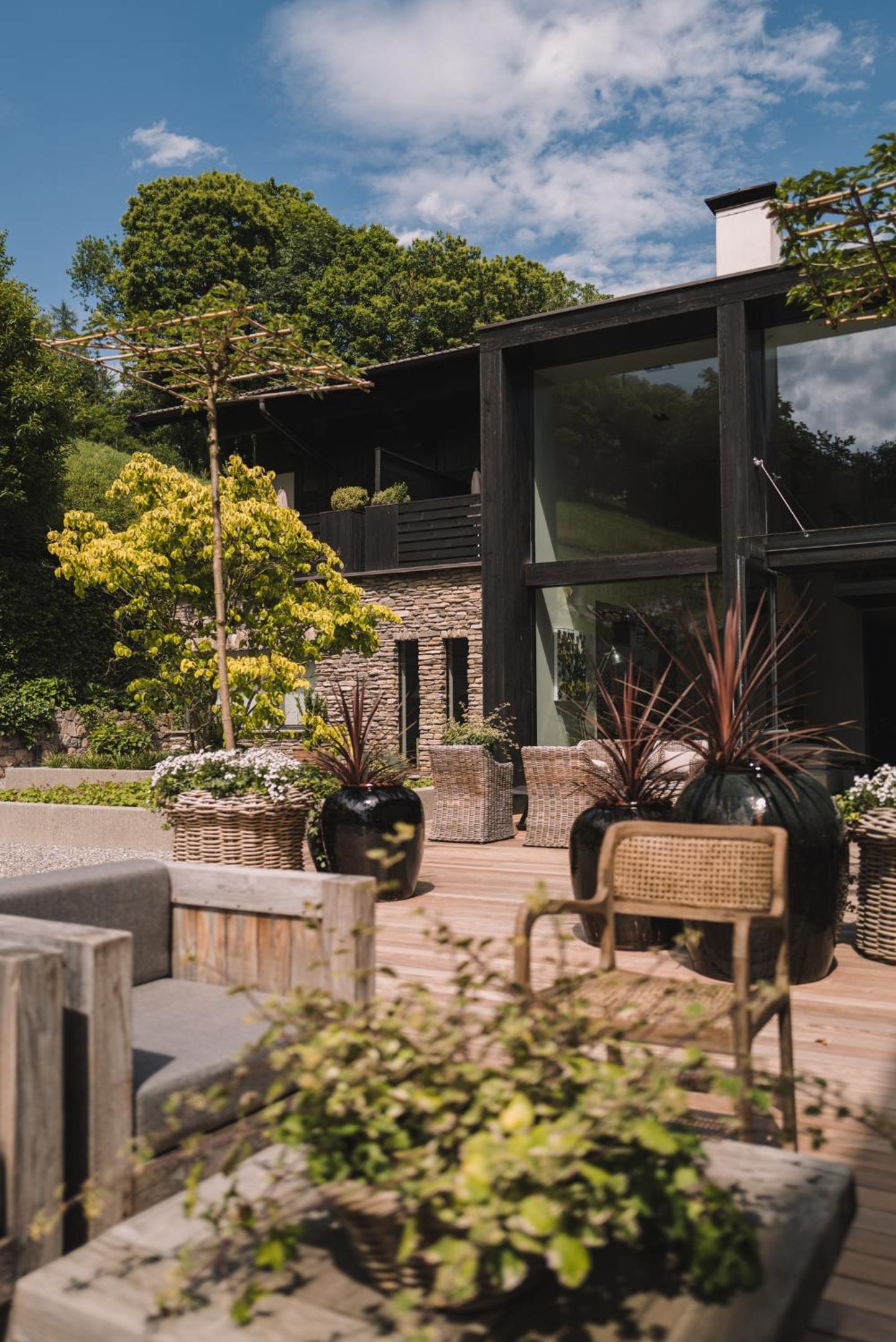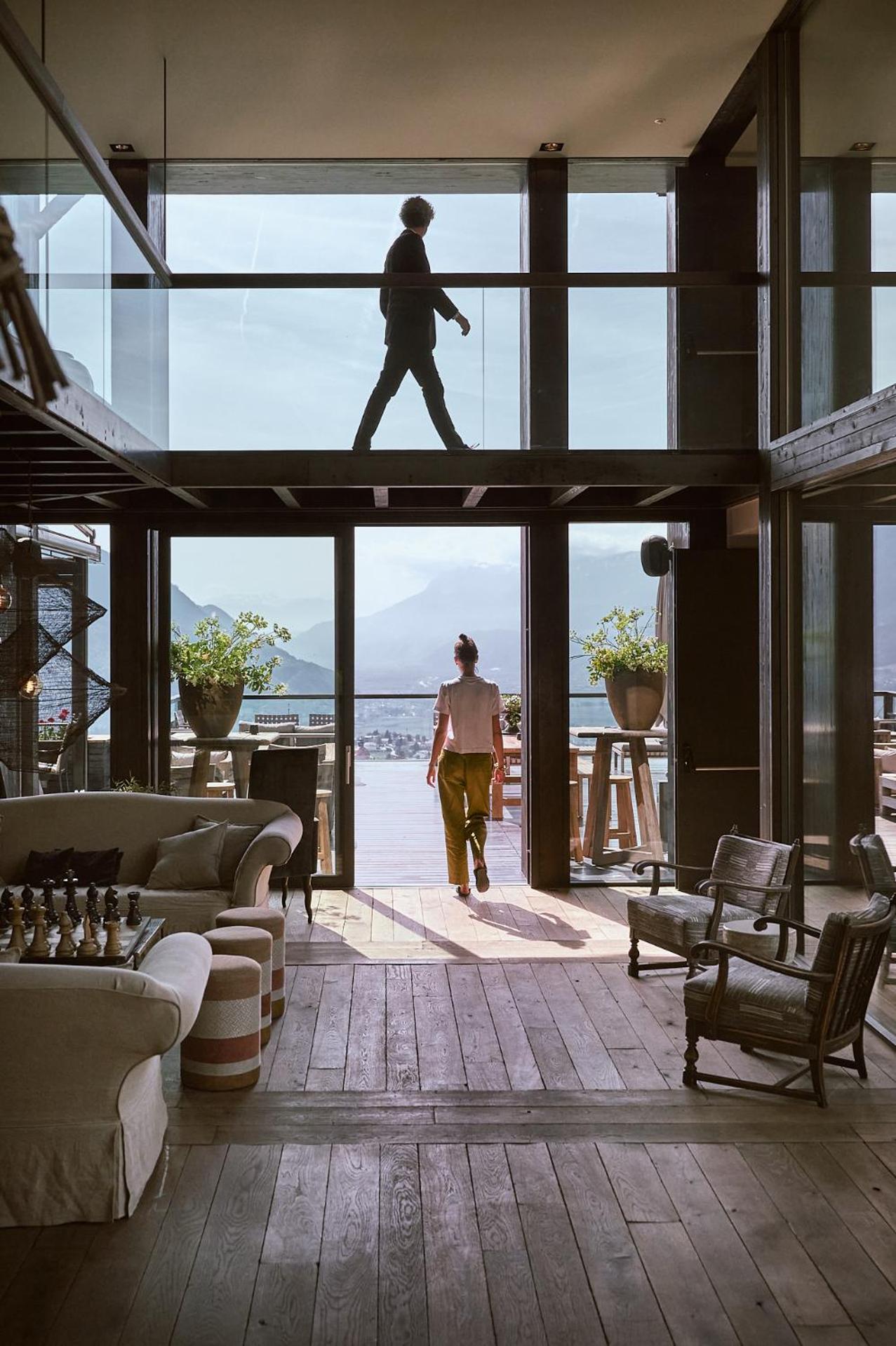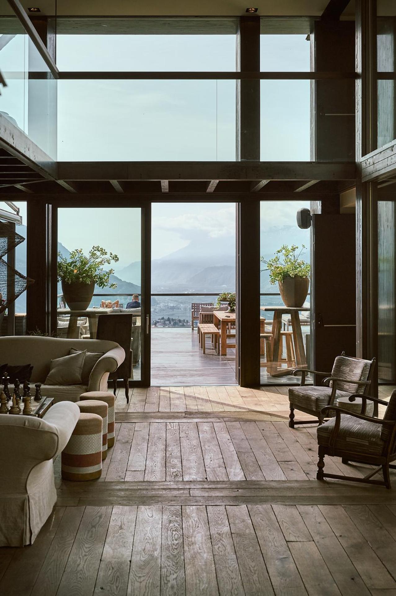 Die Panoramaterrasse mit herrlichem Blick und die Deko mit Kaminfoyer im Foyer.