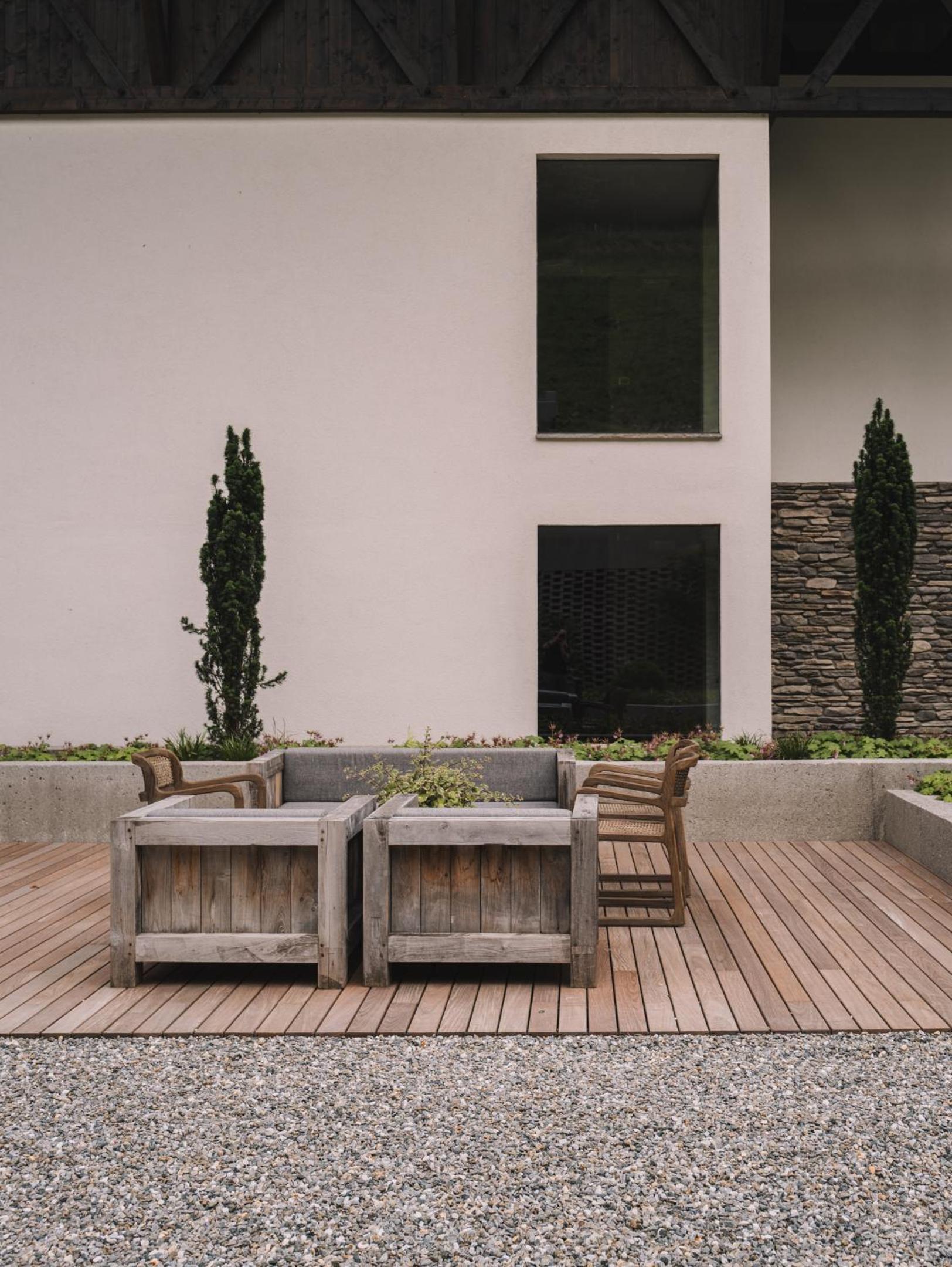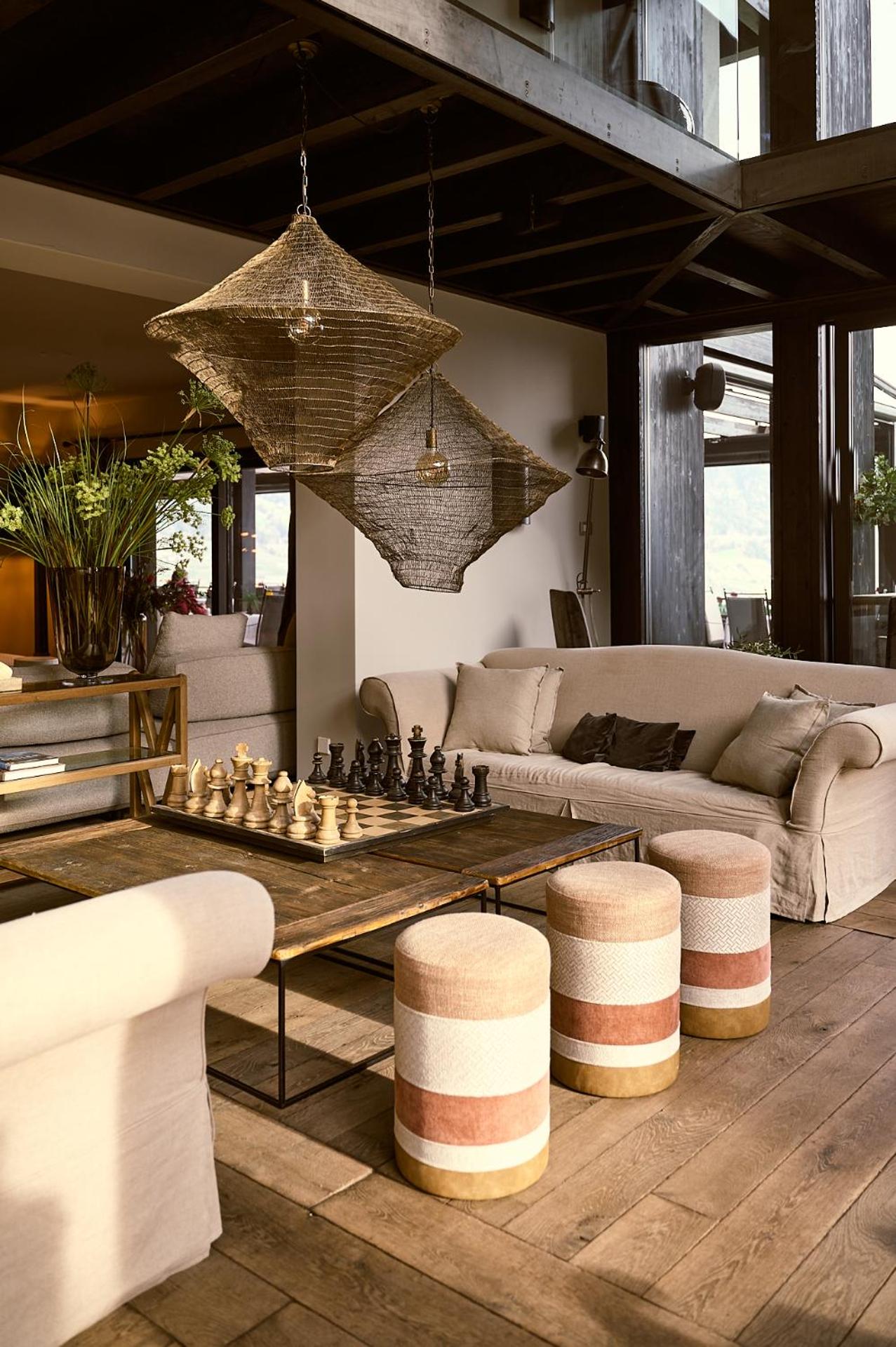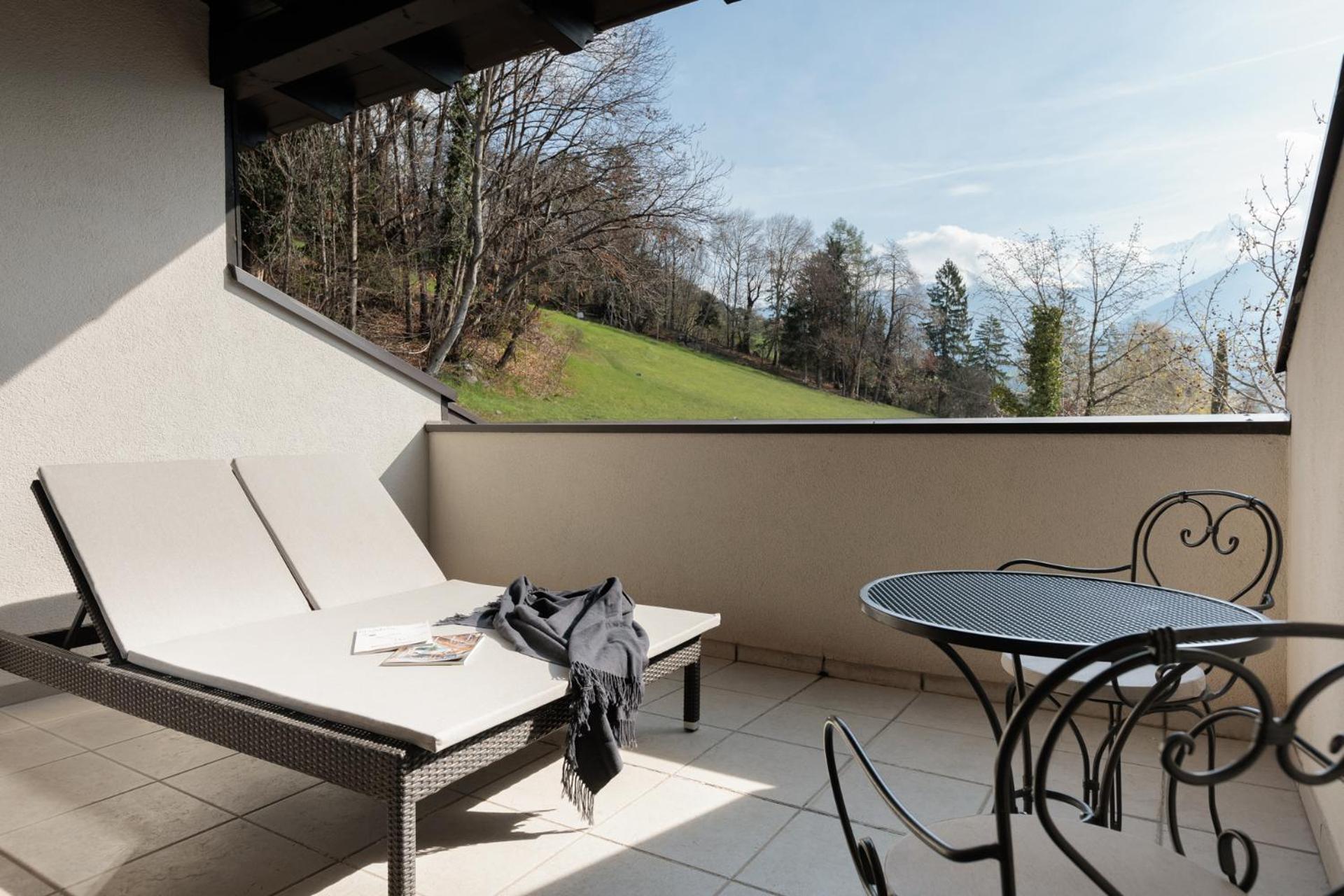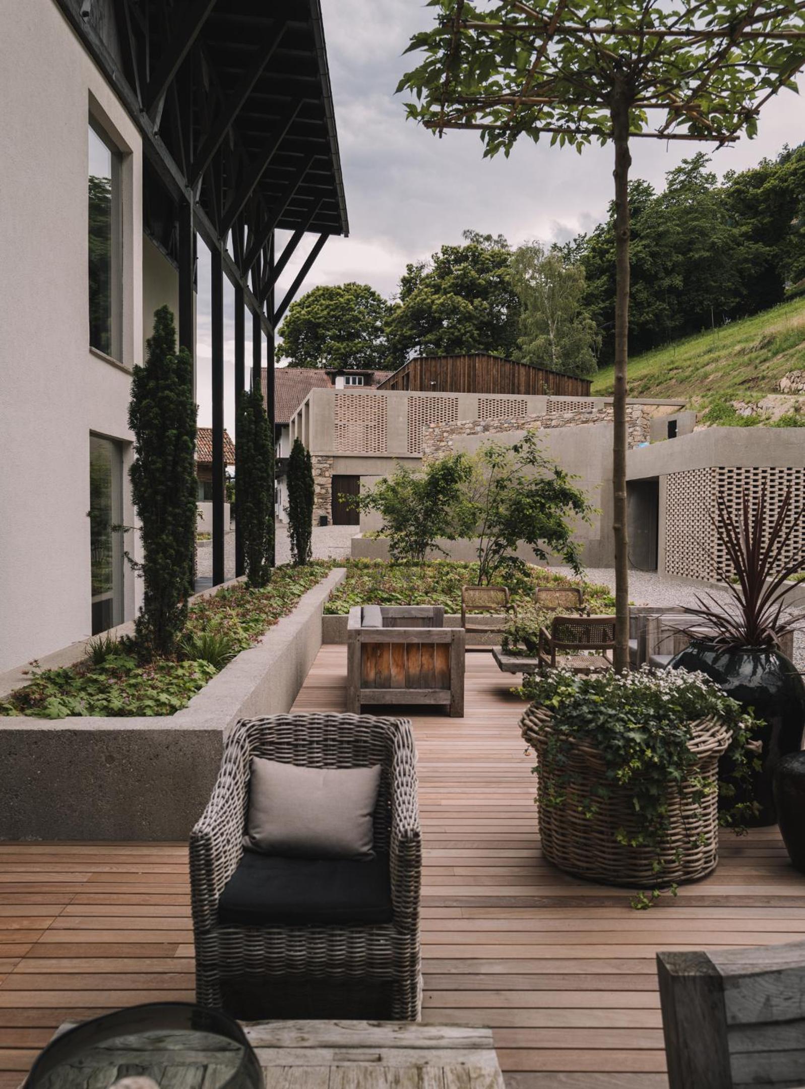 Die Panoramaterrasse mit herrlichem Blick und die Deko mit Kaminfoyer im Foyer.