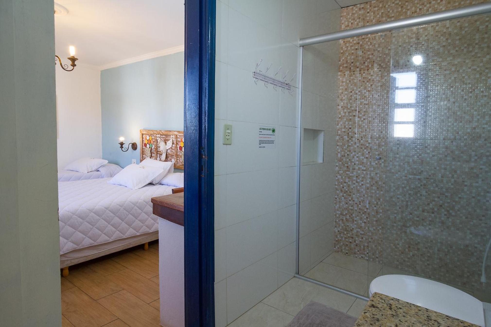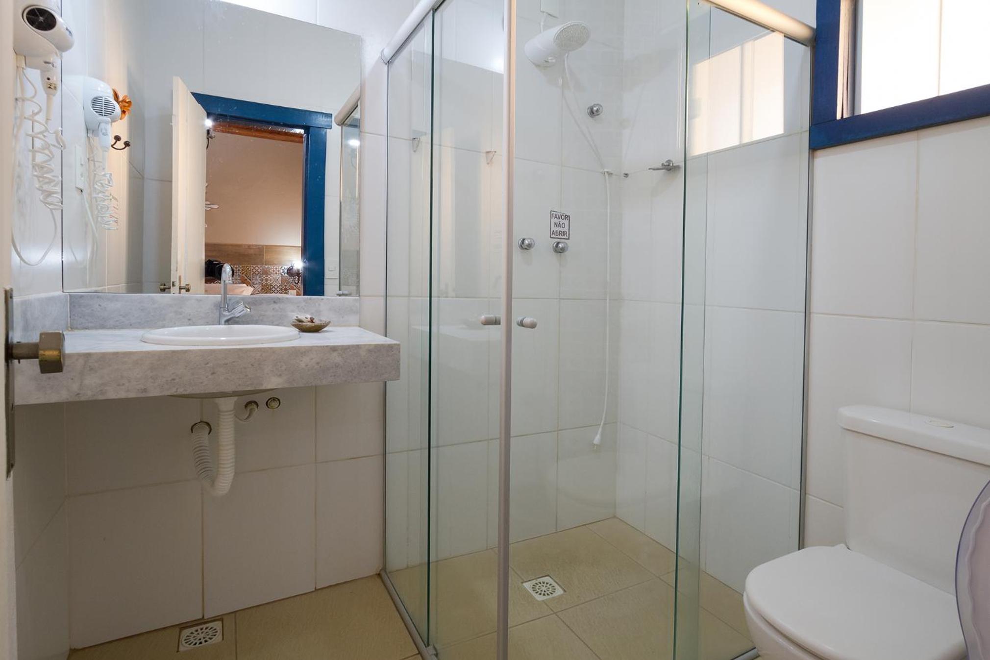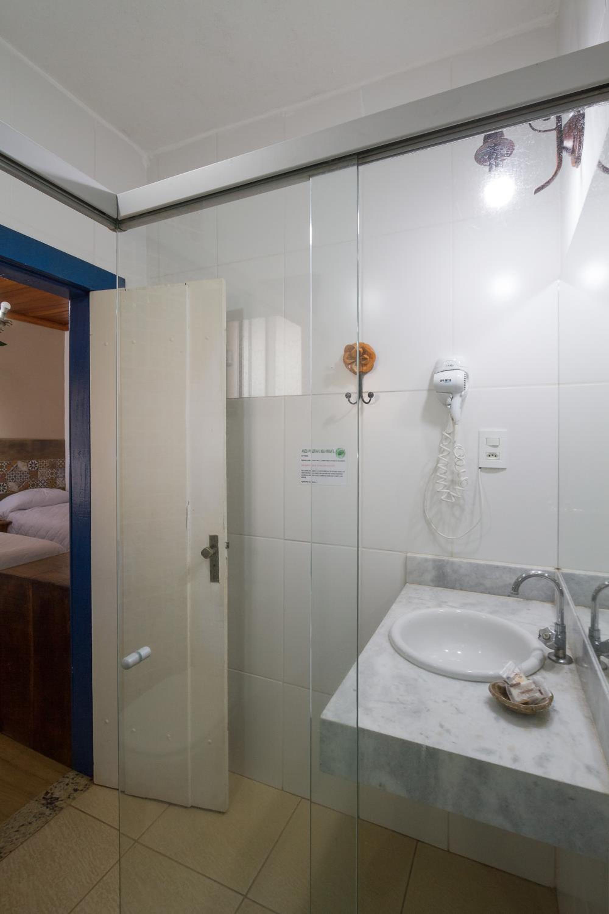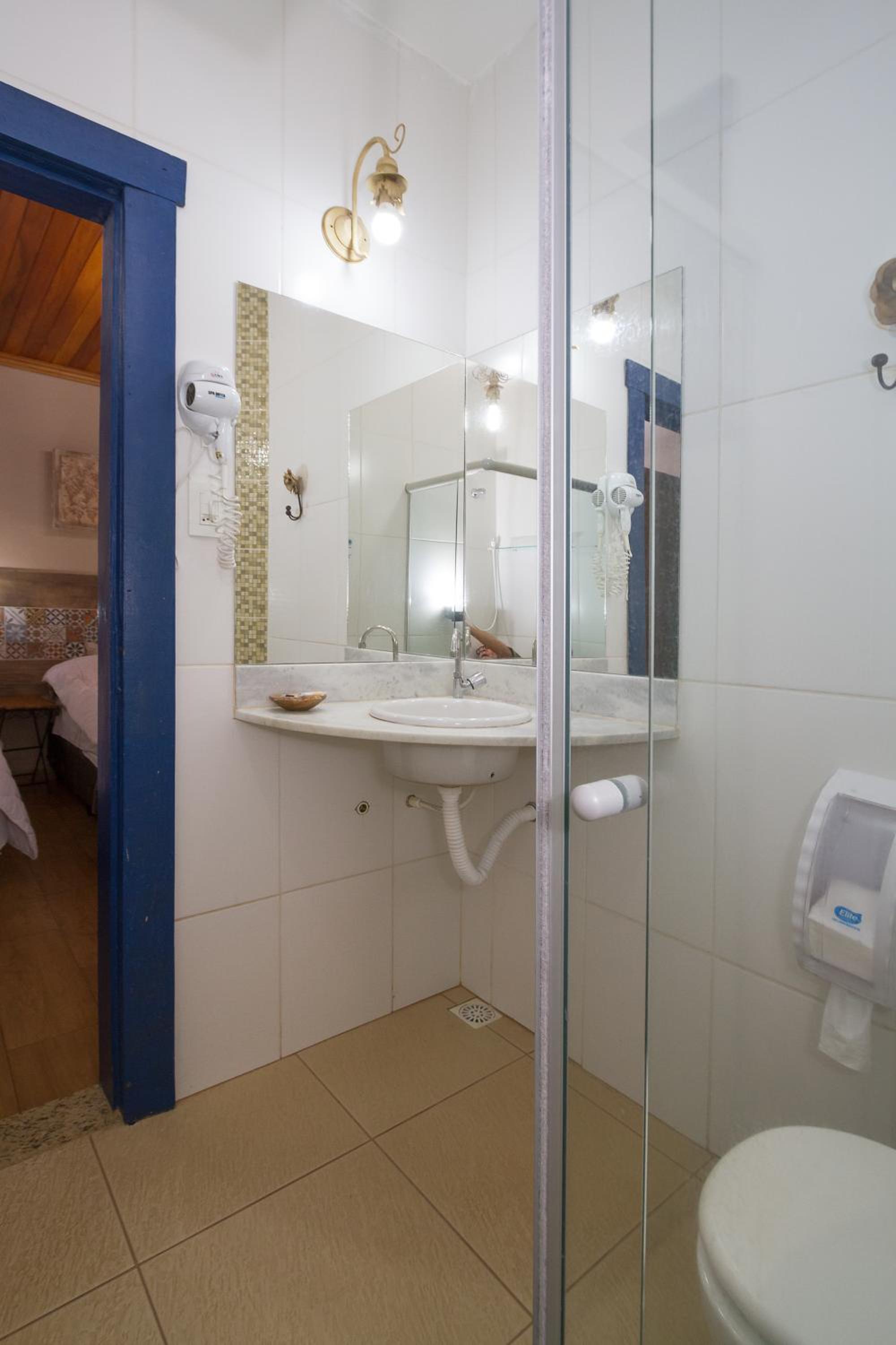 Banheiro da suíte não tem porta, tem somente uma cortina, sendo que tem uma porta de vidro transparente separando a parte da pia do restante. Algumas partes da pousada estão antigas e precisando de reformas.