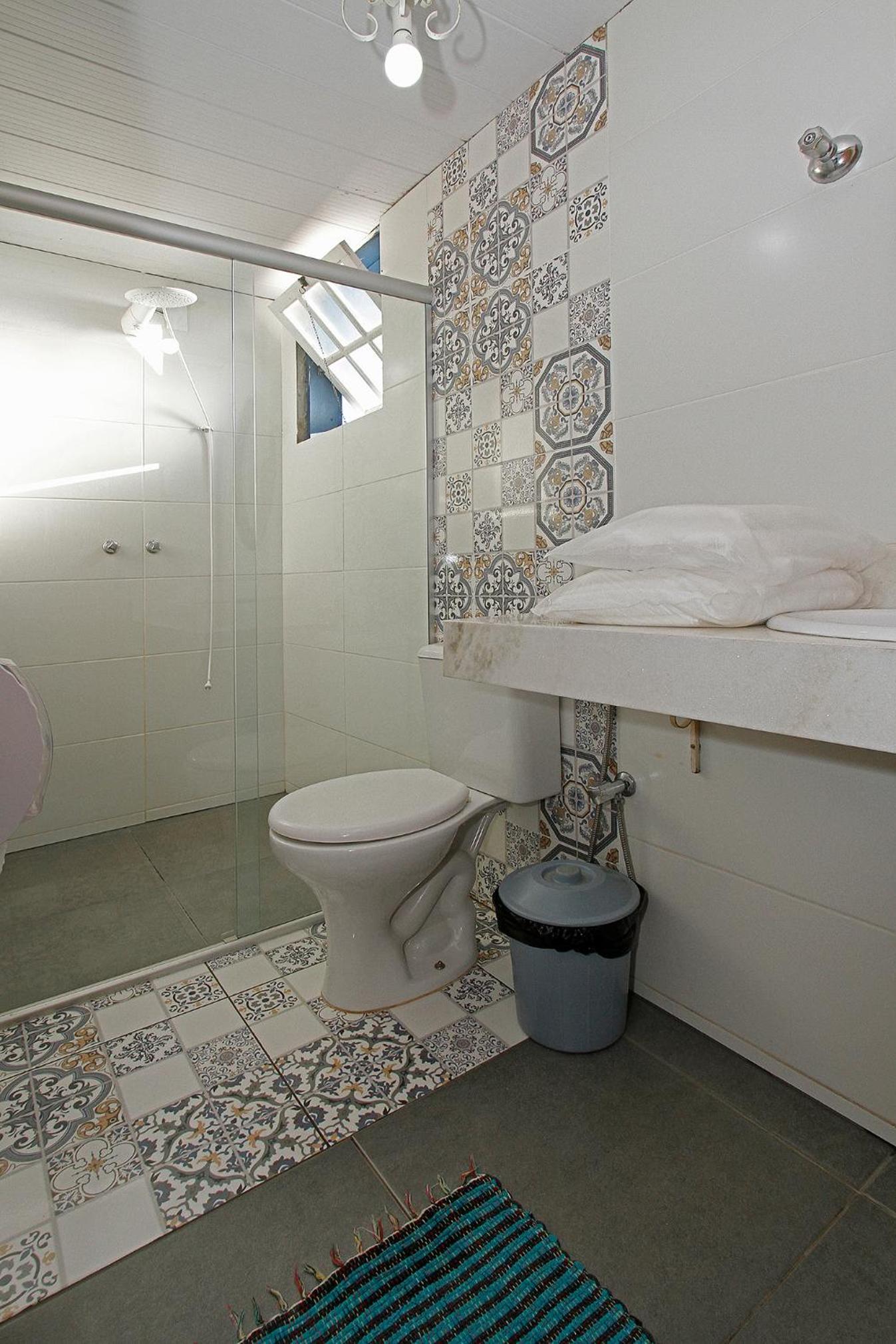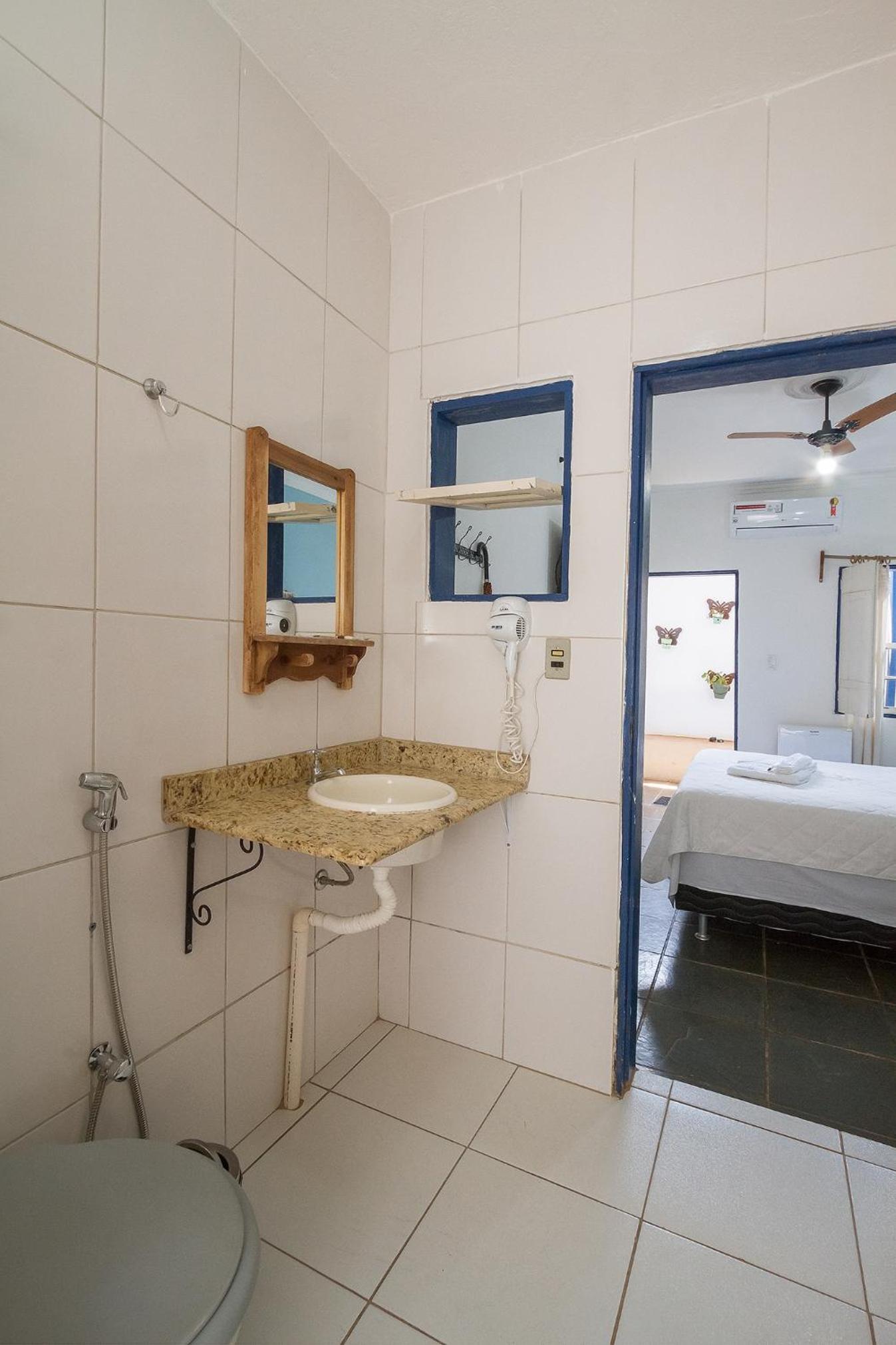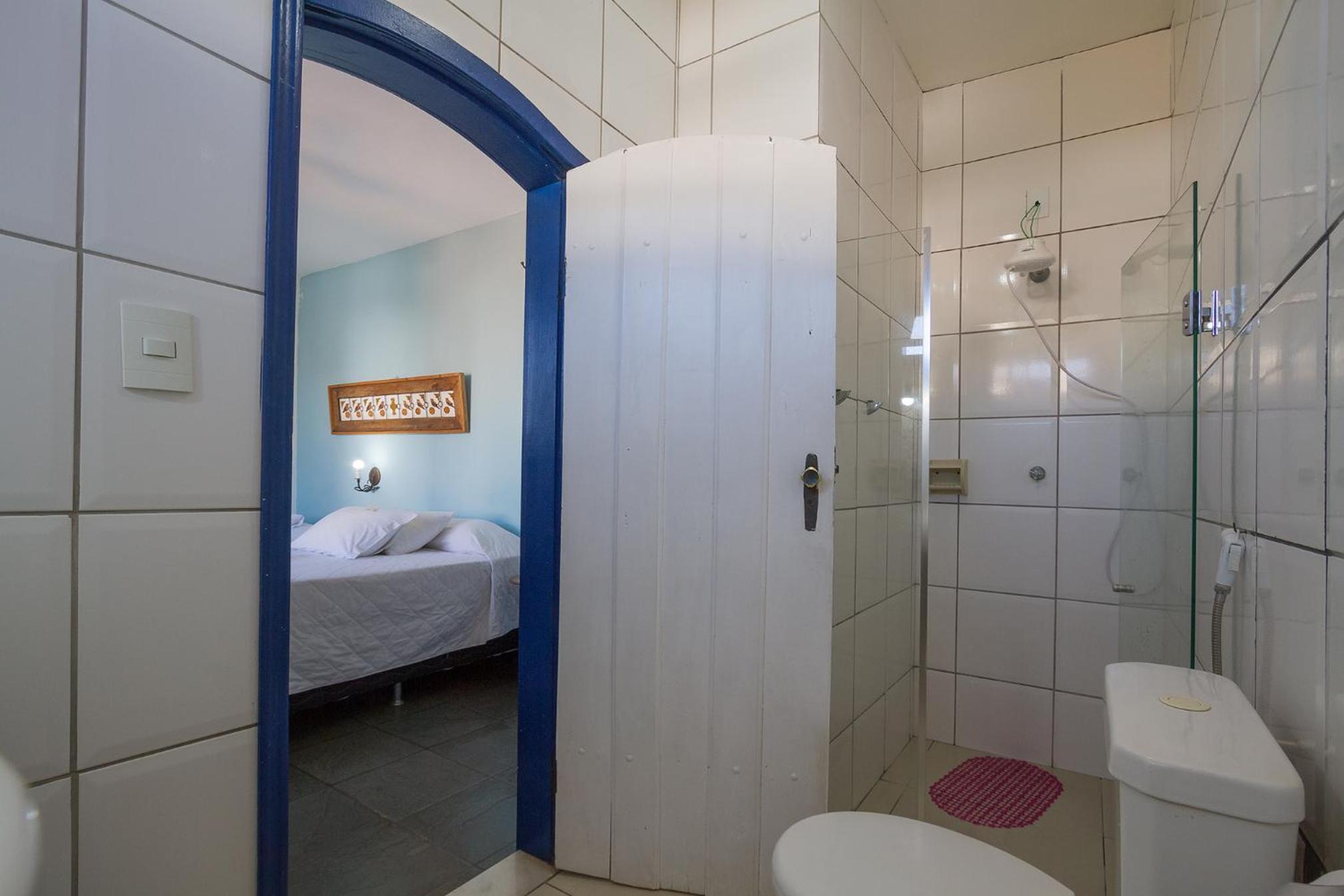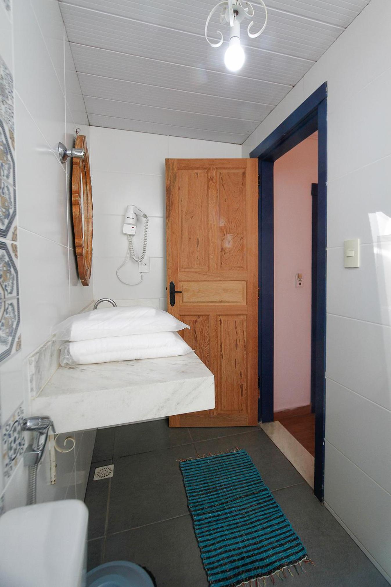 Banheiro da suíte não tem porta, tem somente uma cortina, sendo que tem uma porta de vidro transparente separando a parte da pia do restante. Algumas partes da pousada estão antigas e precisando de reformas.