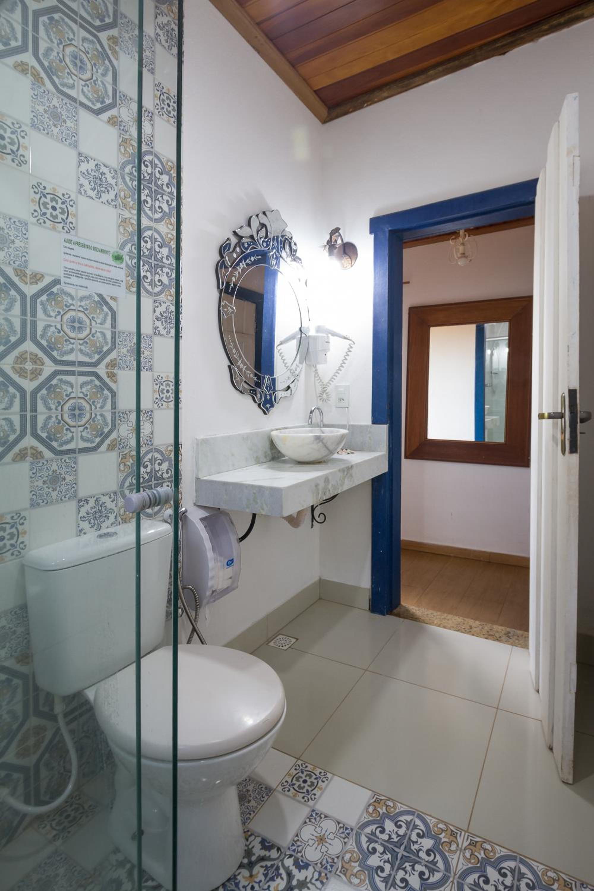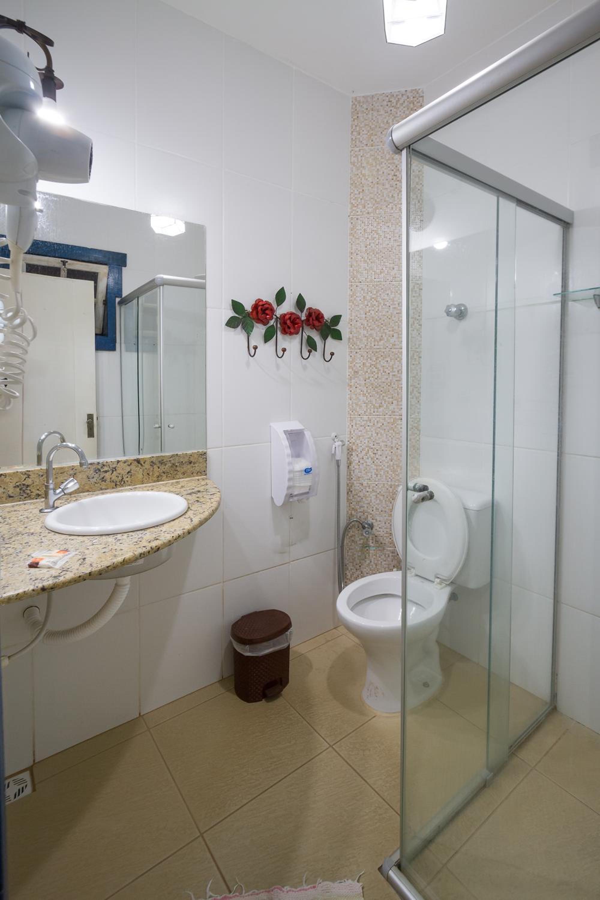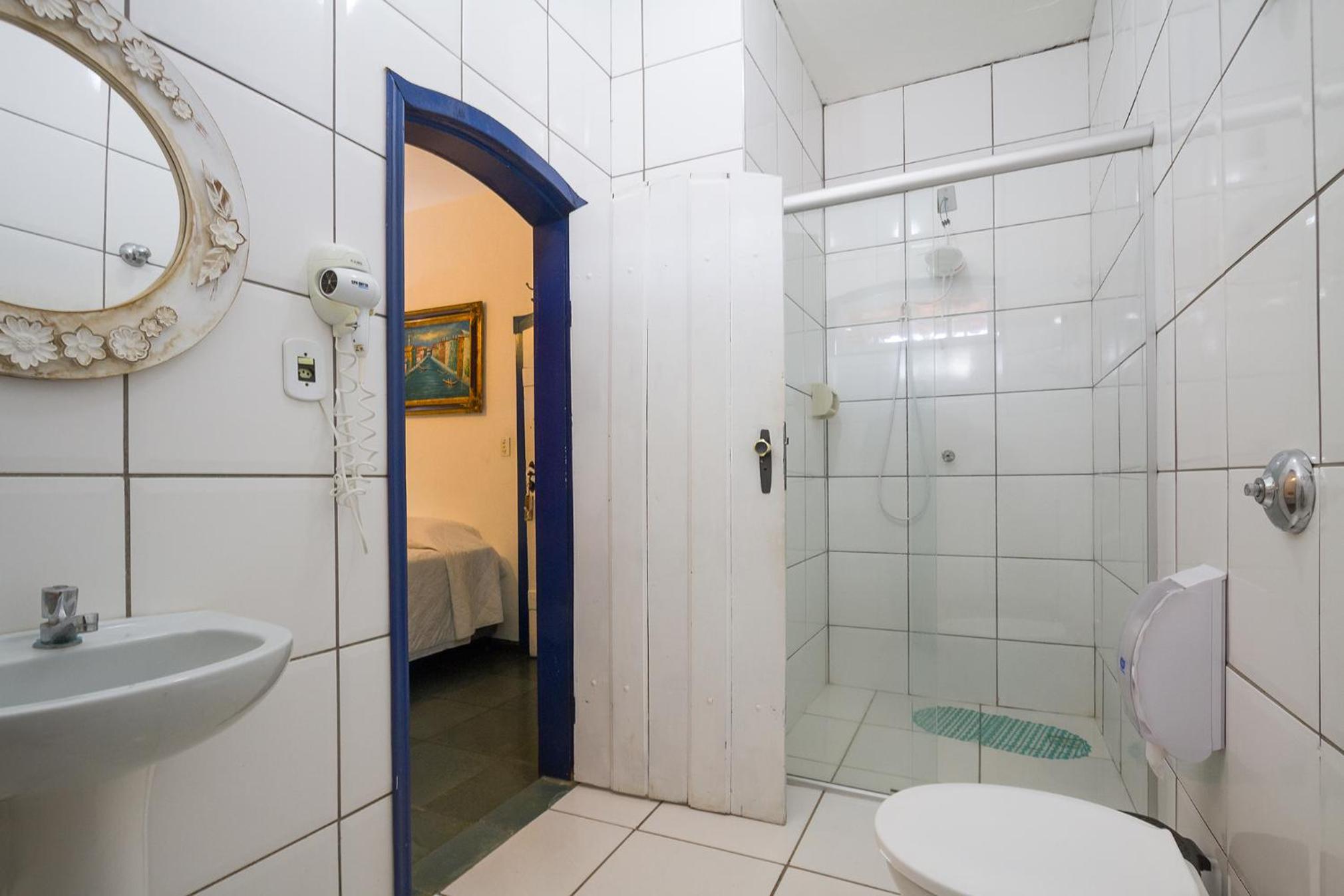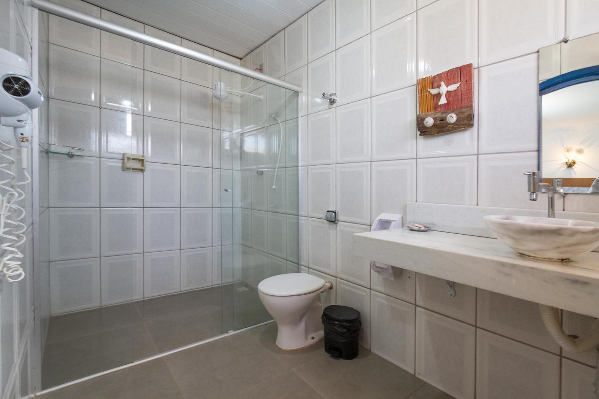 Banheiro da suíte não tem porta, tem somente uma cortina, sendo que tem uma porta de vidro transparente separando a parte da pia do restante. Algumas partes da pousada estão antigas e precisando de reformas.