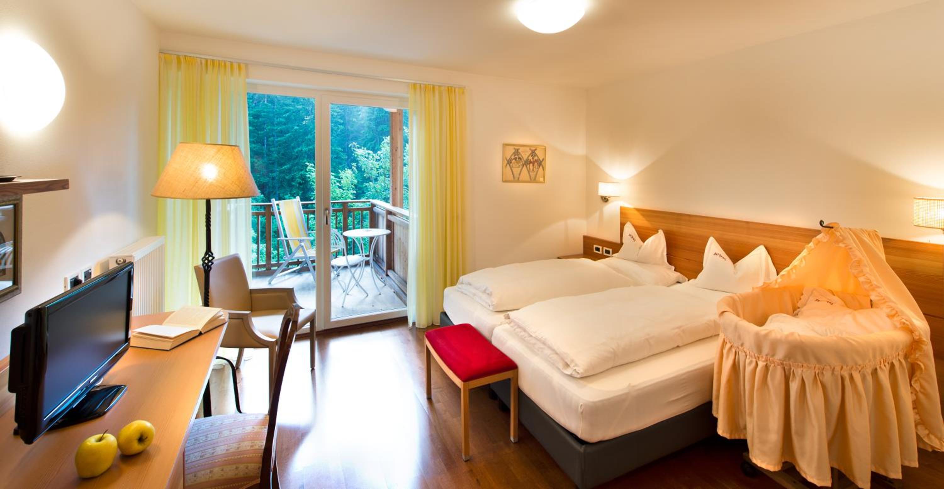 Nestled in Alpine forests at the base of Mount Sciliar, Bad Ratzes offers a serene escape just 2 km from Siusi. Indoor Pool and Family Entertainment Enjoy a refreshing dip in the indoor pool and keep the little ones entertained with free children's activities. Luxurious Rooms with Views Relax in comfort with soft bathrobes, slippers, and stunning forest or mountain views from your balcony. Culinary Delights Indulge in a delicious breakfast spread featuring fresh fruit, yogurt, and local specialties. In the evenings, savor a blend of local and Mediterranean flavors at the hotel restaurant. Book now for an unforgettable Alpine getaway at Bad Ratzes!