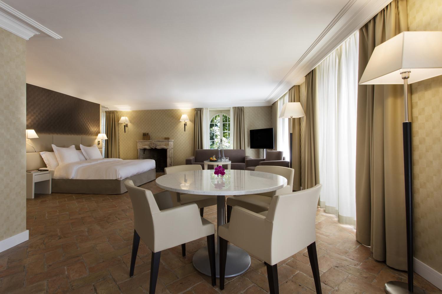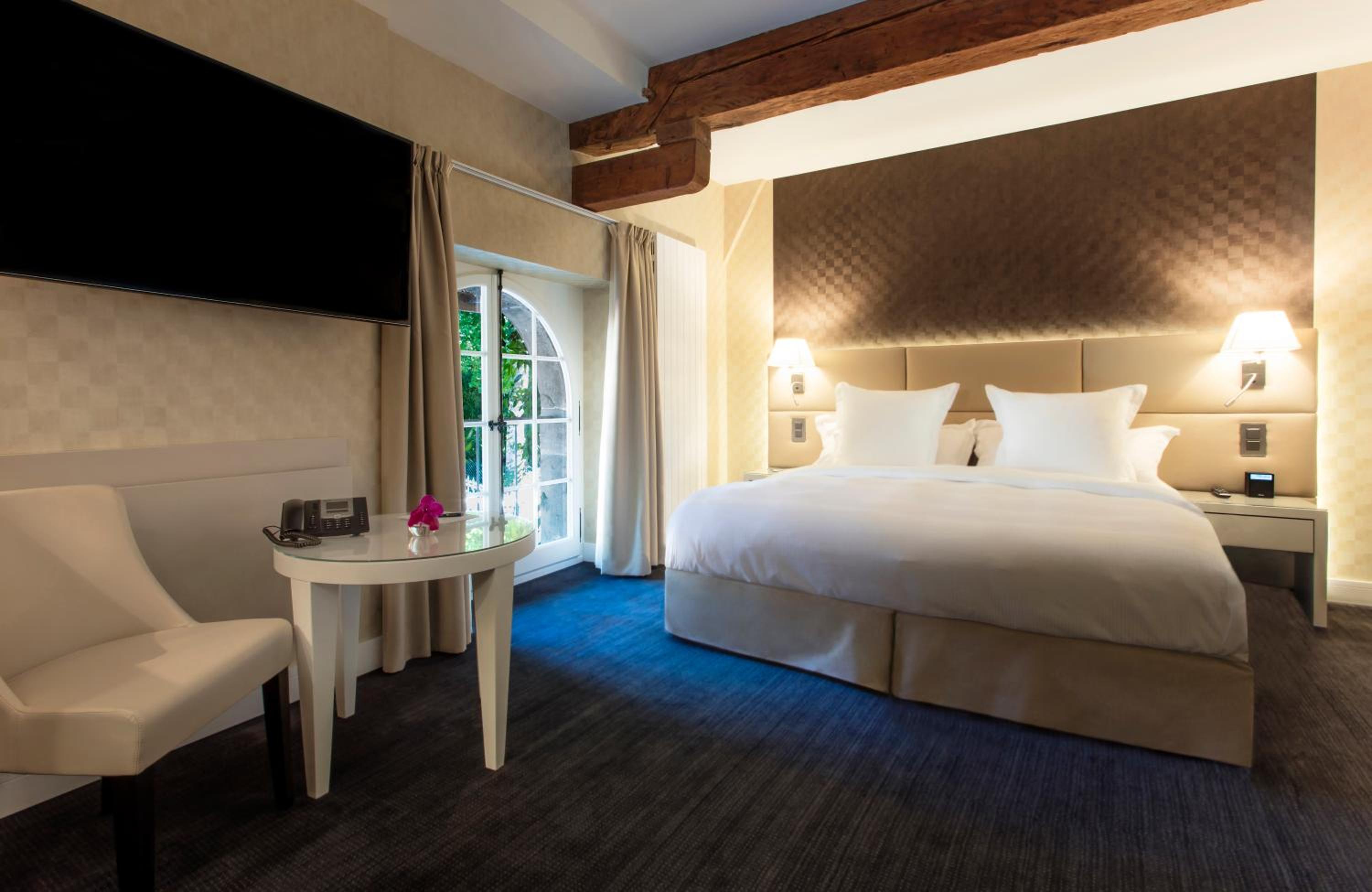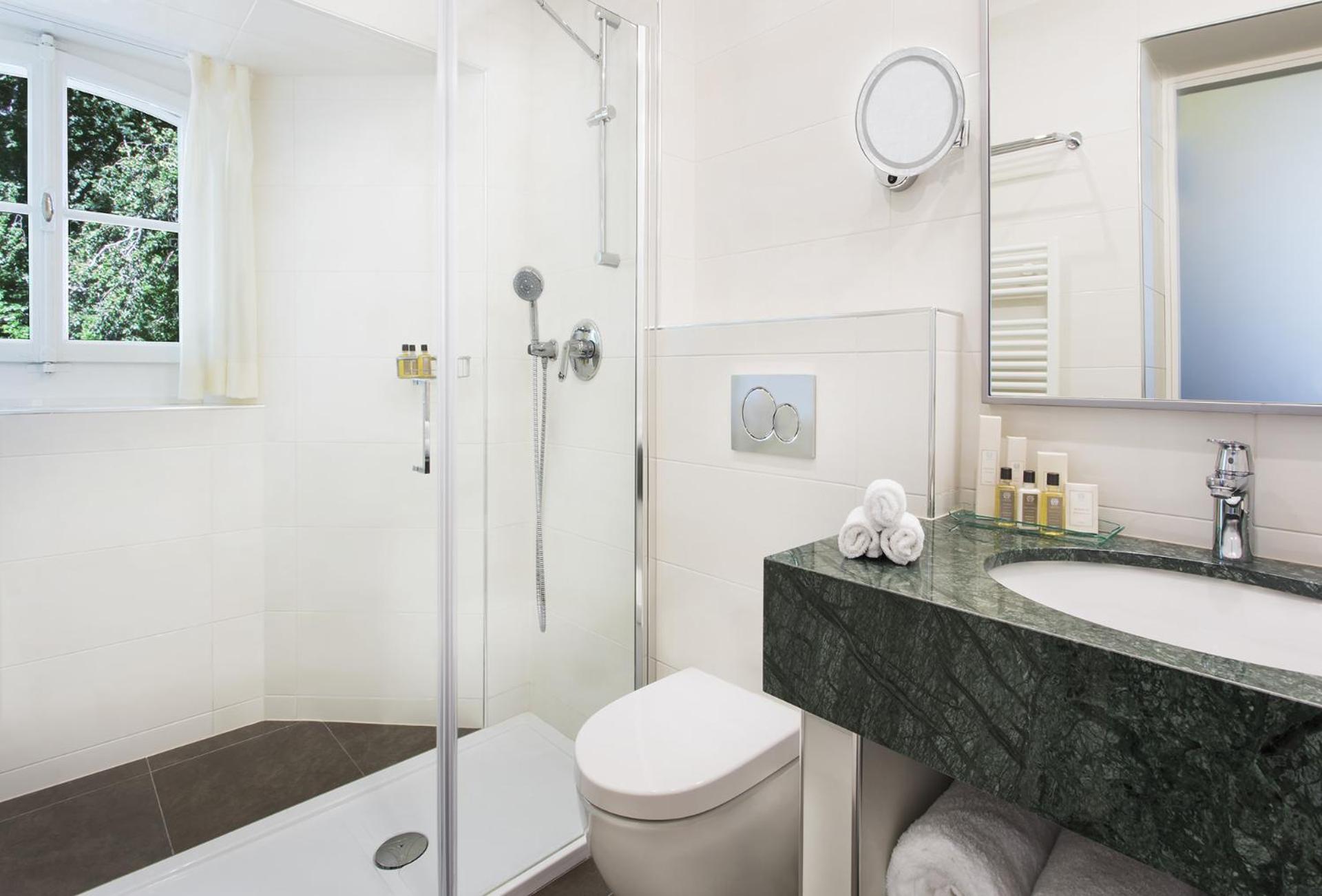 Indulge in our spacious and elegant rooms at Château de Bonmont, complete with luxurious amenities such as a plasma TV, goose down duvets and pillows, and a well-equipped bathroom with premium toiletries.