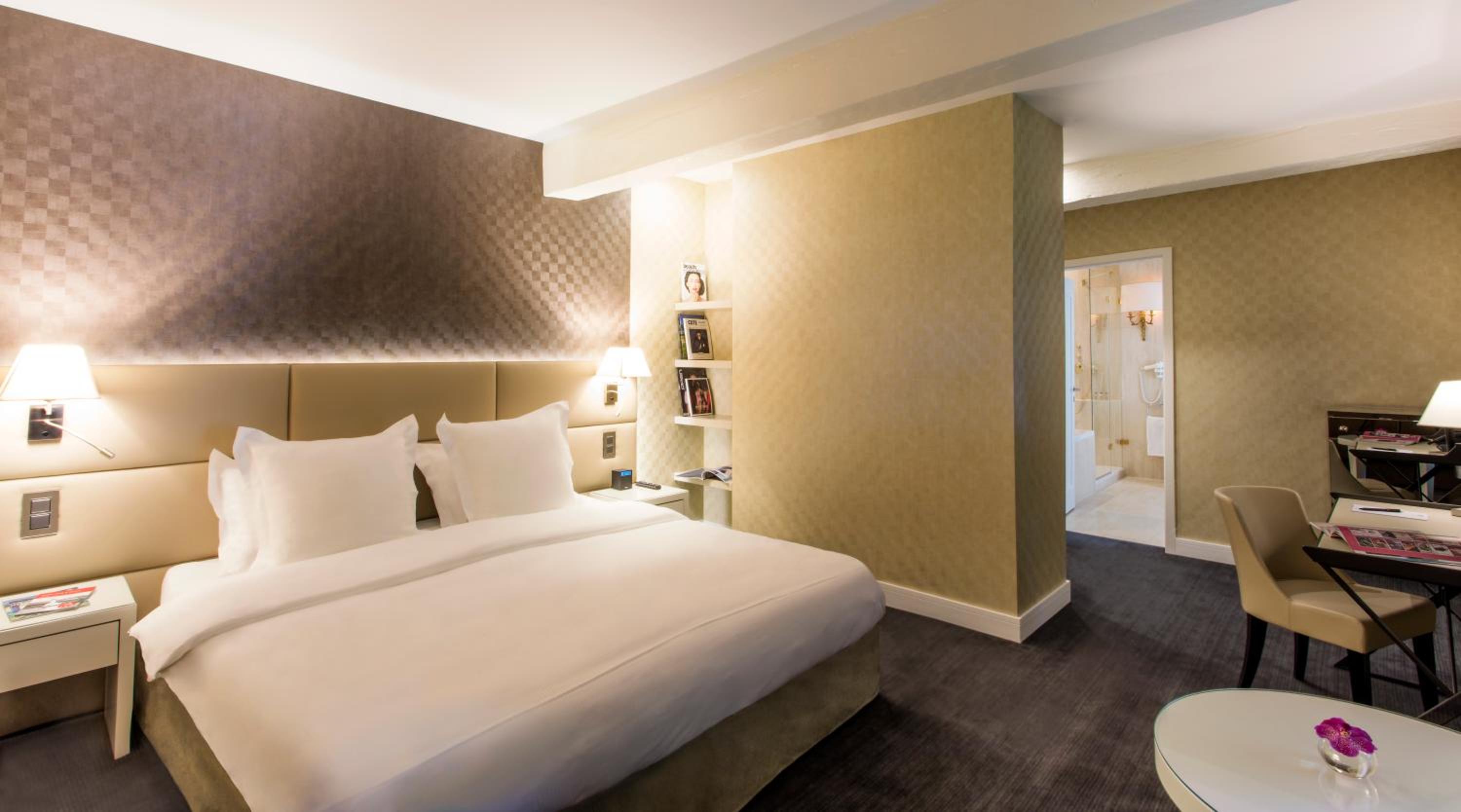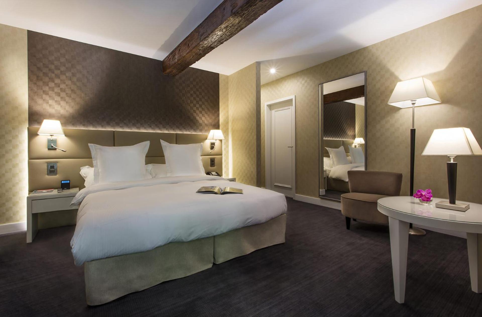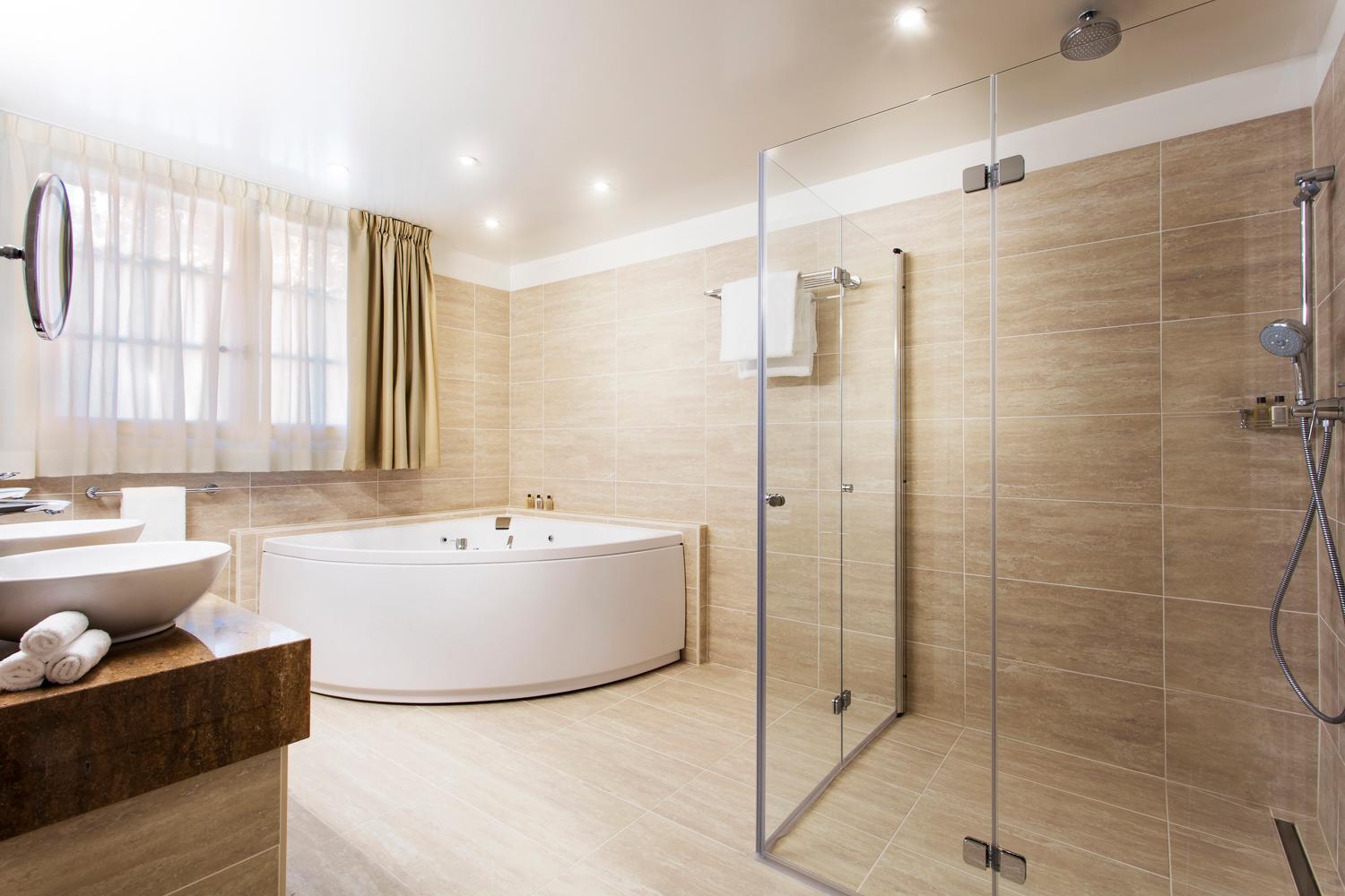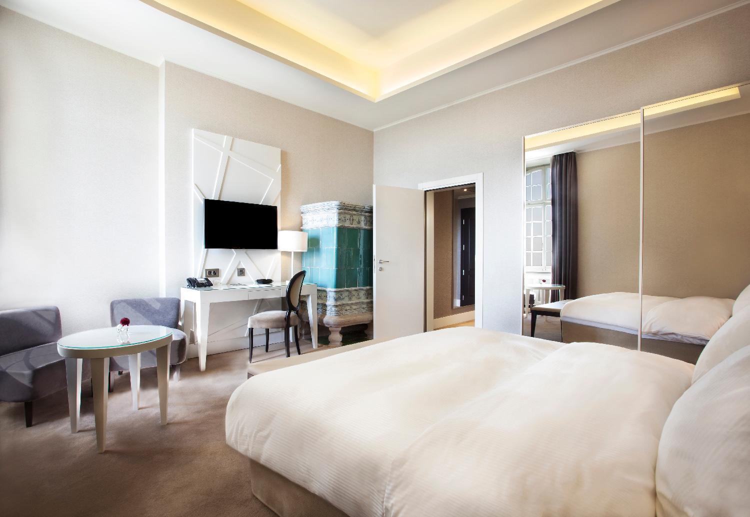 Indulge in our spacious and elegant rooms at Château de Bonmont, complete with luxurious amenities such as a plasma TV, goose down duvets and pillows, and a well-equipped bathroom with premium toiletries.
