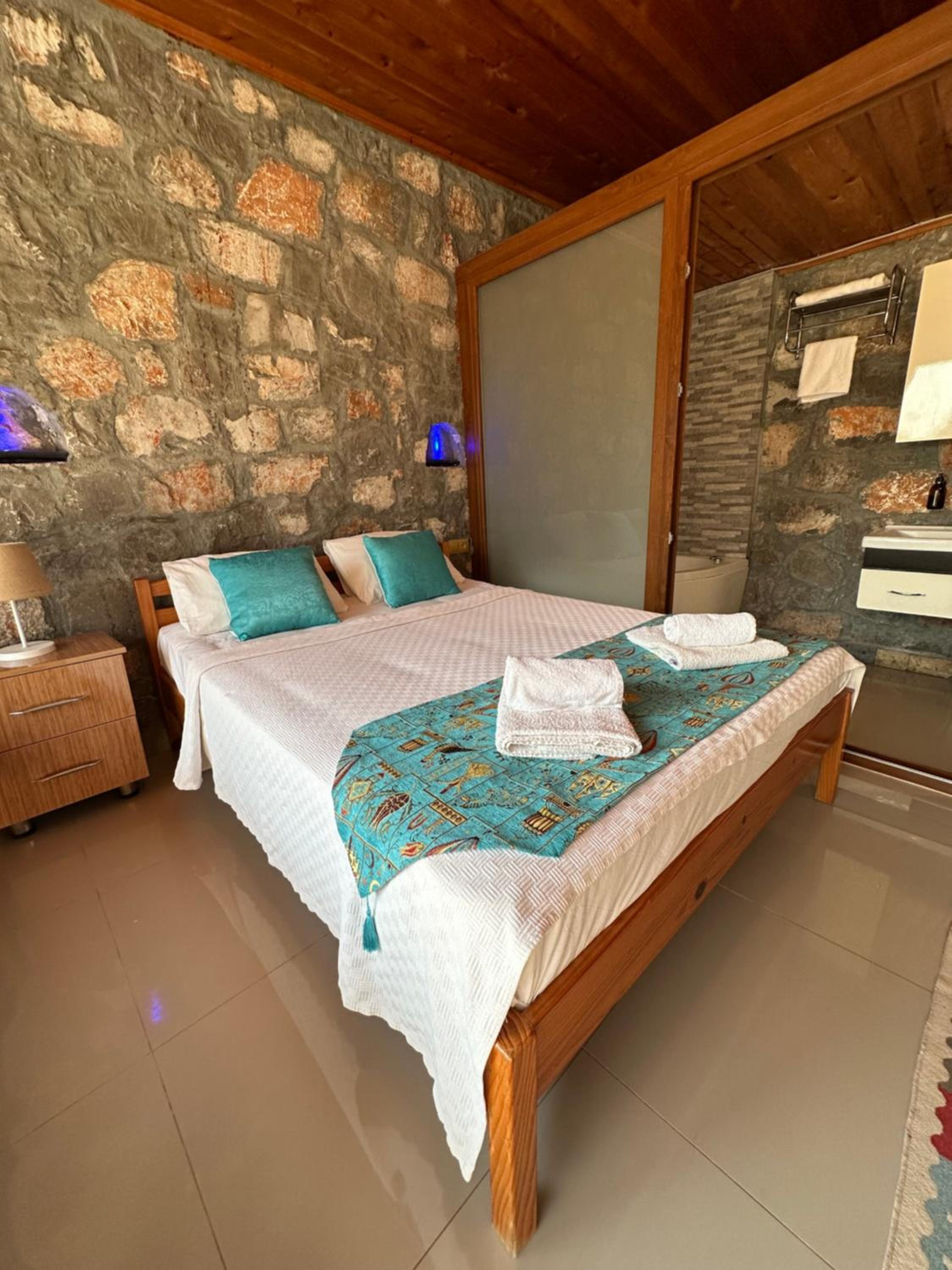 Kabak Armes Hotel in Faralya offers a blend of modern comfort and natural beauty. Certain units boast spa baths, spacious terraces, and stunning sea or mountain views. Relax in rooms crafted with natural Gocek stone or unwind in private garden lounges.