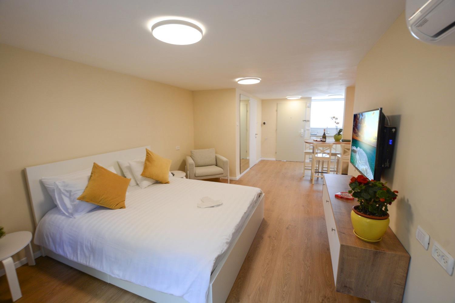 Modern Amenities: Enjoy a comfortable stay at Rothschild Luxury Suite Haifa, equipped with a flat-screen TV and a fully equipped kitchen in every unit, some even featuring a dining area and balcony.