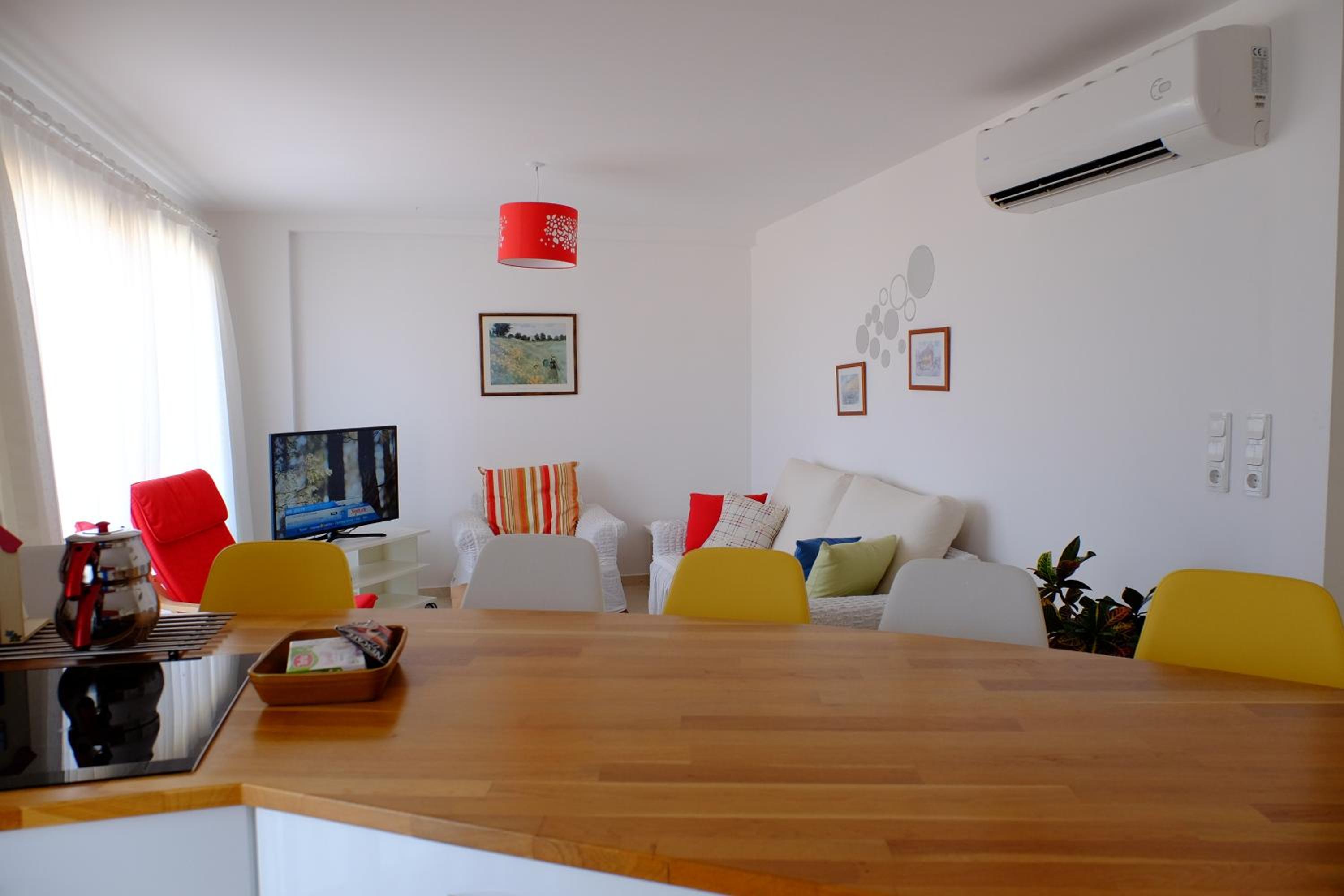 Cozy Accommodation: Unwind in a well-equipped apartment complete with a flat-screen TV, air conditioning, and a private bathroom with a shower and hairdryer. Wake up to picturesque sea and mountain views right from your room.
