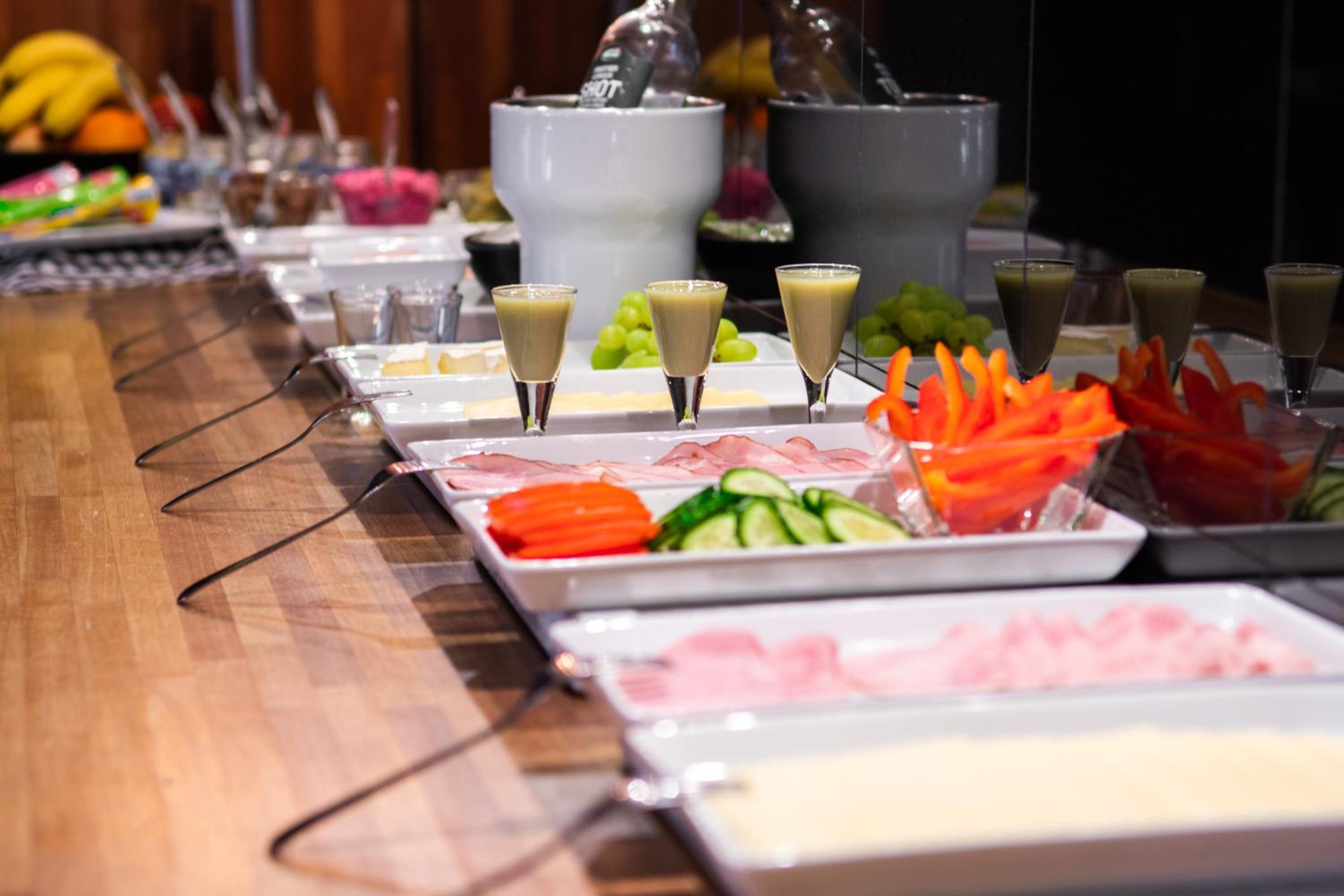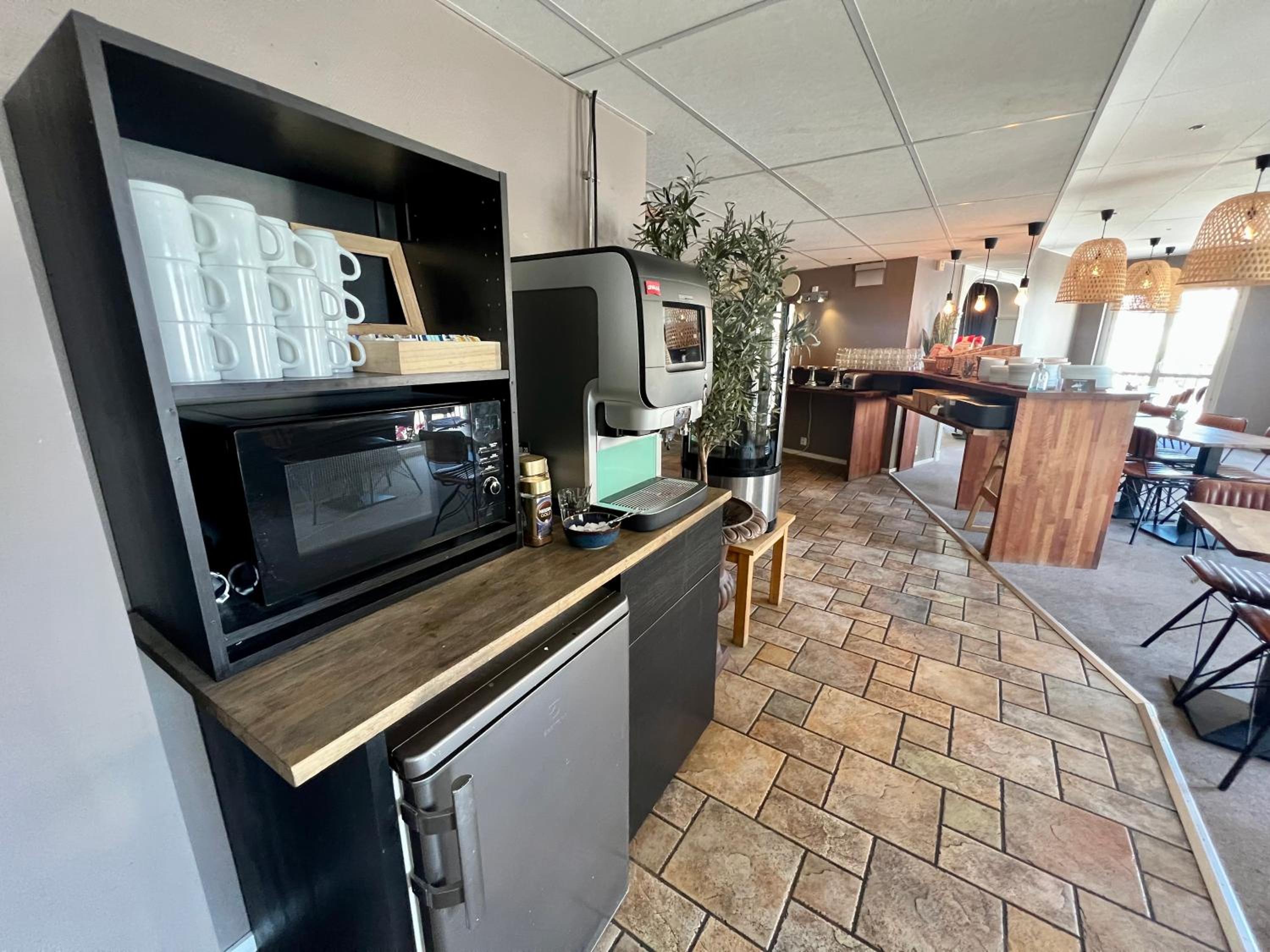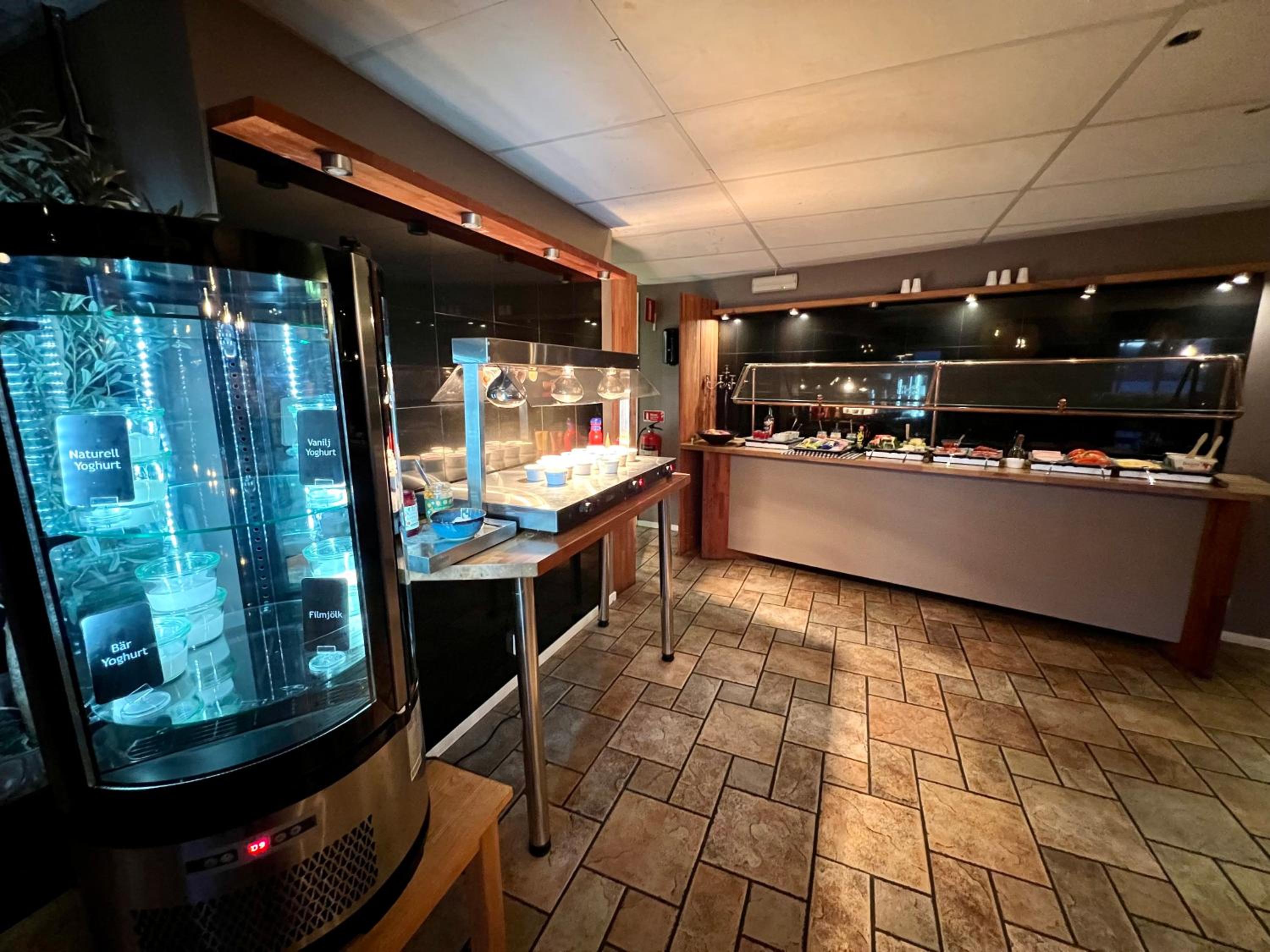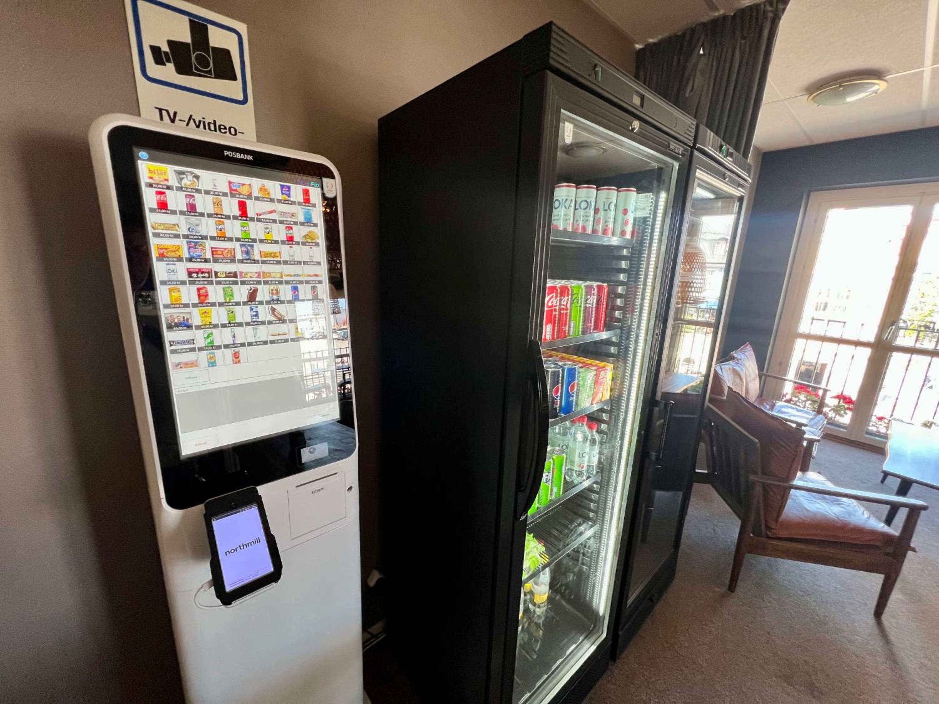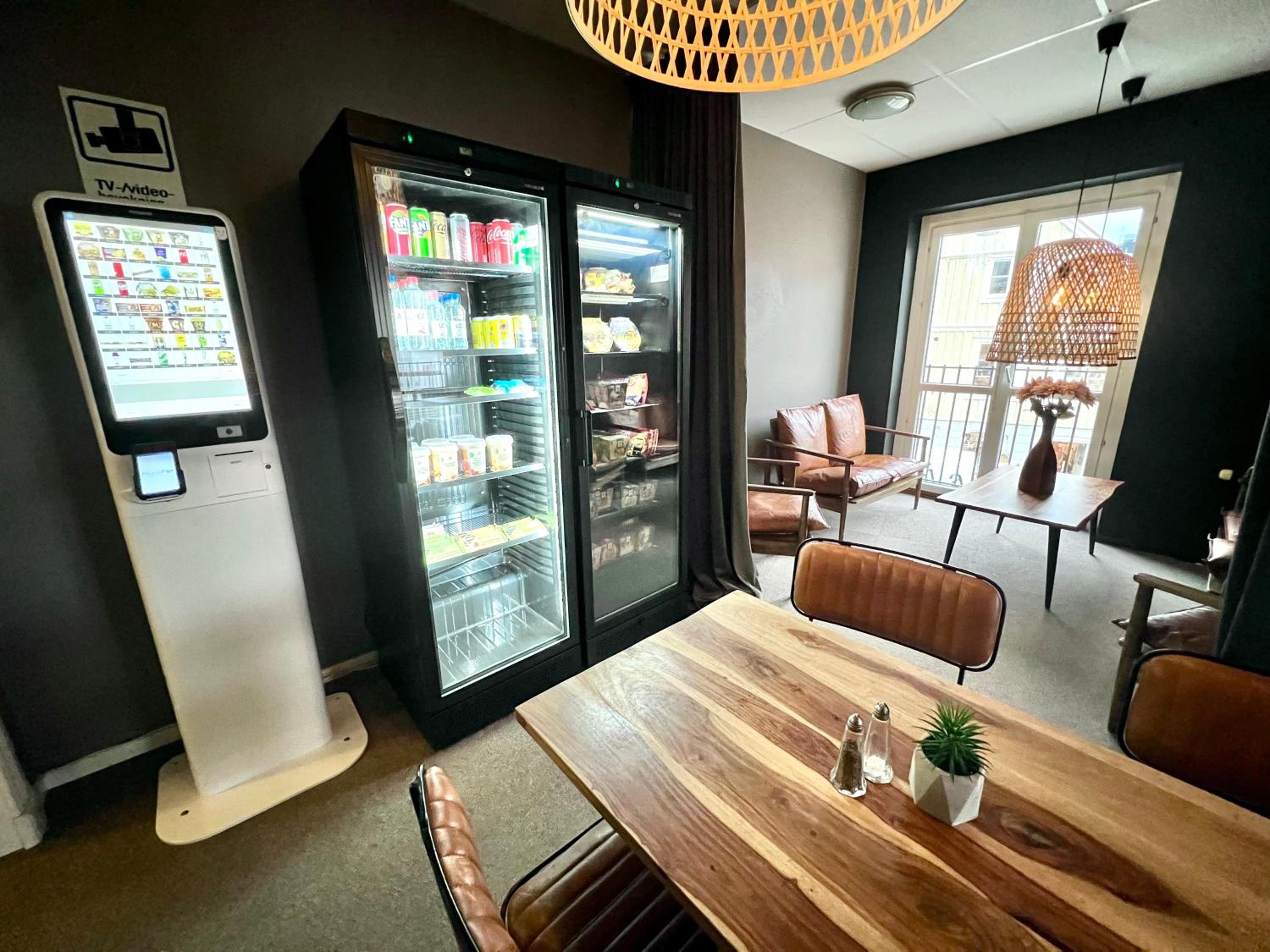 Self-service snacks (including microwave meals) and drinks in lobby at grocery store prices. Self check-in was fast and easy. Location central - walking distance to everything. Great breakfast with lots of hot and cold options. Very comfortable beds.