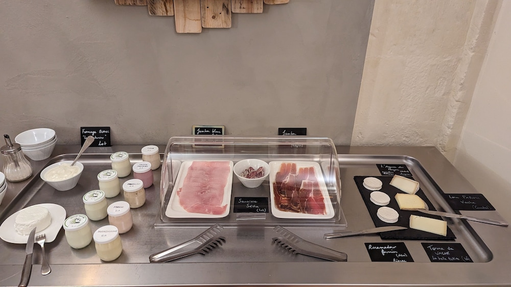 Lovely and charming hotel on a very quiet and leafy corner of medieval Figeac. Very warm welcome from the owner Marion. Large modern room. With both air cooling tower AND air conditioner…oh so important during these 30+ degree days and nights.